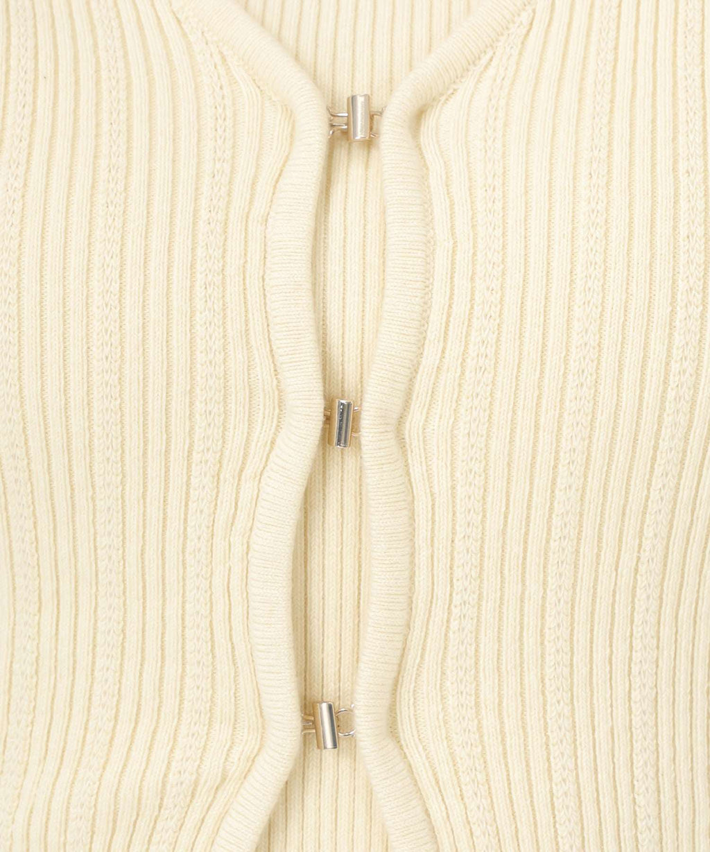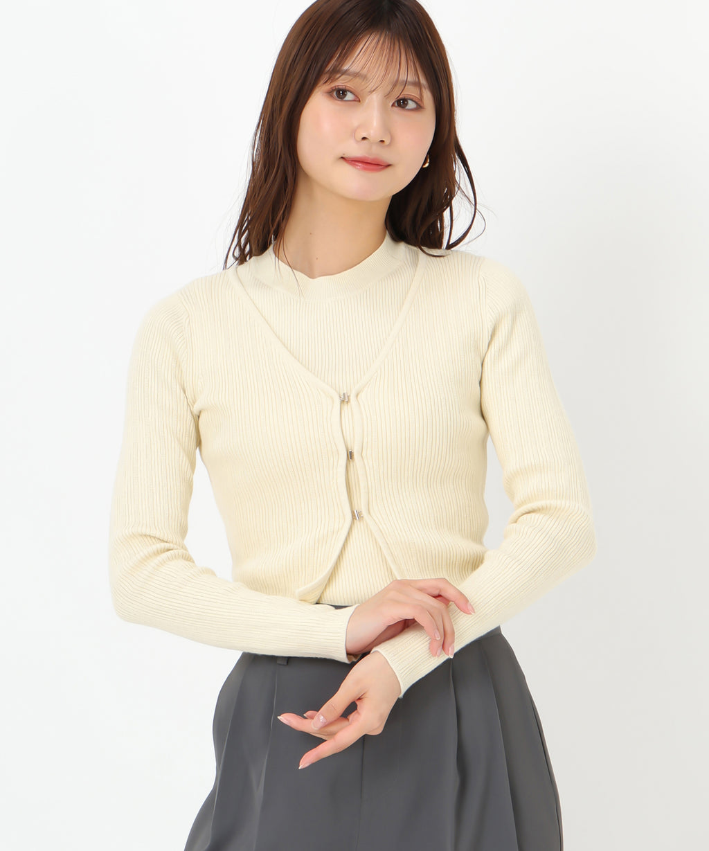 ノースリーブのニットと金ホックをあしらったカーディガンのアンサンブル。