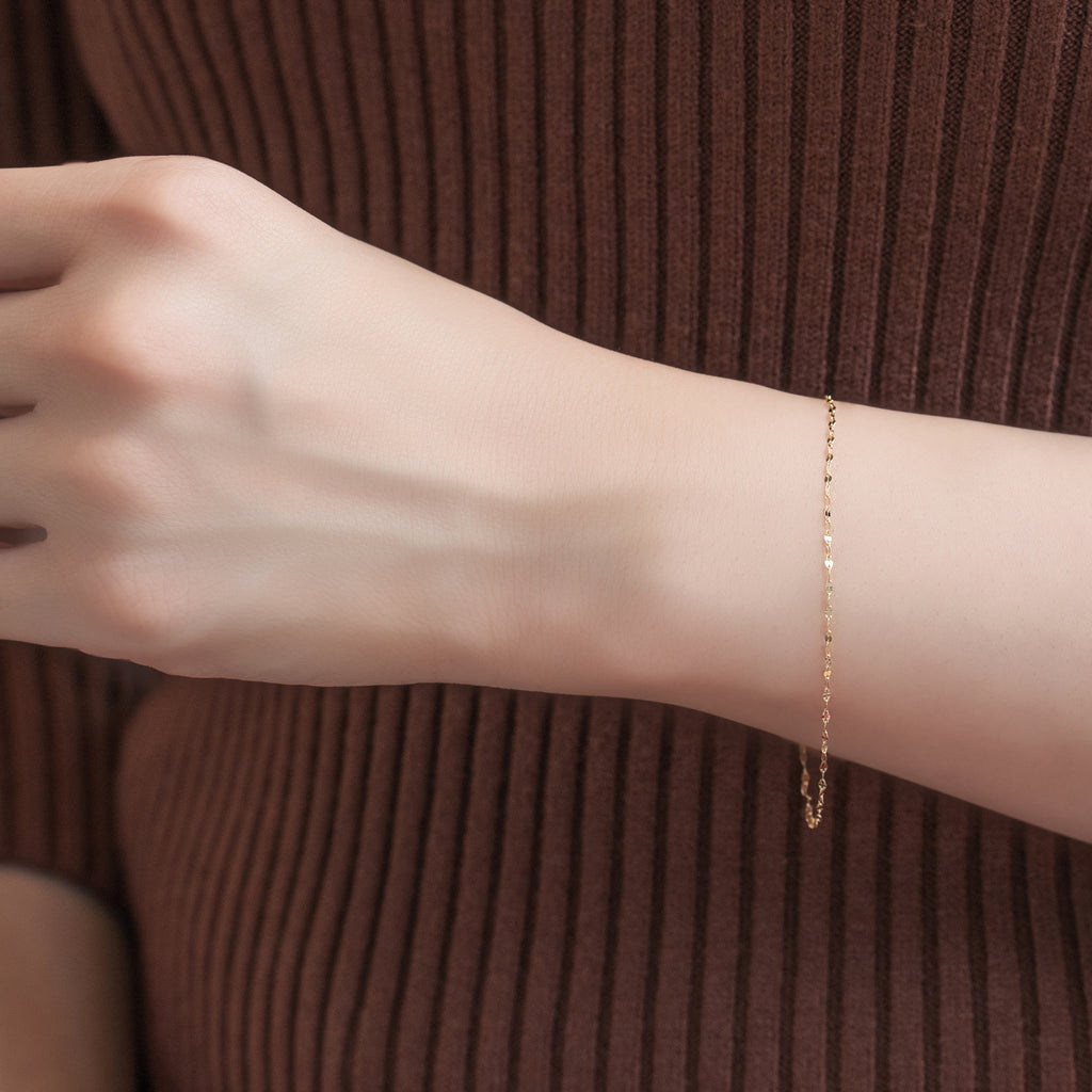 煌びやかなチェーンジュエリーは、首筋や手首に柔らかく寄り添いラインを美しく見せる繊細さなのでフォーマルなシーンにもマッチするまさに万能アイテム。
