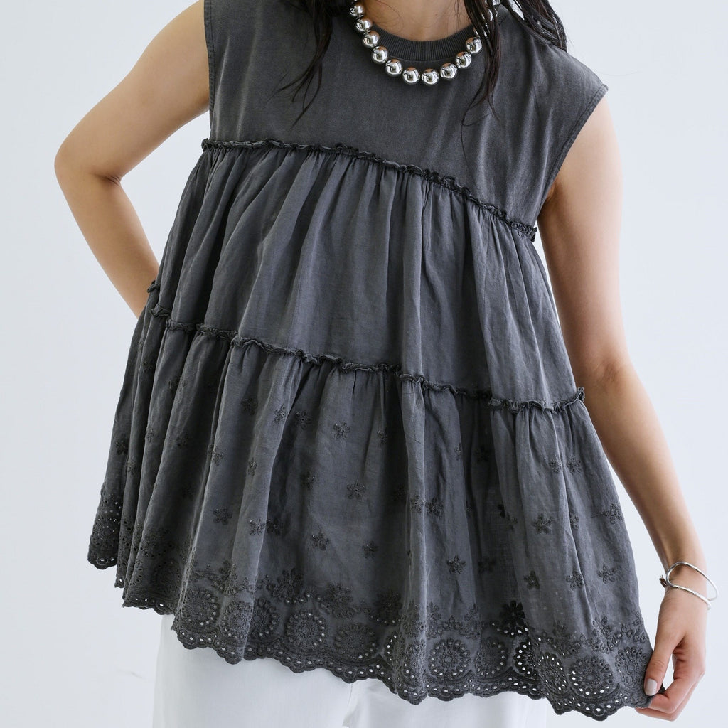 洗練されたノースリーブデザインがモード感を引き立てる一枚。