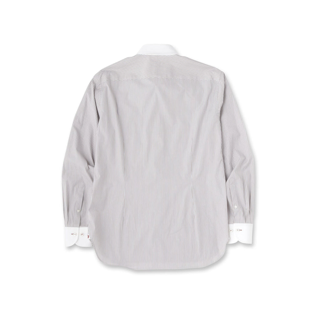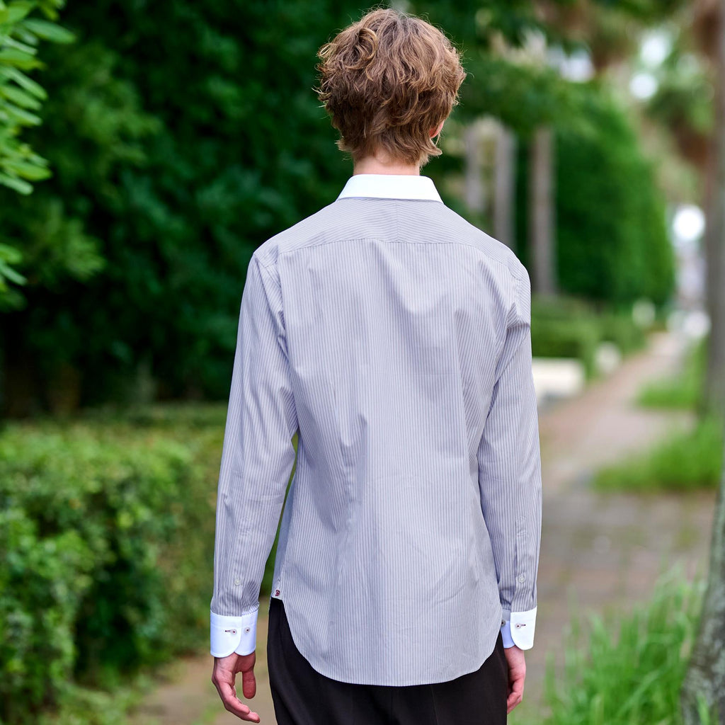 衿とカフスには同素材のホワイト生地を使用したクレリック仕様。