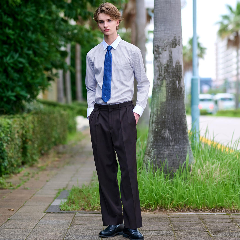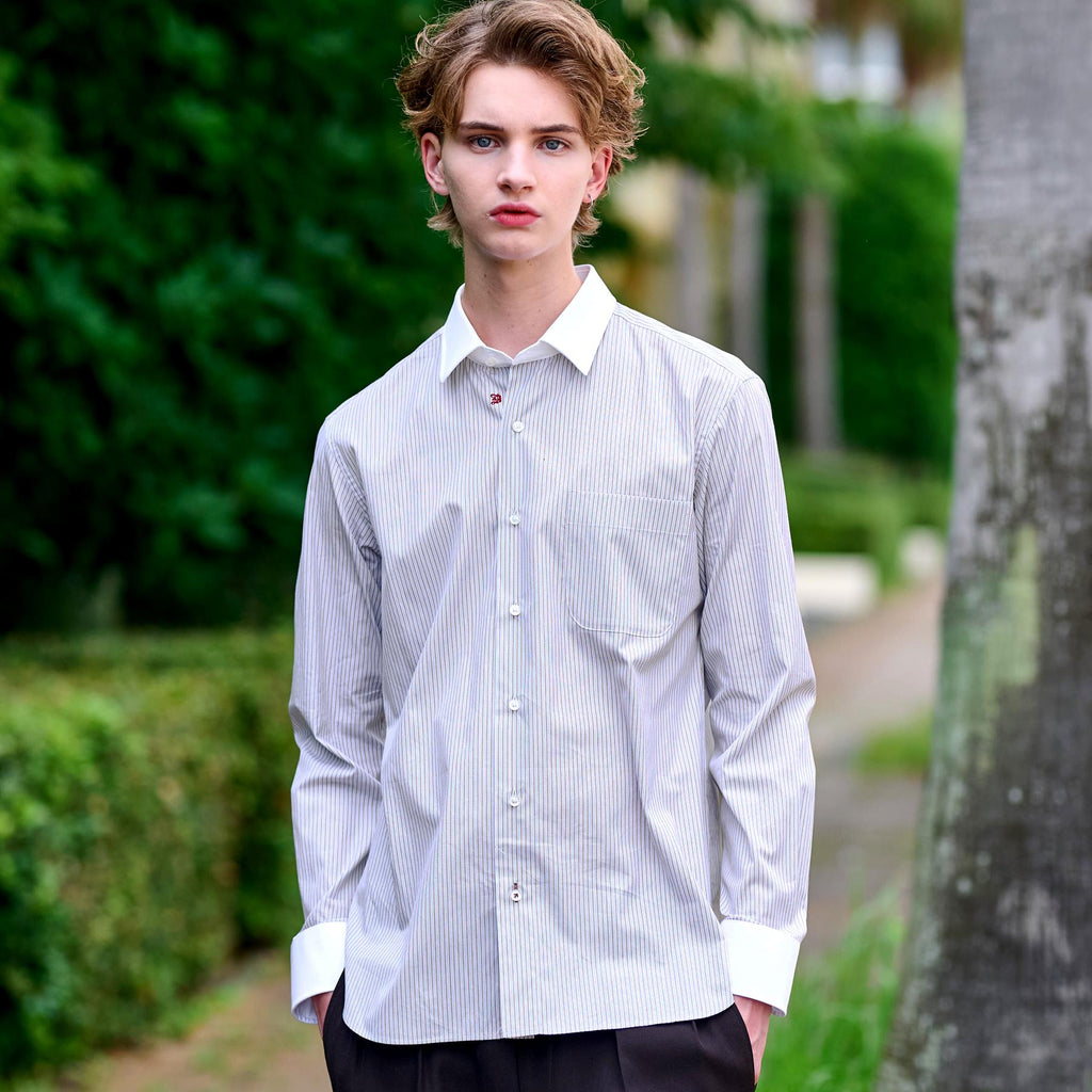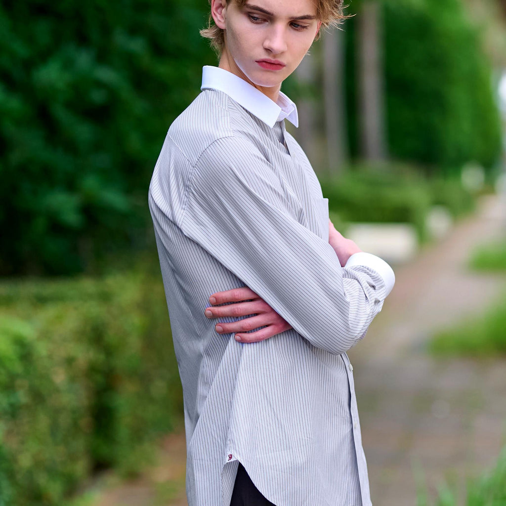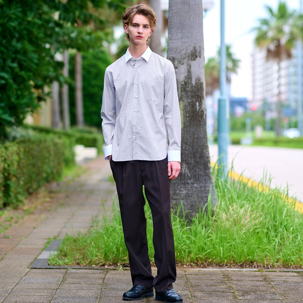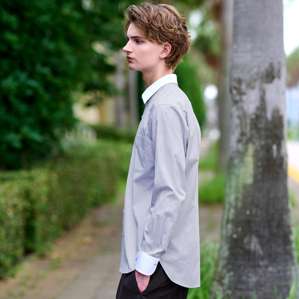 衿はロールを抑えた設計で、タイドアップはもちろん、ボタンを開けて着ても上品で清潔感のある印象を保ちます。