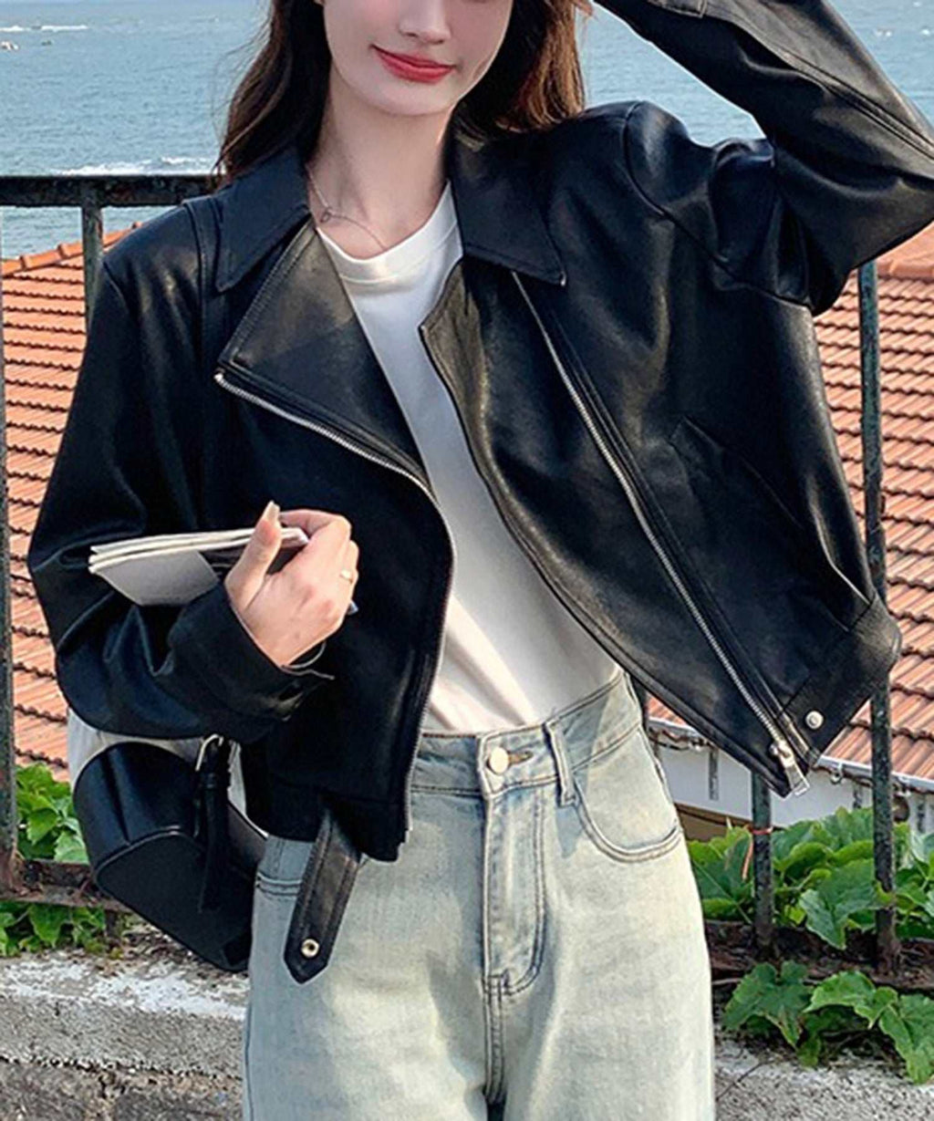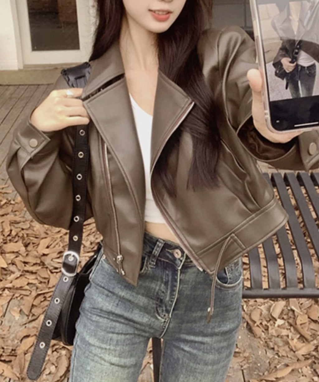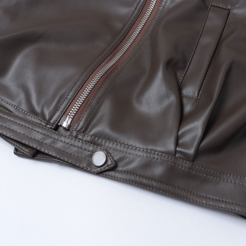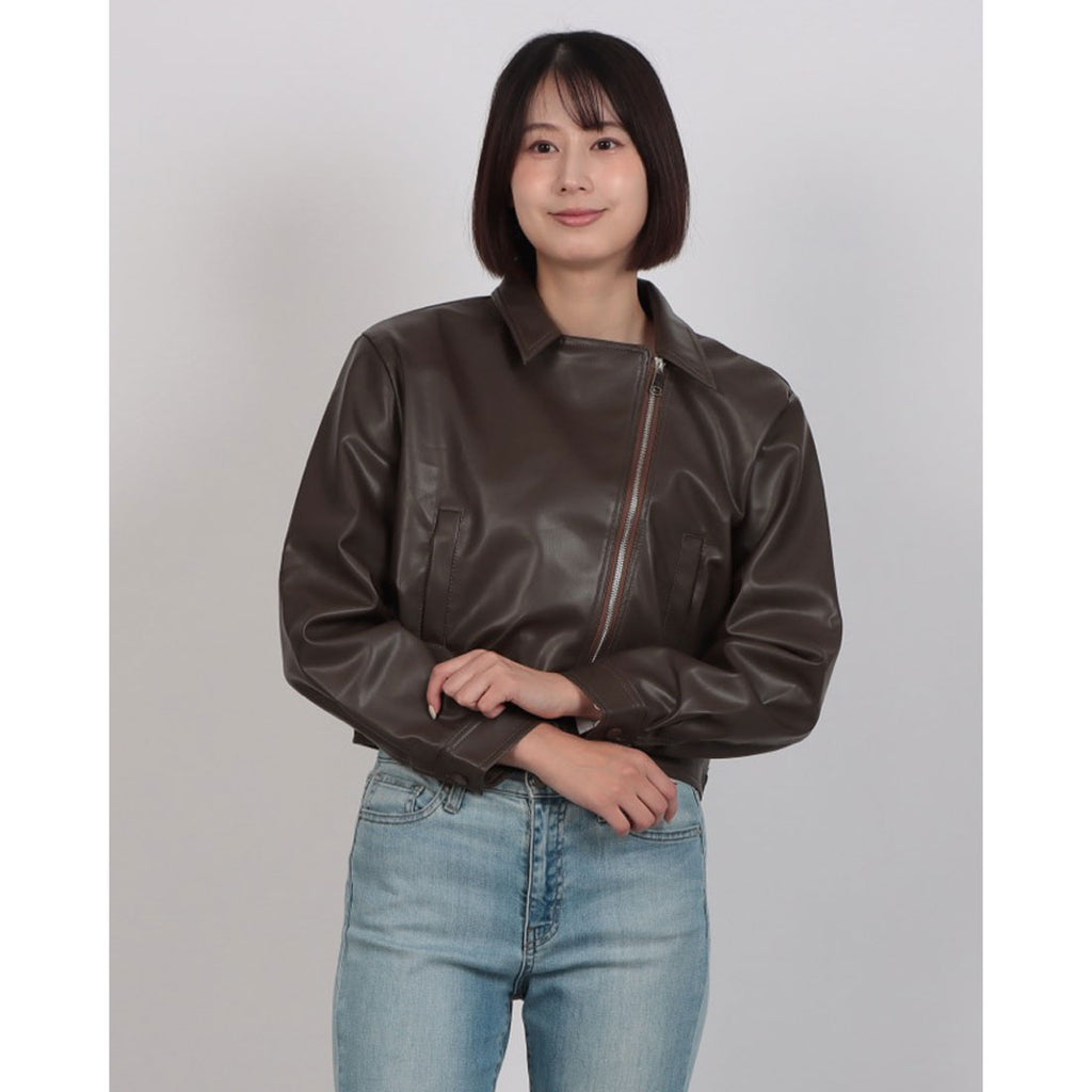 クラシックなライダースジャケットのデザインに、ショート丈がアクセントとなり、スタイルに抜け感を加えます。