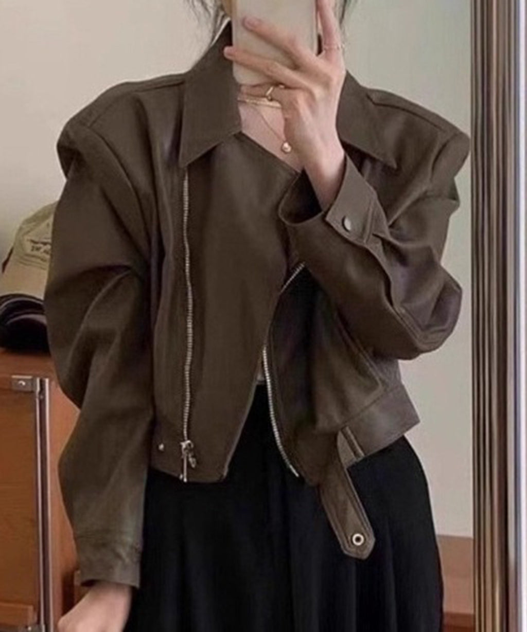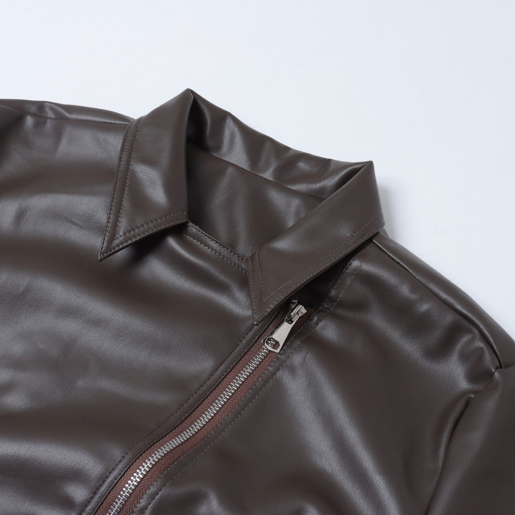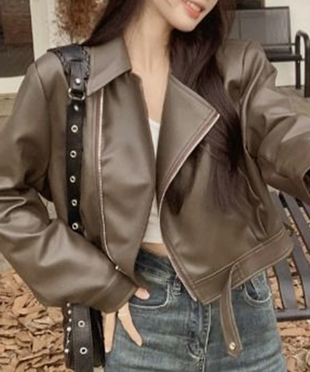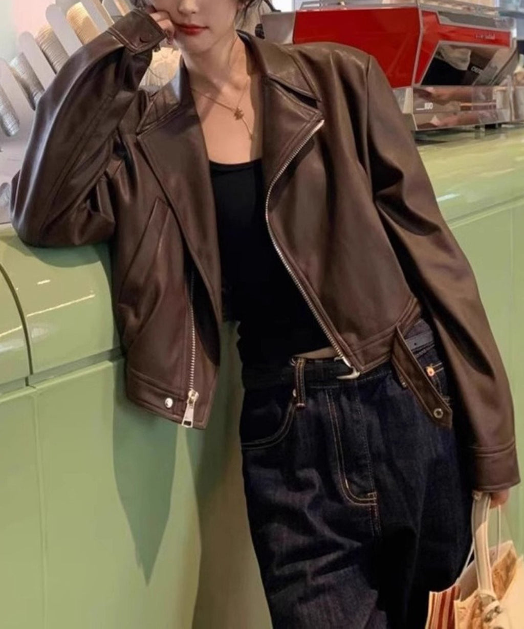 クラシックなライダースジャケットのデザインに、ショート丈がアクセントとなり、スタイルに抜け感を加えます。