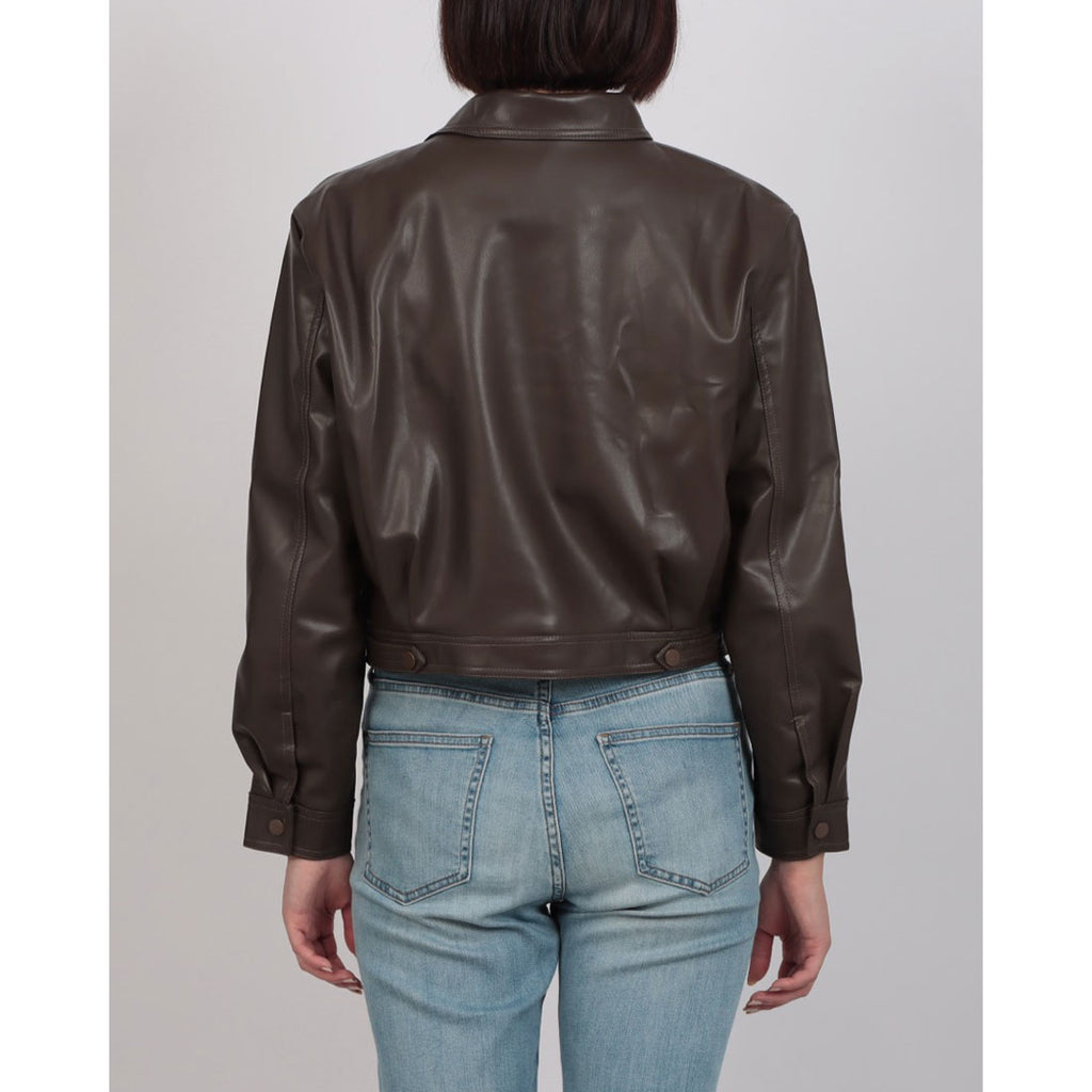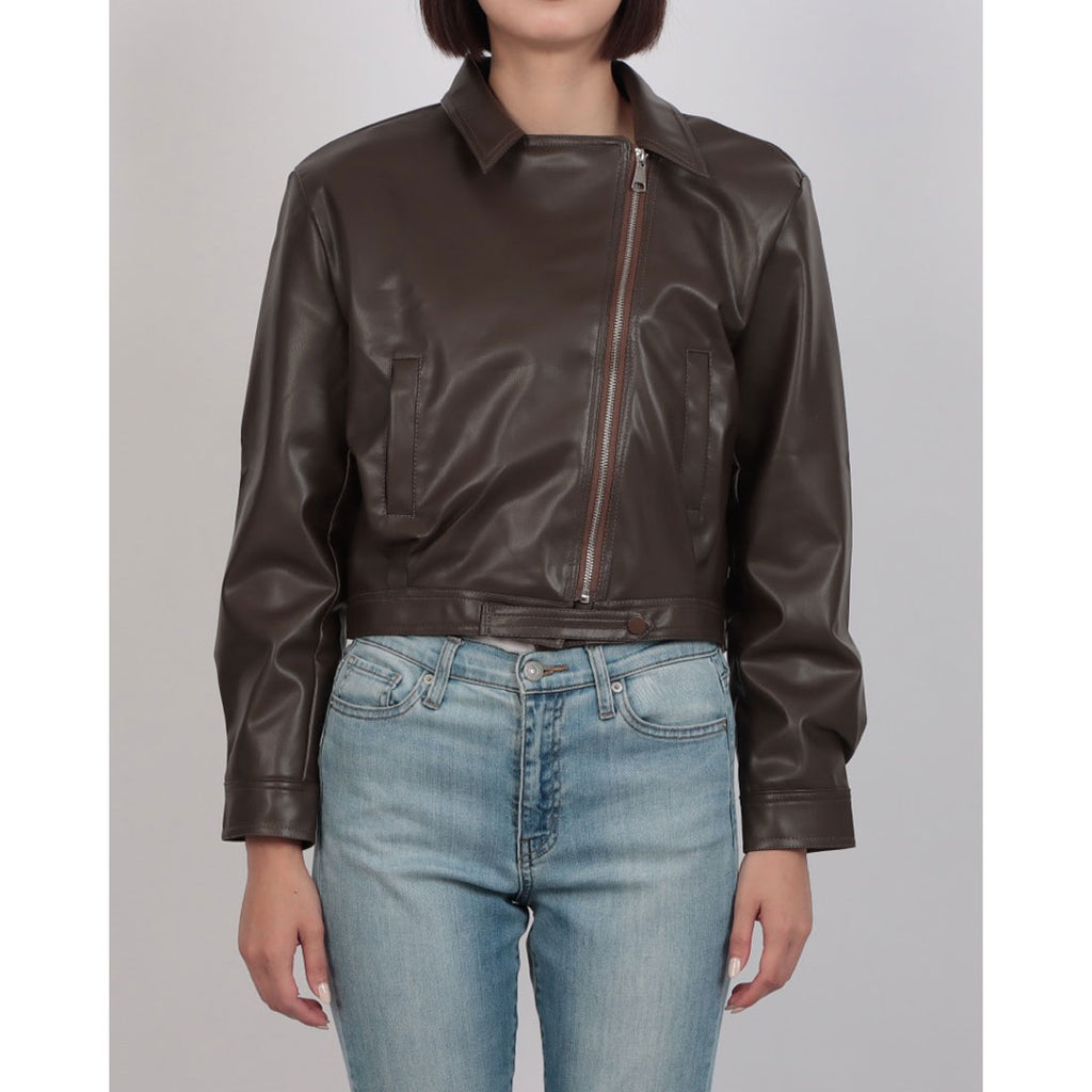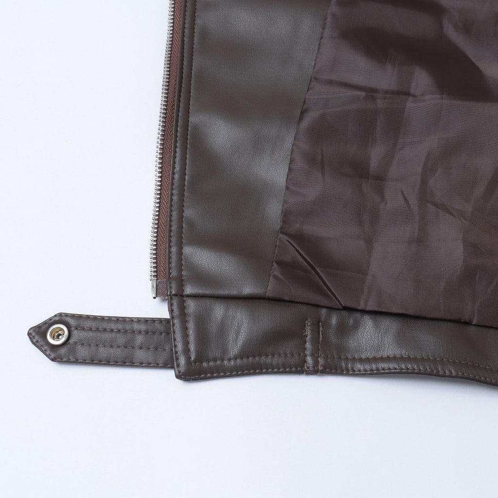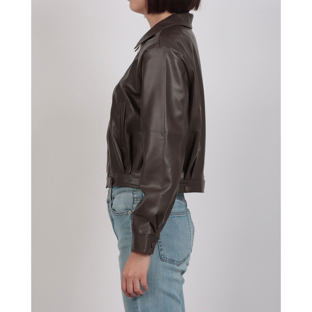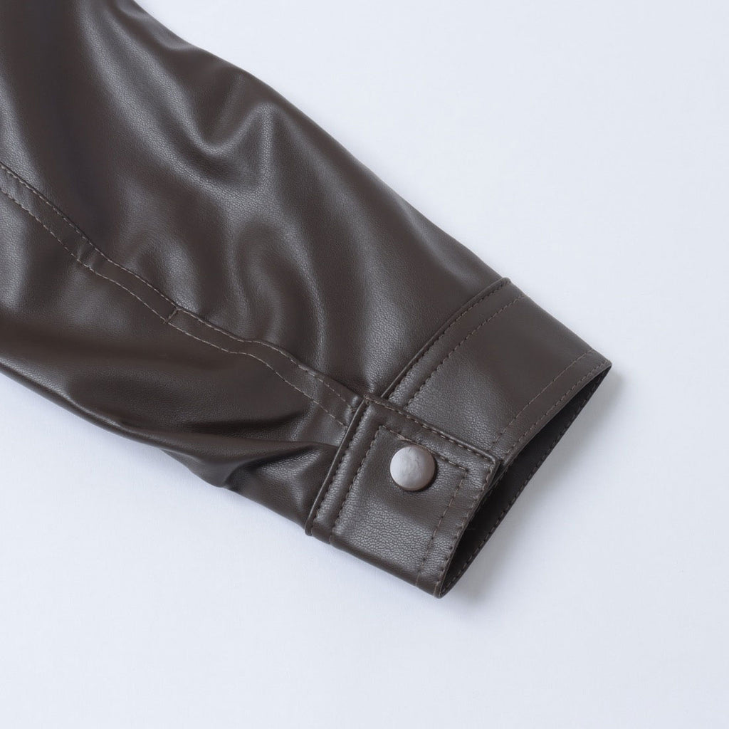 クラシックなライダースジャケットのデザインに、ショート丈がアクセントとなり、スタイルに抜け感を加えます。