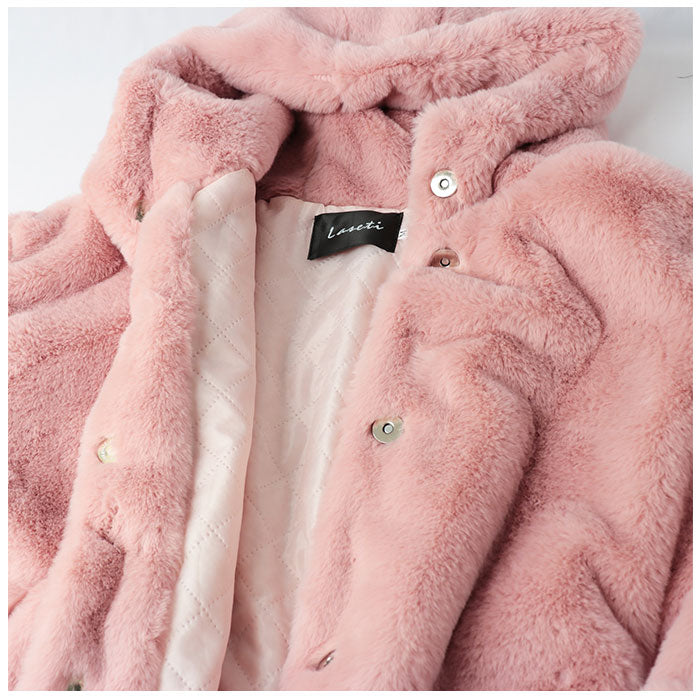 ボリューミーなシルエットが特徴的なフェイクファーコートが発売♪【フェイクファー素材】見た目も暖かいフェイクファーをふんだんに使ったアイテム♪とろけるような柔らかさが魅力♪【簡単着脱】フロントはマグネットボタンタイプ。外からボタンが見えず、開閉時片手で完了◎【立ち襟仕様】襟元までボタンを閉めれば襟が立つ仕様に。首元までしっかり寒さをガード!【フード付き】大きくざっくりとしたフード付き。デザイン性はもちろん、サッと被れば頭回りも暖かい♪【裏地付き】サラッとした肌触りの裏地付き。チクチク感がなく、肌が弱い方も安心♪【ポケットあり】両サイドにハンカチやミニウォレットがはいるポケット付き。