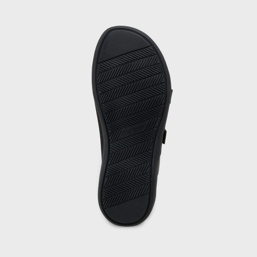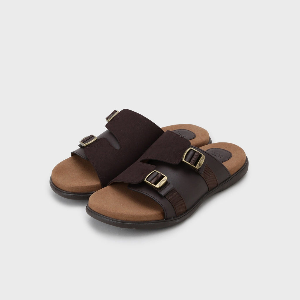 このスライドサンダルは、人工皮革のスムースとスエードを組み合わせたコンビネーションデザインで、見た目の美しさと耐久性を両立。足元をしっかりと包み込むWバックル仕様が、安定感を提供します。