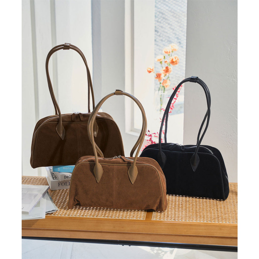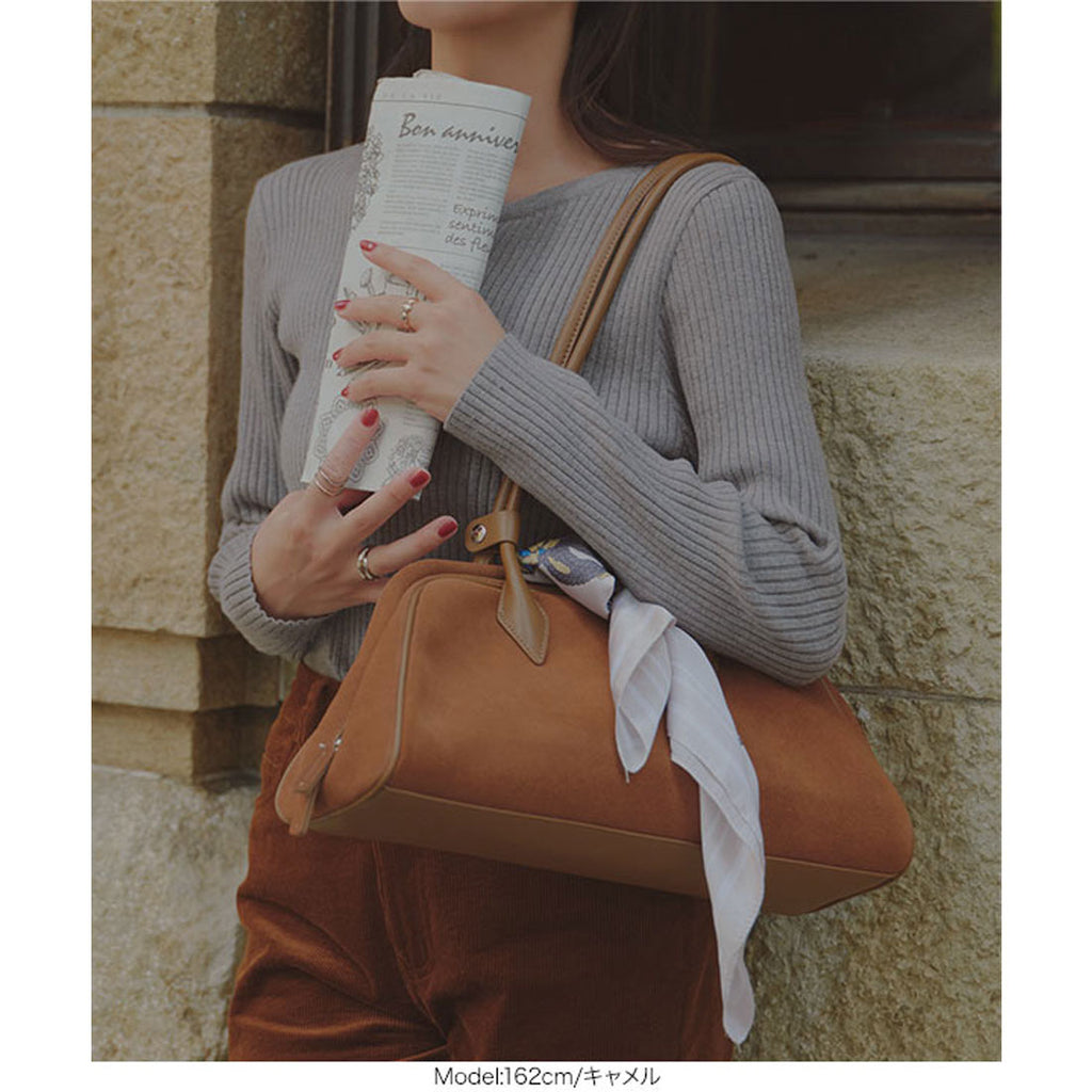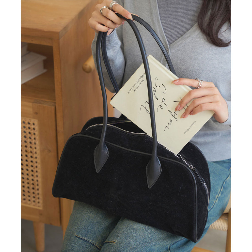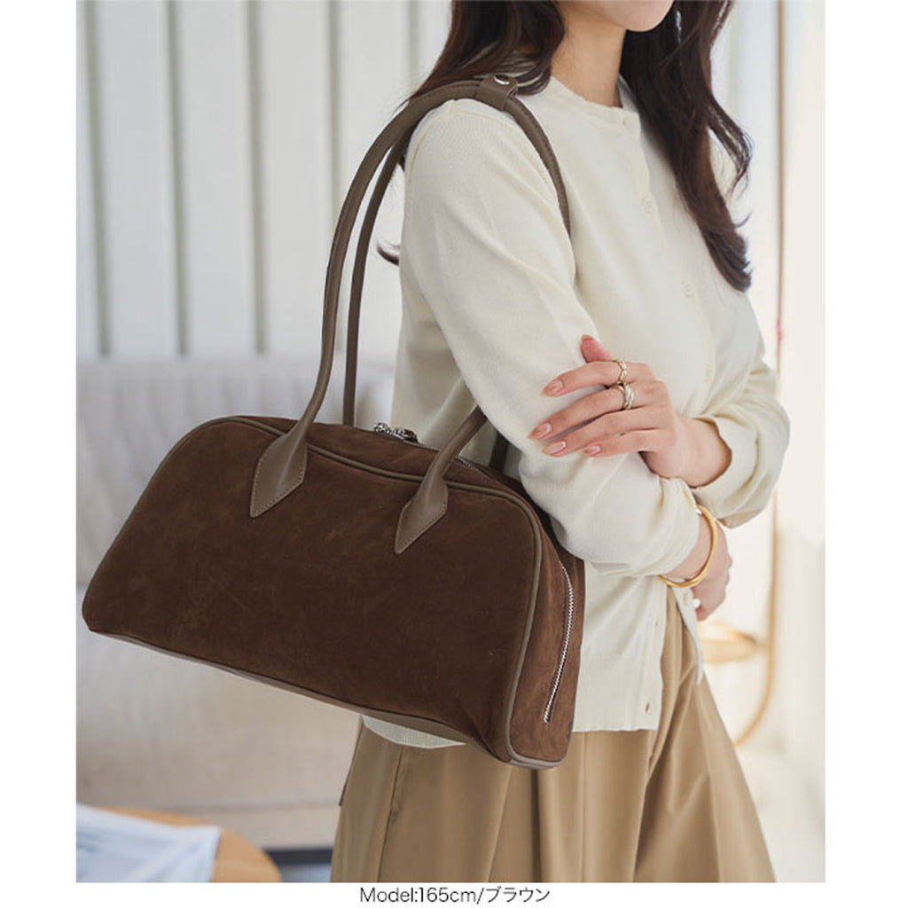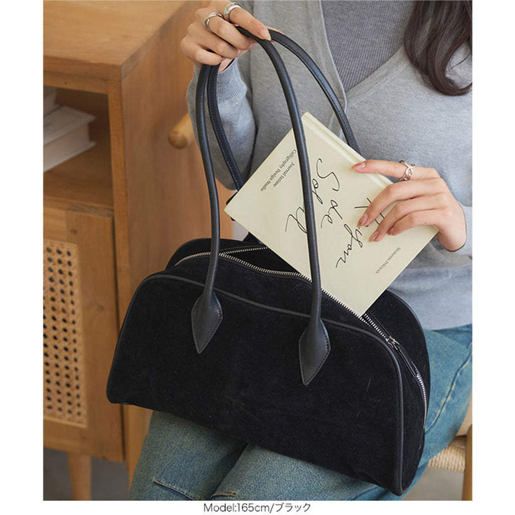 長めハンドルがトレンドライクなスウェードボストンバッグ。