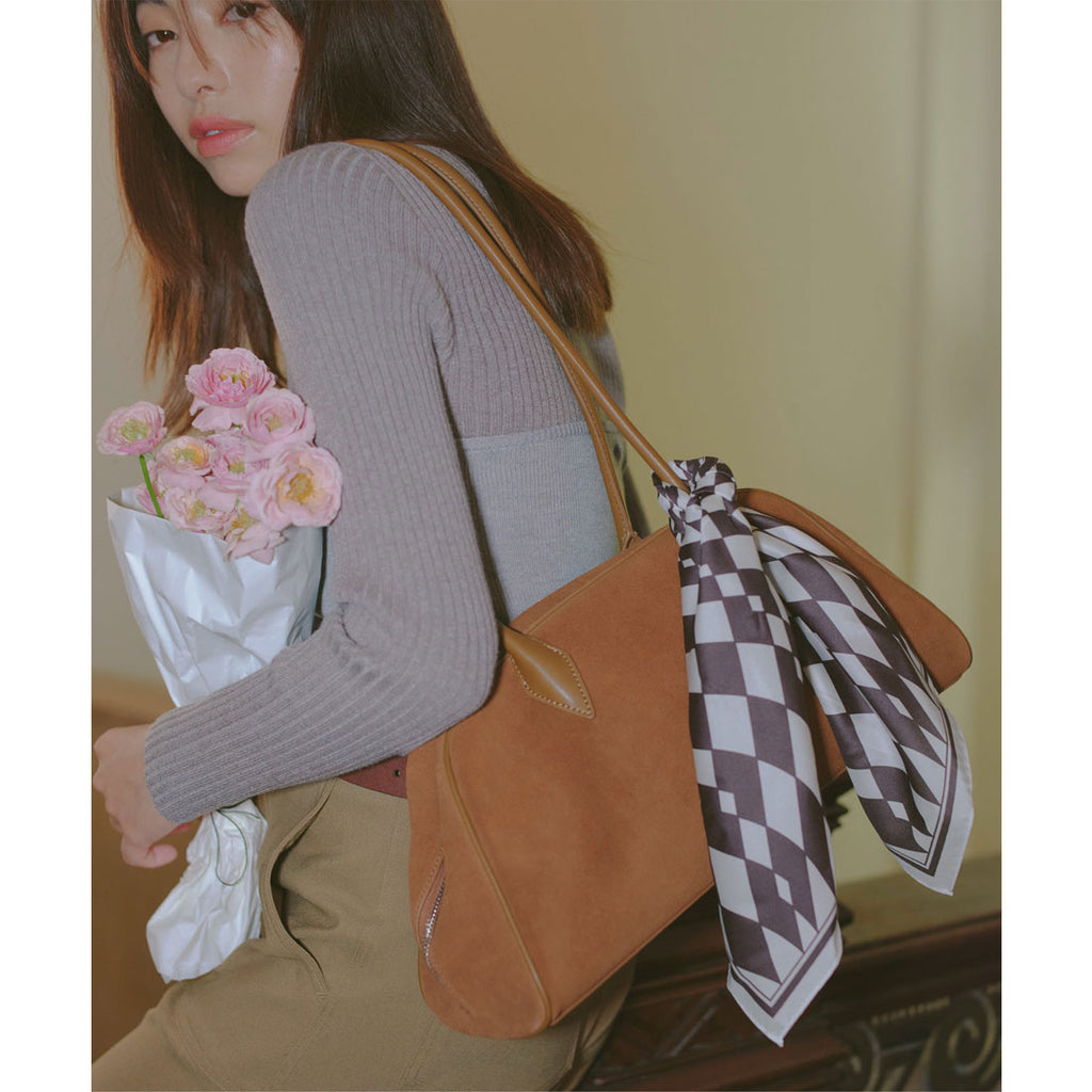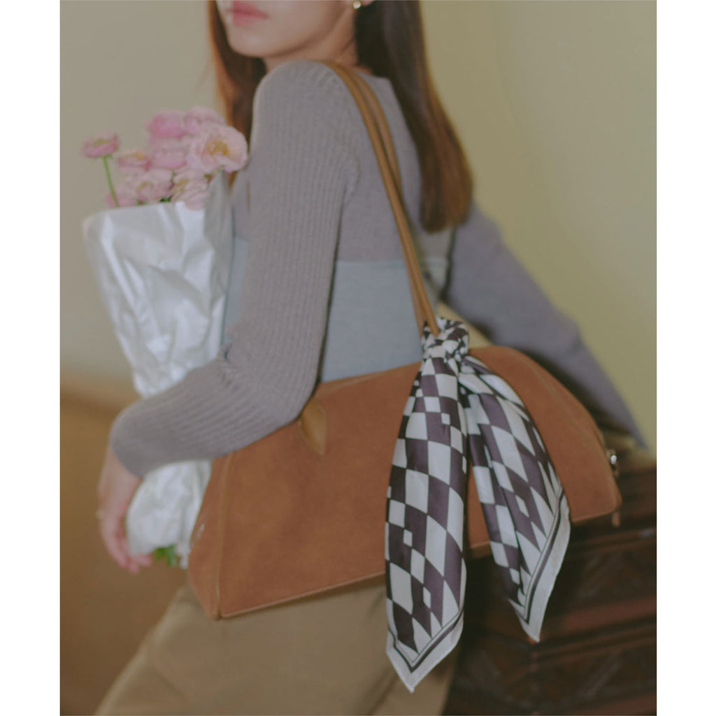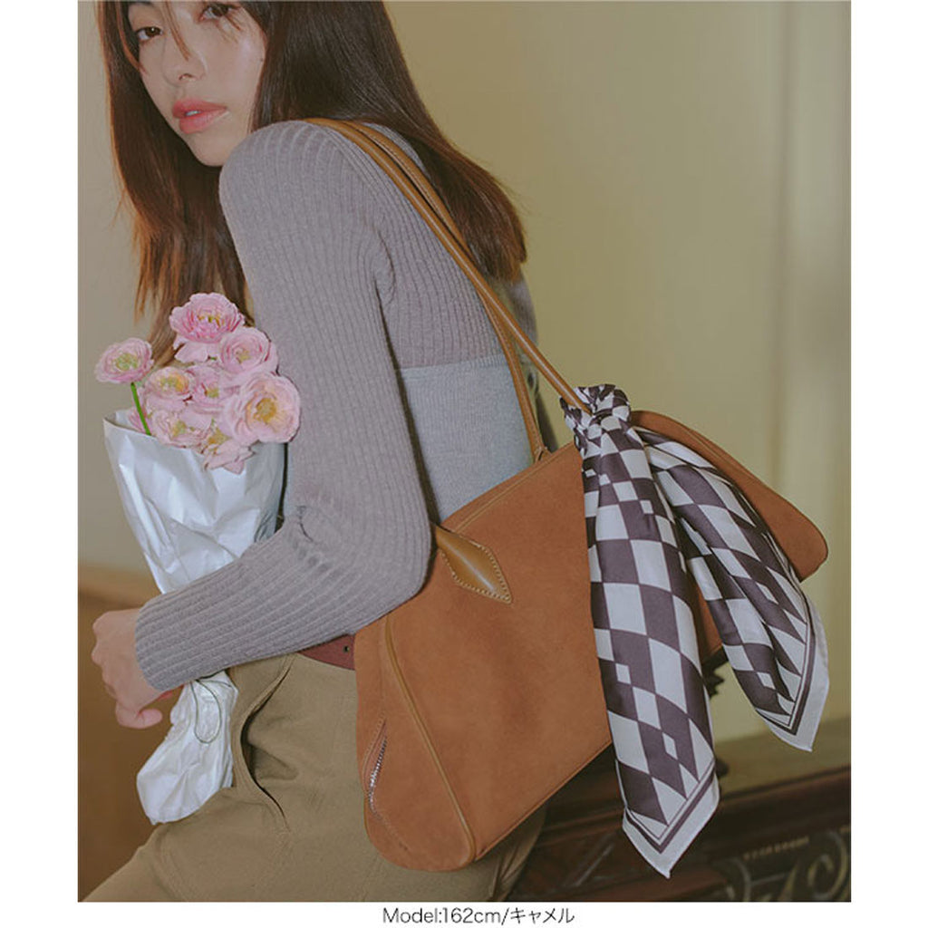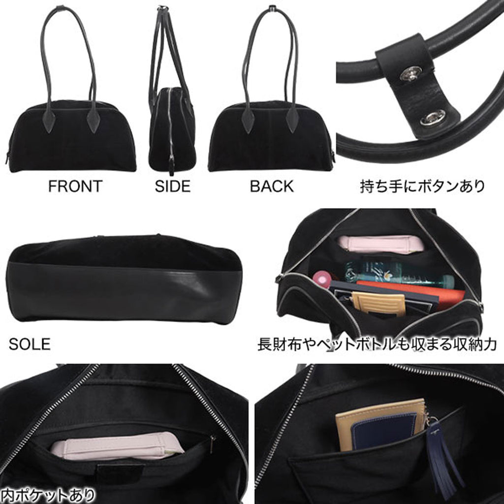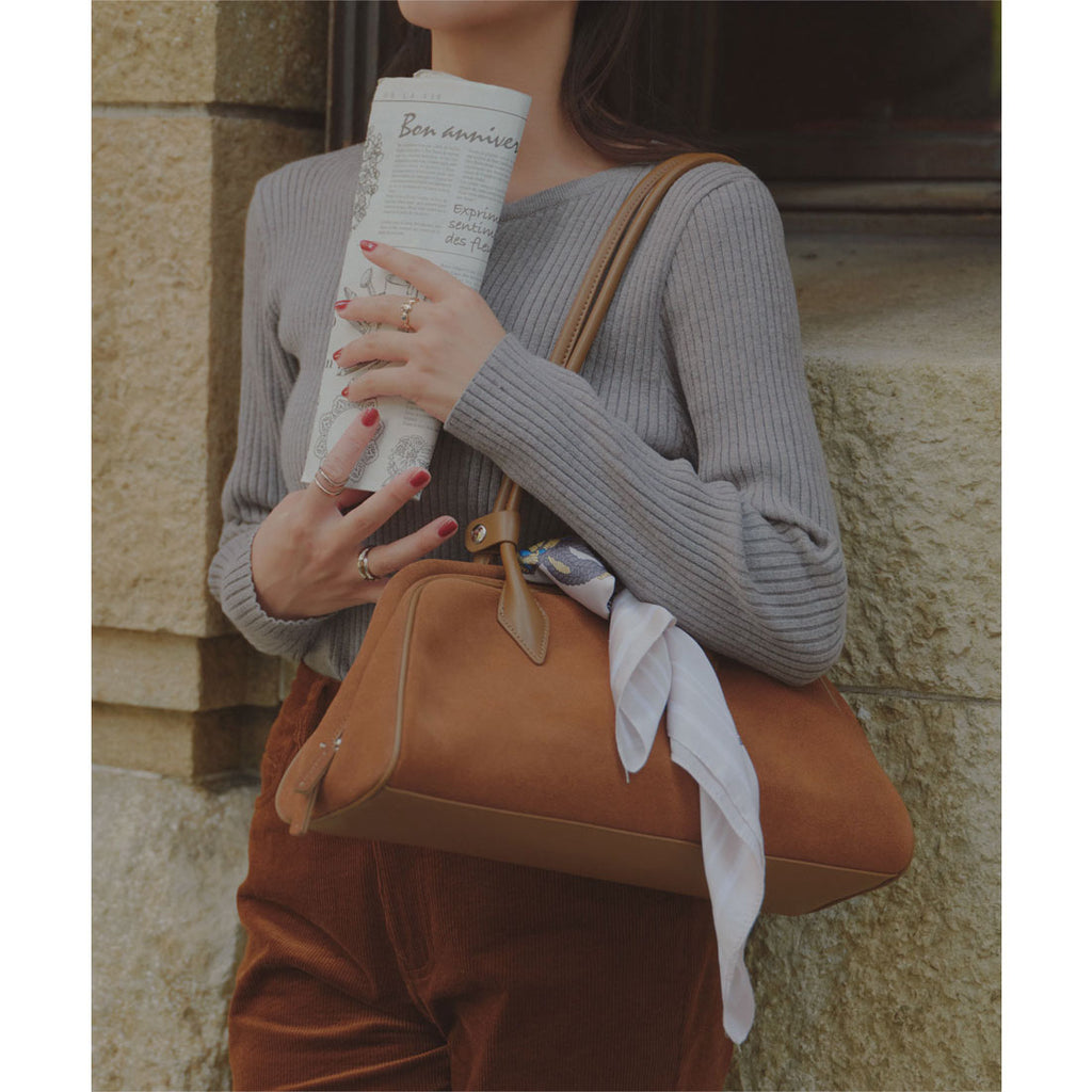 長めハンドルがトレンドライクなスウェードボストンバッグ。