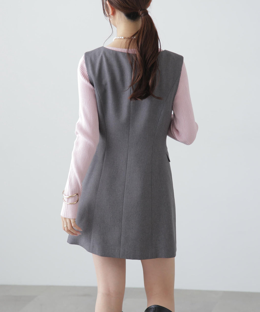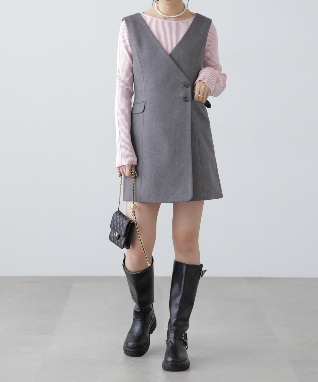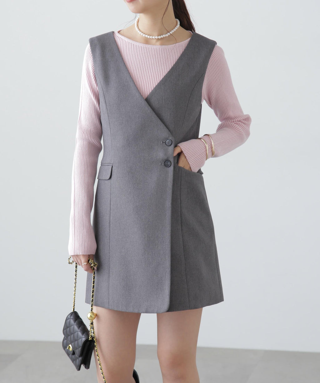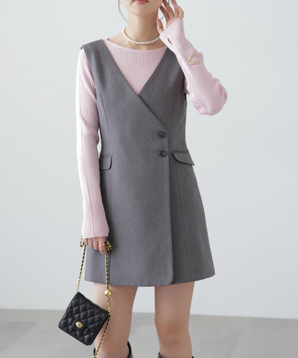 ご好評のジレ風ラップジャンパースカートを、前ボタン開きにして着やすくアップデートしました。ツイル素材のジレのような形をベースにした、レイヤード仕様のミニ丈ワンピース。パネル切り替えをいれて、ウエストがくびれて見えるようにデザインし、キレイなシルエットを演出します。フラップポケット付きなので、ジレジャケットのきちんと感もプラス。ミニワンピースとしてはもちろん、フロントボタンを開けてパンツを合わせればジレとしても着回せます。インナーは長袖から半袖Tシャツにかえるとロングシーズン着用できます。