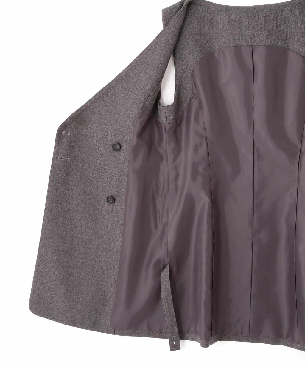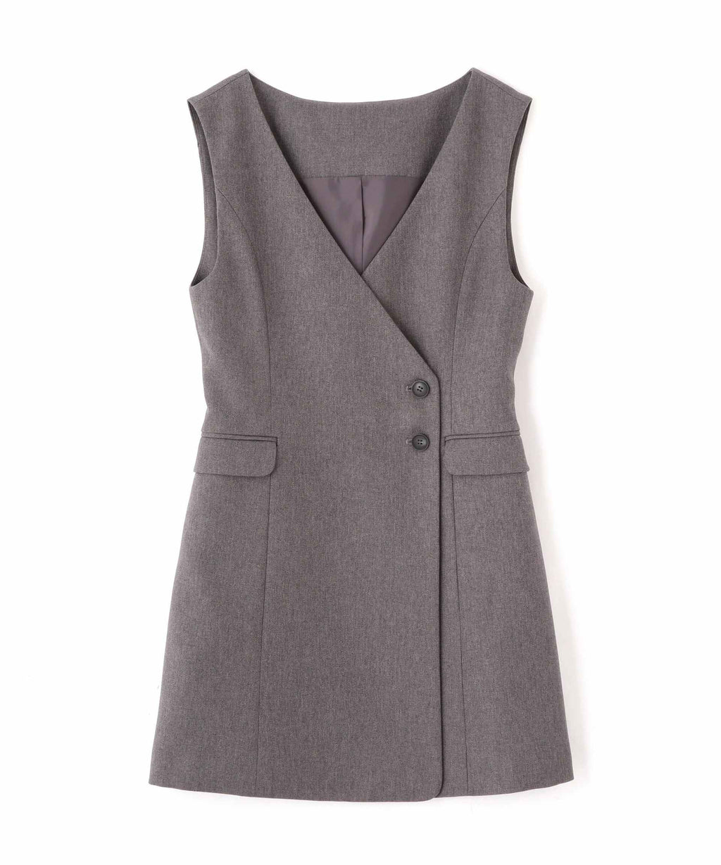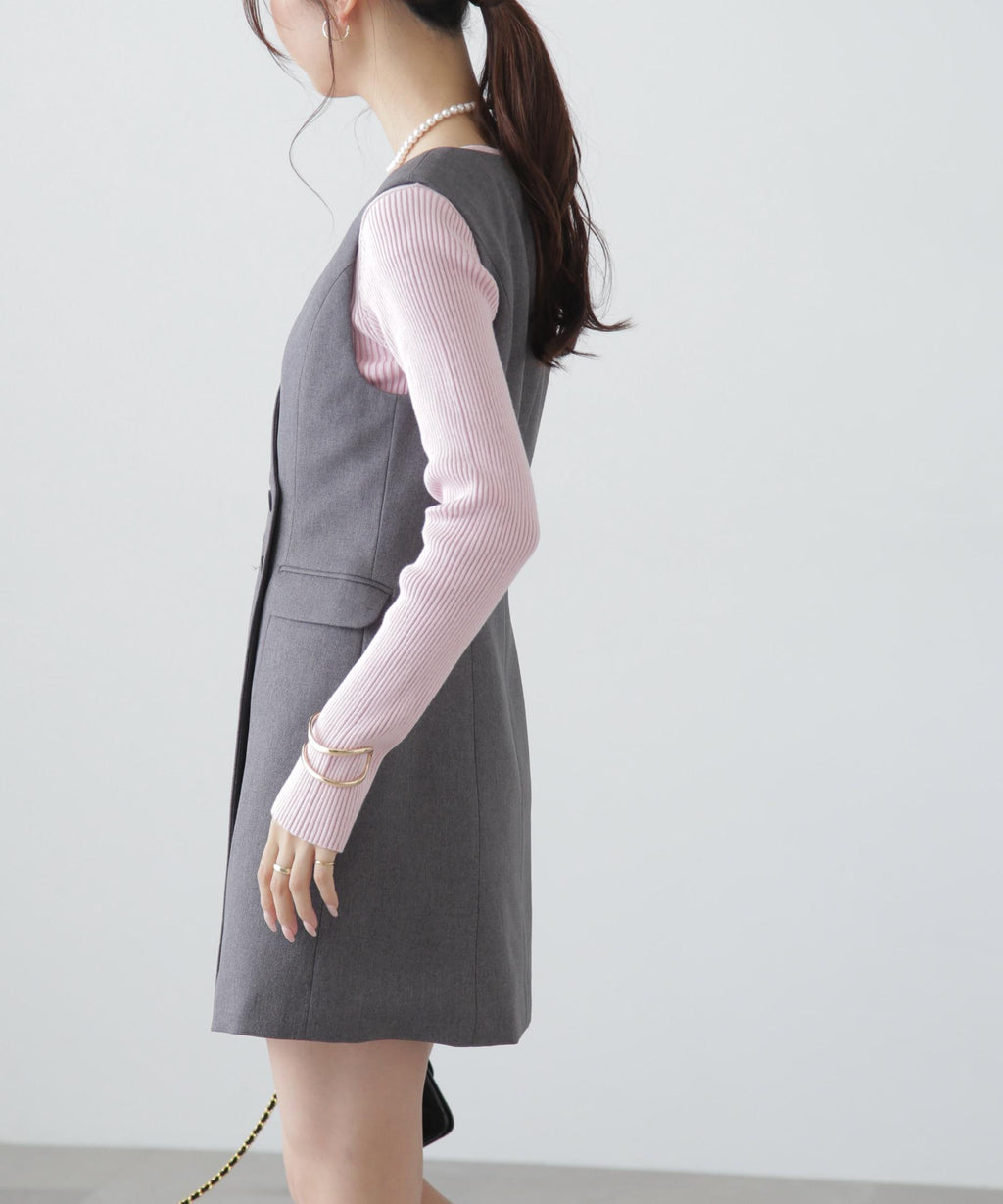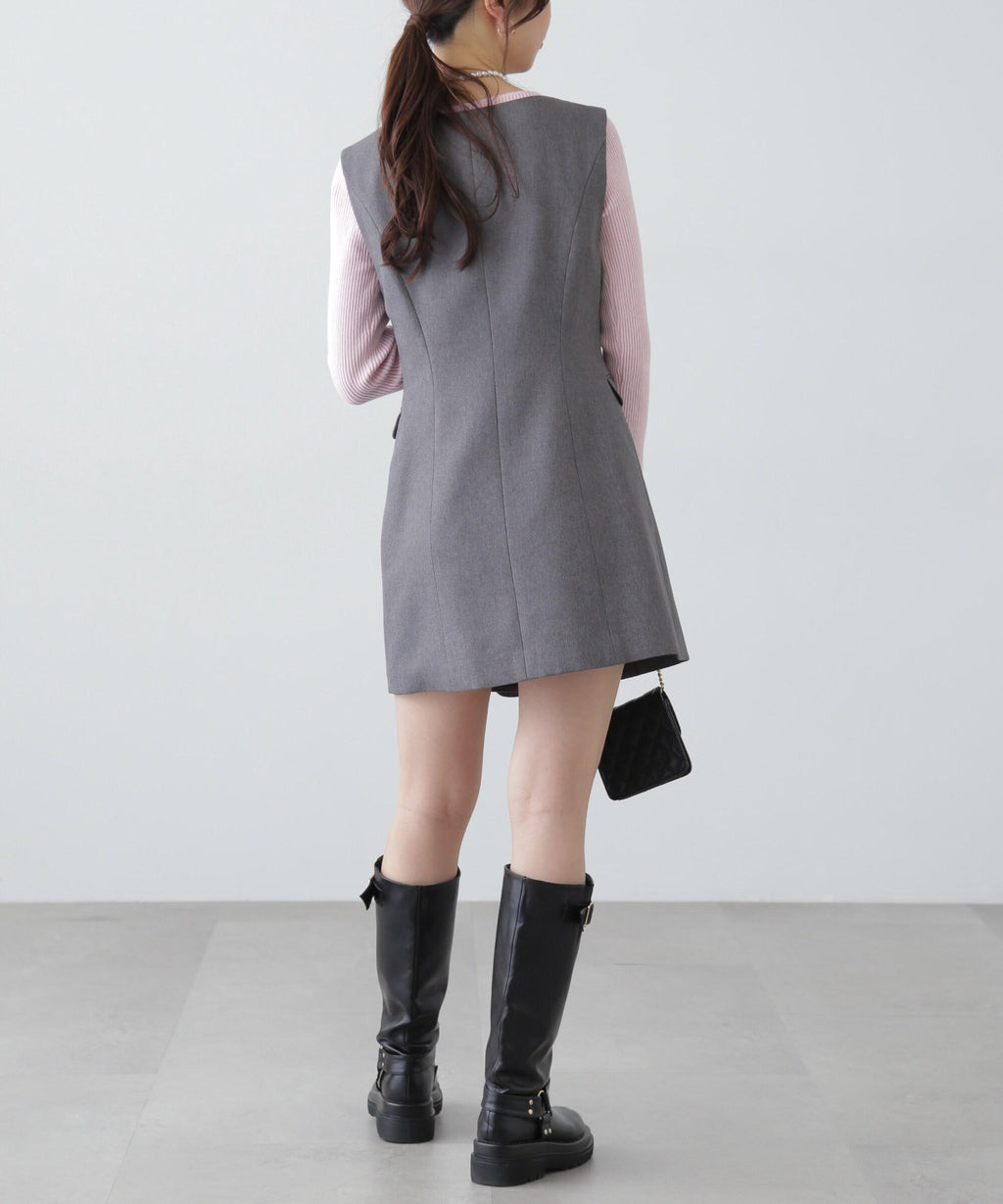 ご好評のジレ風ラップジャンパースカートを、前ボタン開きにして着やすくアップデートしました。ツイル素材のジレのような形をベースにした、レイヤード仕様のミニ丈ワンピース。パネル切り替えをいれて、ウエストがくびれて見えるようにデザインし、キレイなシルエットを演出します。フラップポケット付きなので、ジレジャケットのきちんと感もプラス。ミニワンピースとしてはもちろん、フロントボタンを開けてパンツを合わせればジレとしても着回せます。インナーは長袖から半袖Tシャツにかえるとロングシーズン着用できます。