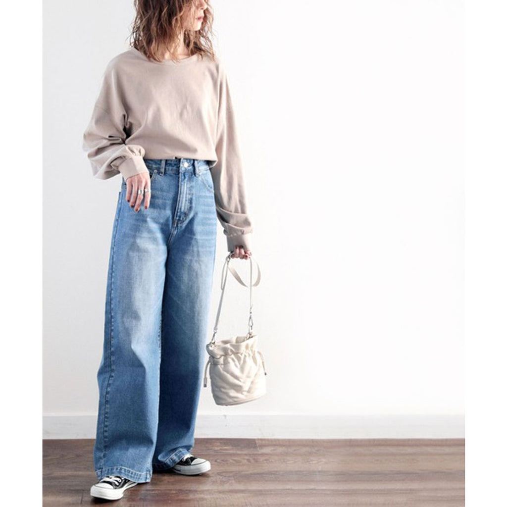 全体的にゆったりとしたシルエットのストレートデニムは、華奢見せ効果も。