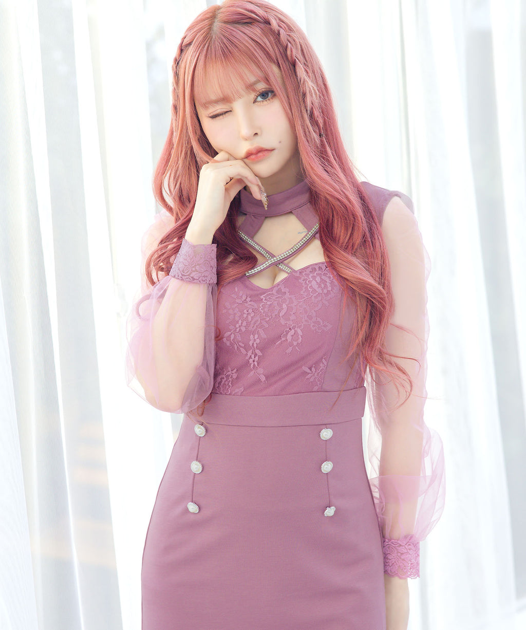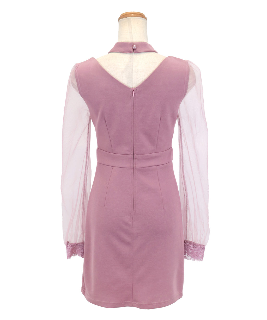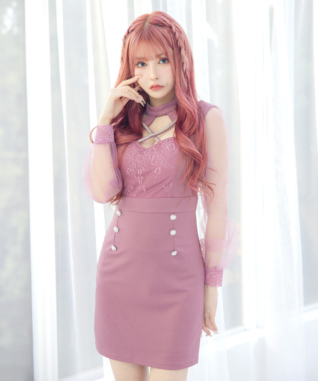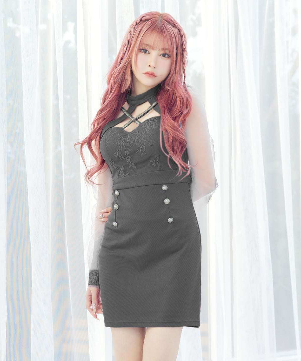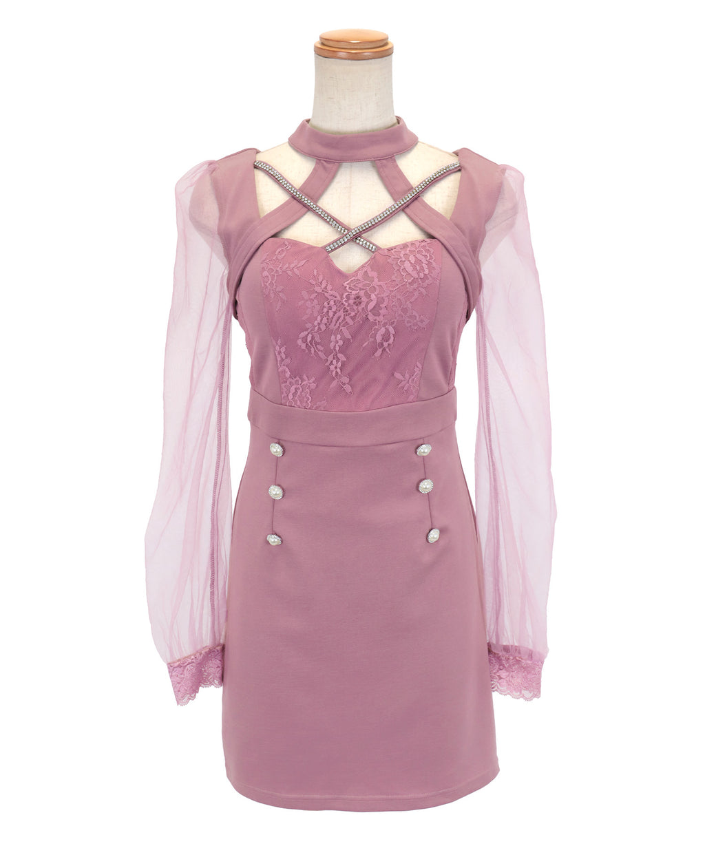ティカ Tika 長袖シアー切り替えクロスネックビジューダブルボタンタイトミニドレス