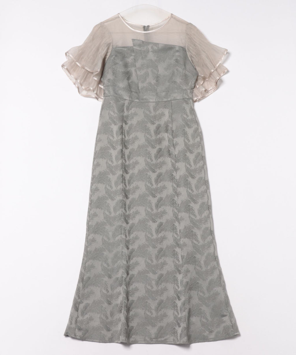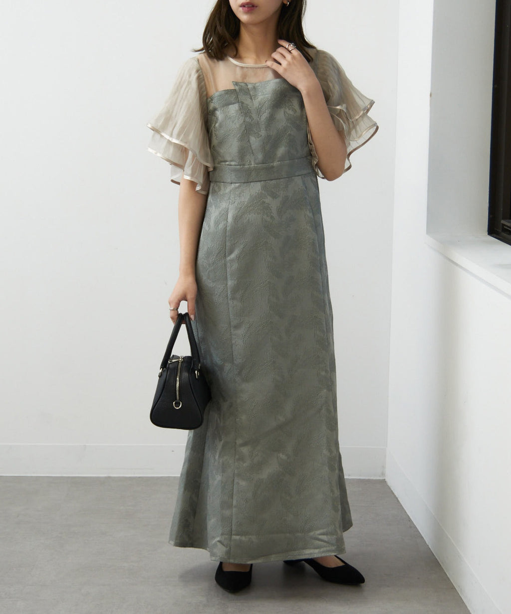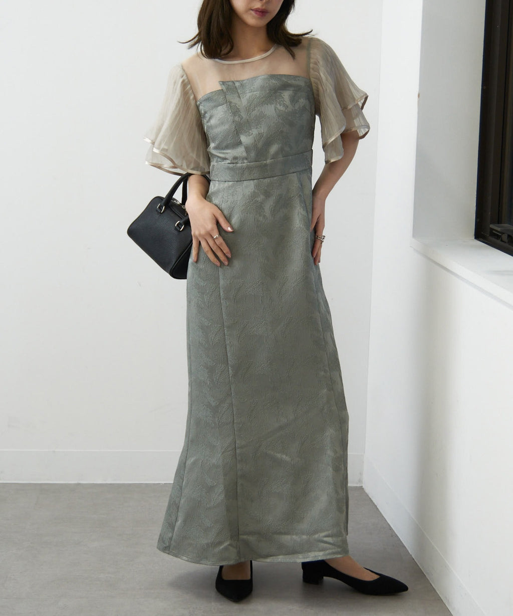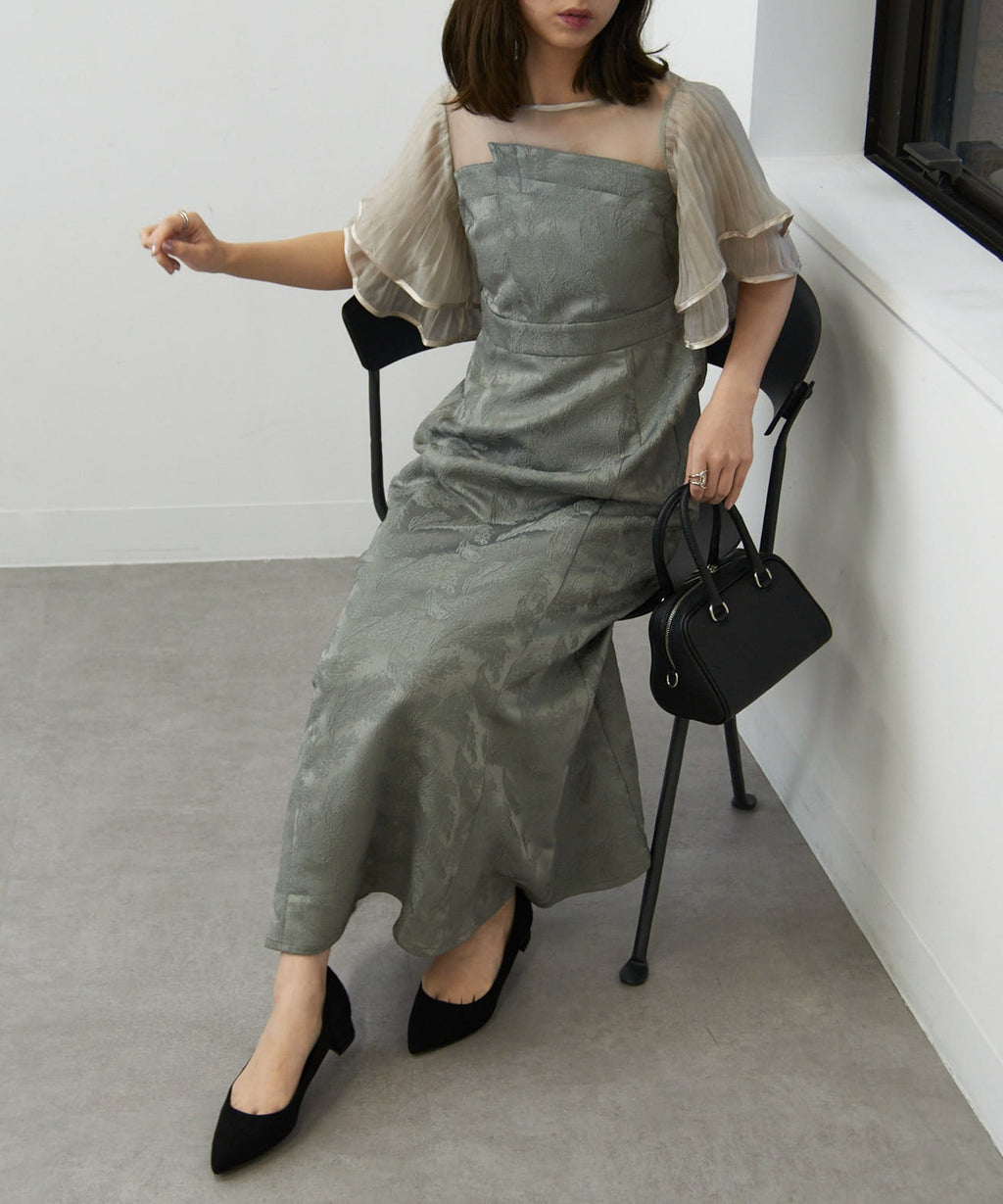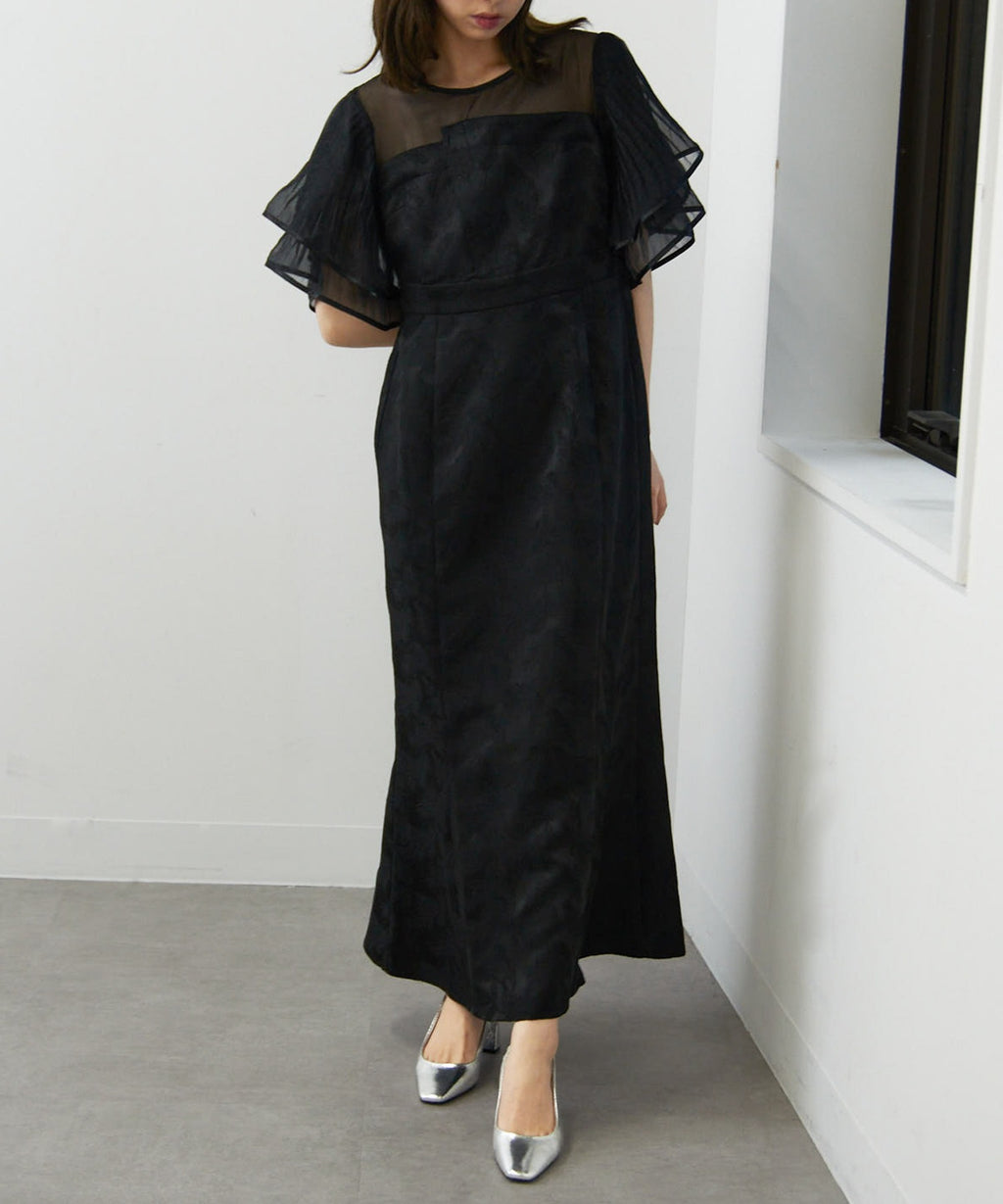 透け感のあるシアーデザインがデコルテを美しく演出し、エレガントな雰囲気を引き立てる一枚。