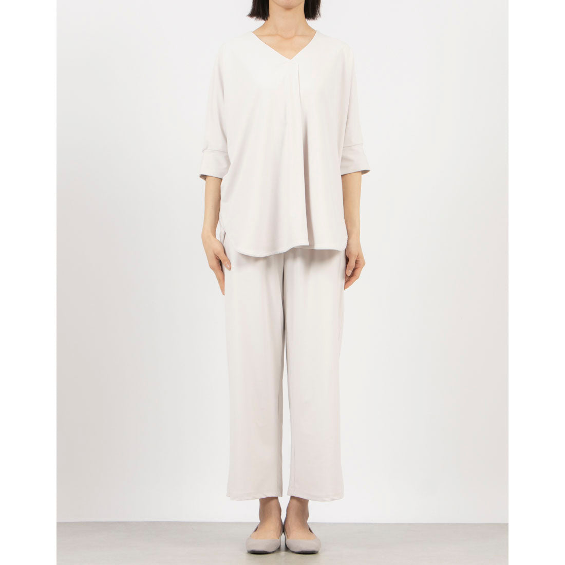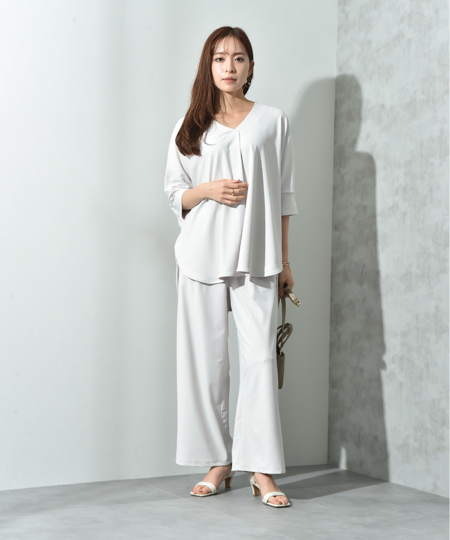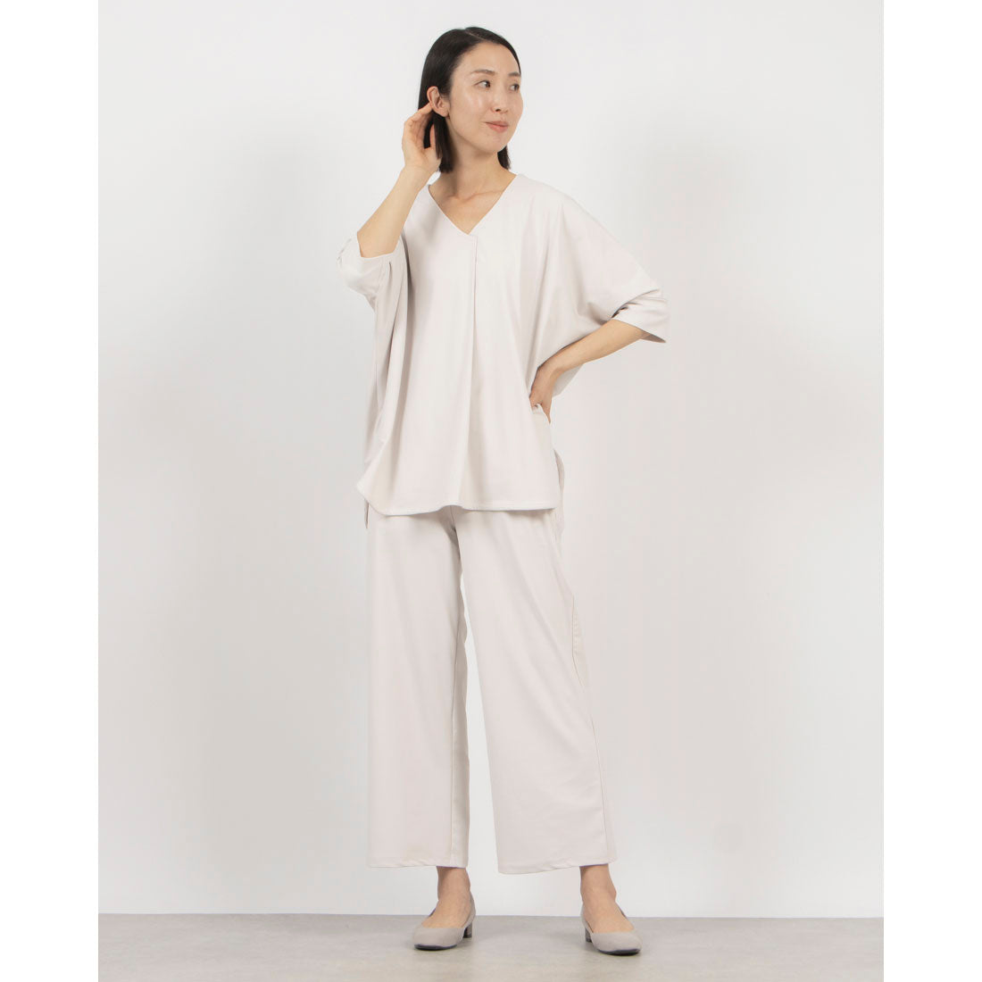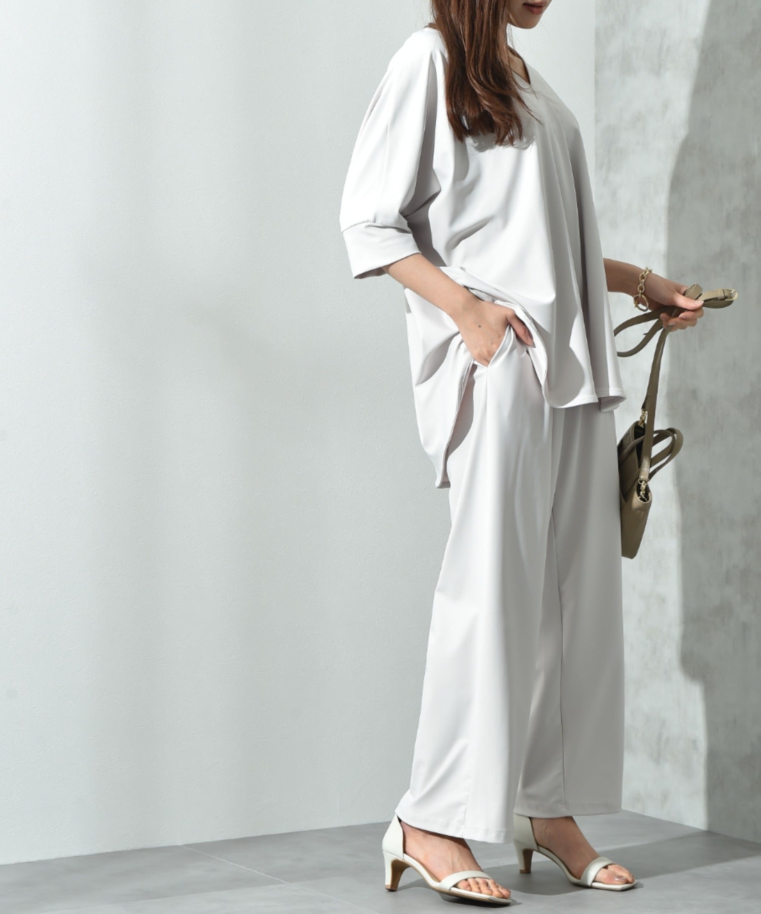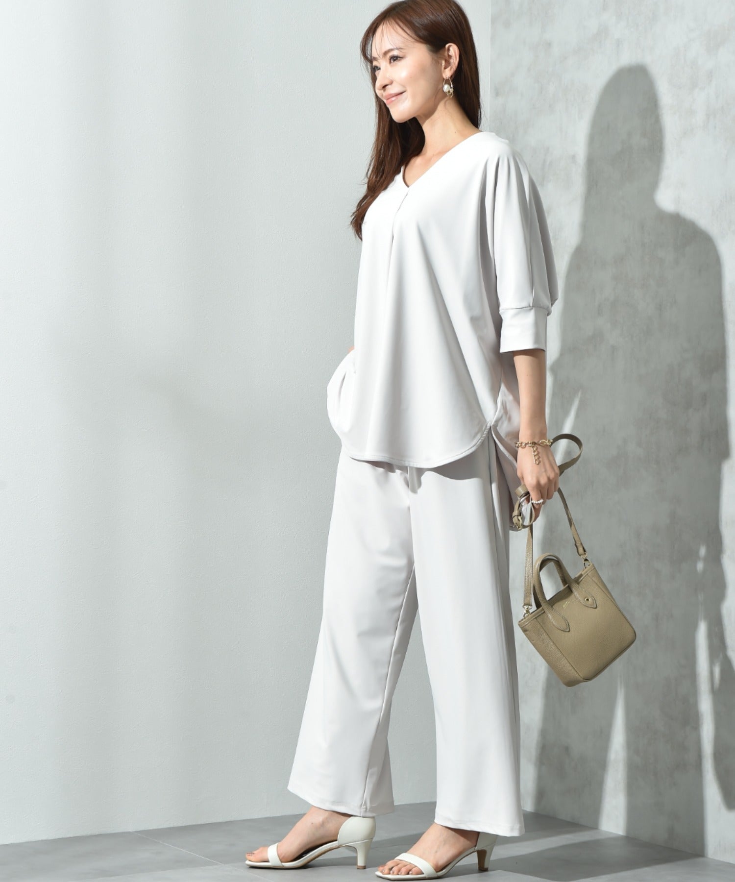 リラクシーなシルエットながらも上品な印象を保つ、大人のためのセットアップです。