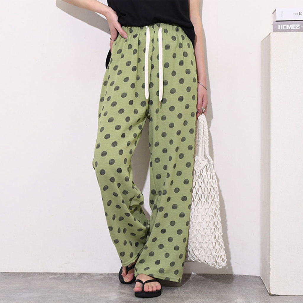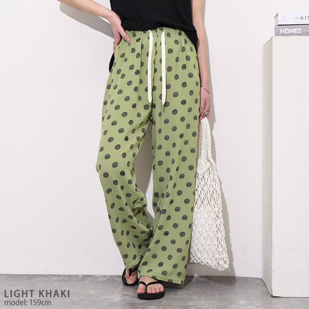 ドット柄ドローストリングスラブイージーワイドパンツ レディース ボトムス 春 夏 きれいめ ハイウエスト 速乾 柄物 薄手 涼しい 楽ちん ウエストゴム リラックス ゆったり イージーパンツ 柄パンツ デイリー