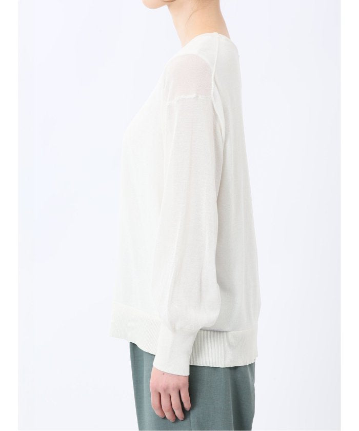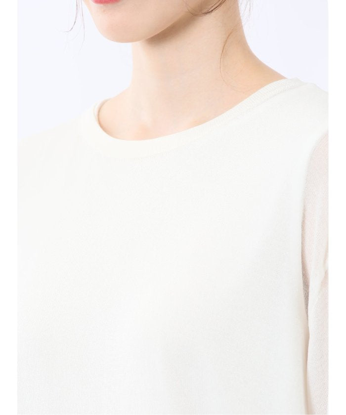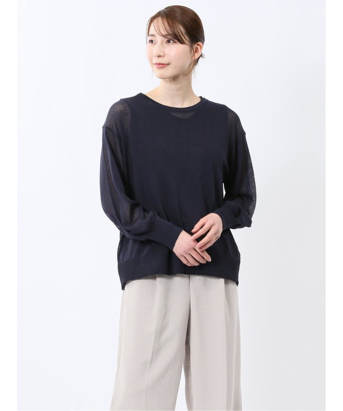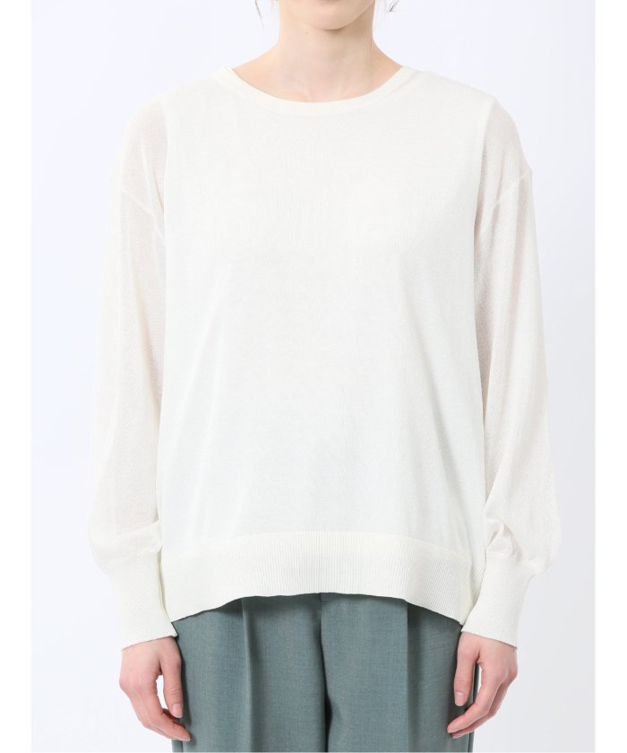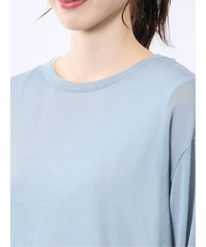 長袖ニットはレーヨンにナイロンを混紡したニット素材です。薄手のシアー生地で、ヘルシーな透け感とサラッとした着心地が魅力。タンクトップはポリエステル・コットンの天竺素材です。