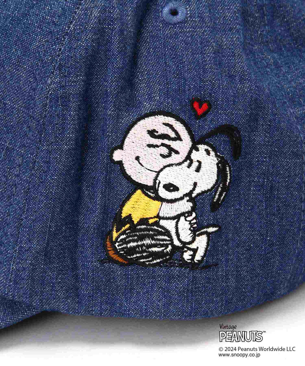 デニムシャツと同じ生地を使用したCAP。仲良しのチャーリーブラウンとスヌーピーの刺繍がポイント。