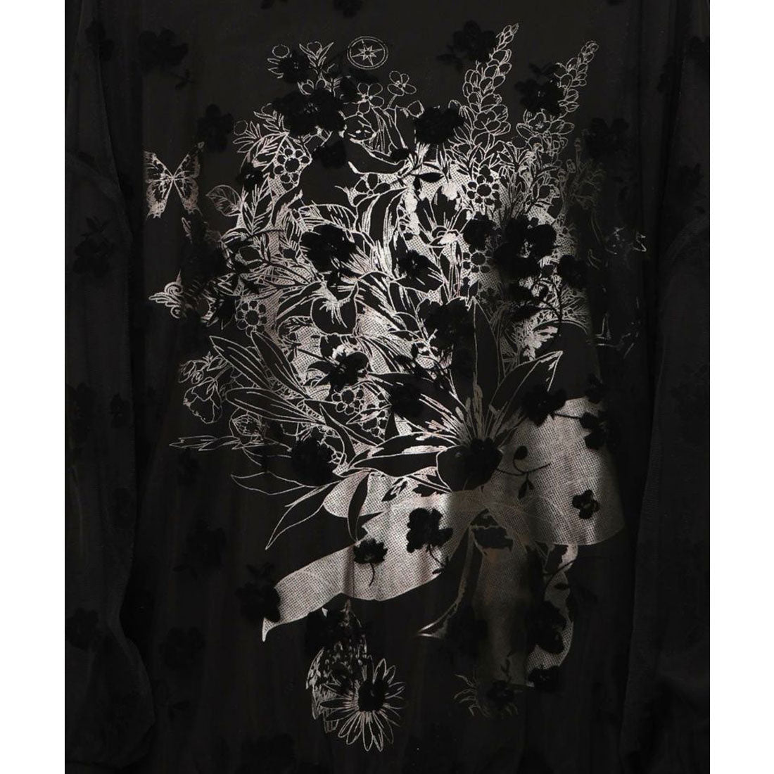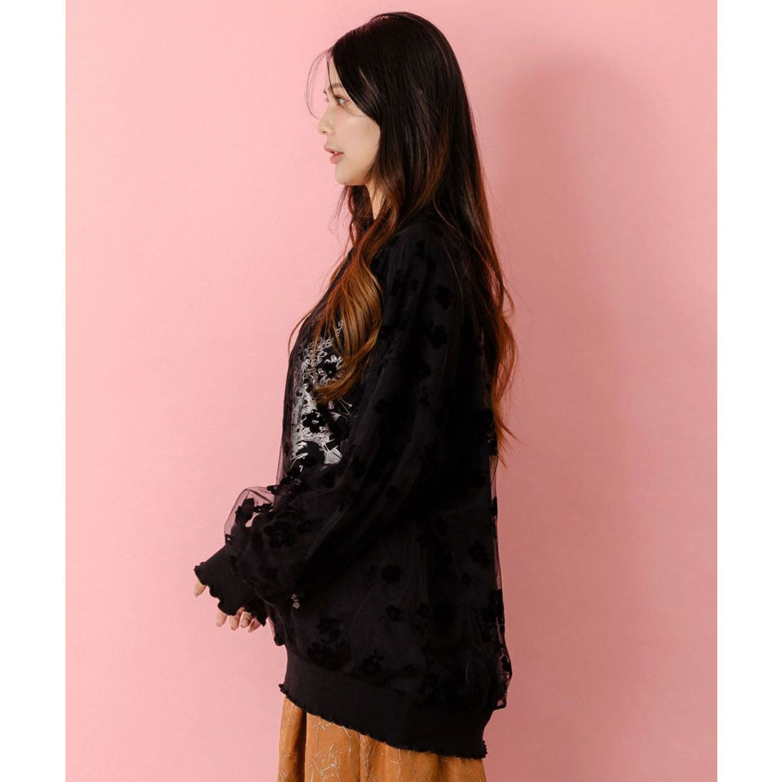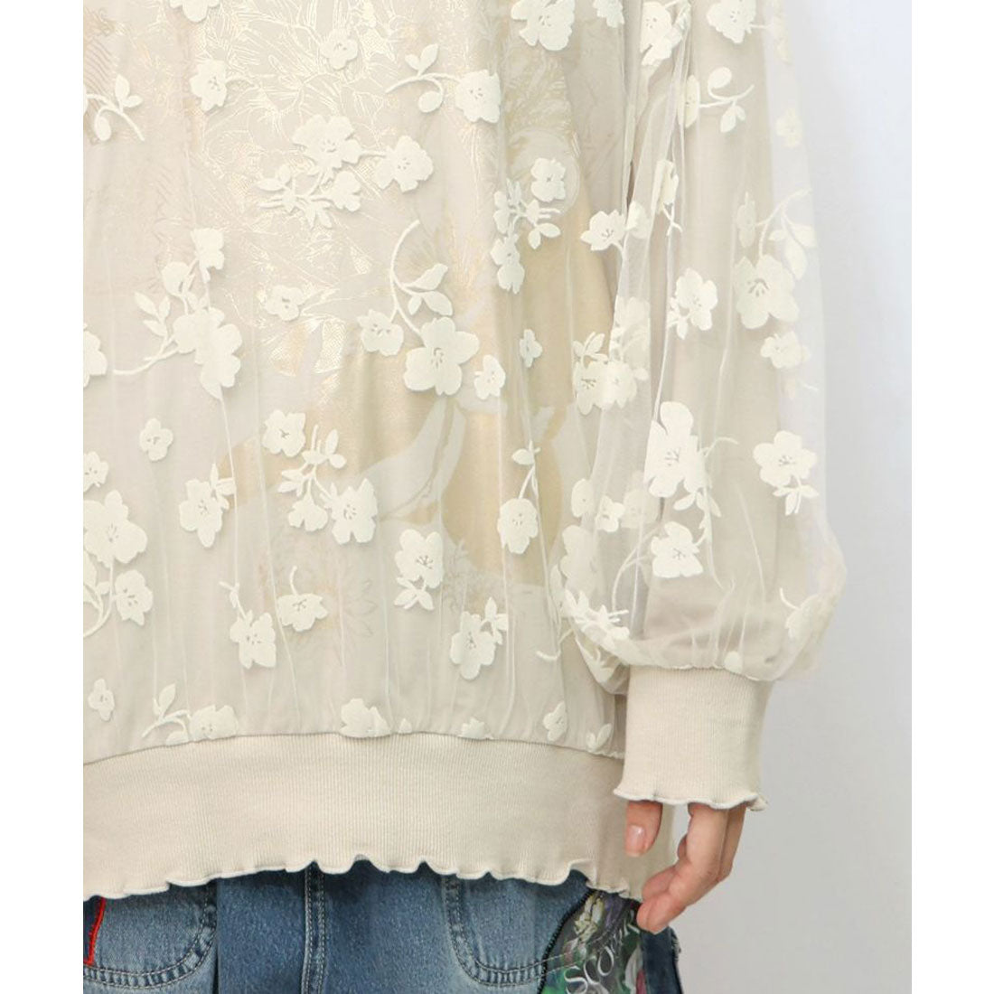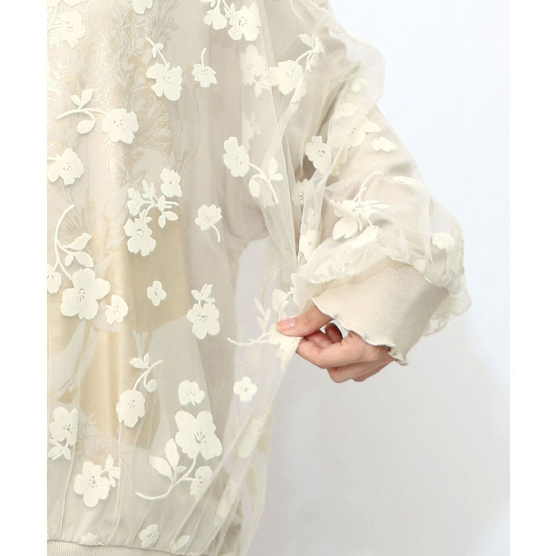 花柄フロッキープリント入りのチュールでふんわりと包んで閉じ込めました。