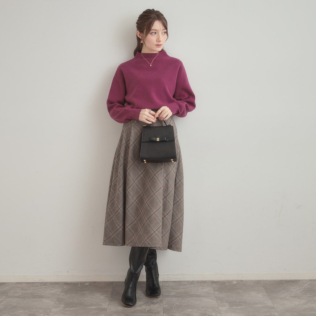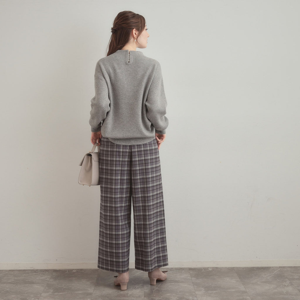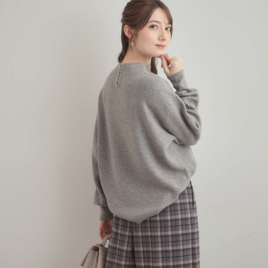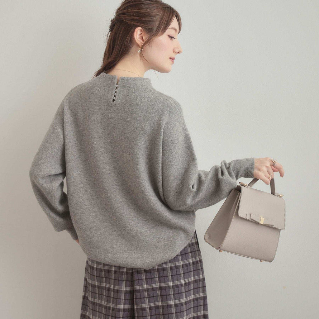 バックネックのハシゴフェイクパールがアクセントになった、ボトルネックニットトップス