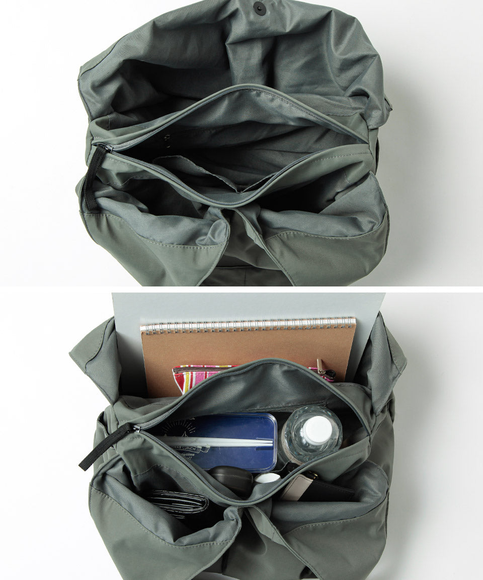 ・メイン収納の内側にはオープンポケットが2つとファスナーポケットが1つ付いています。