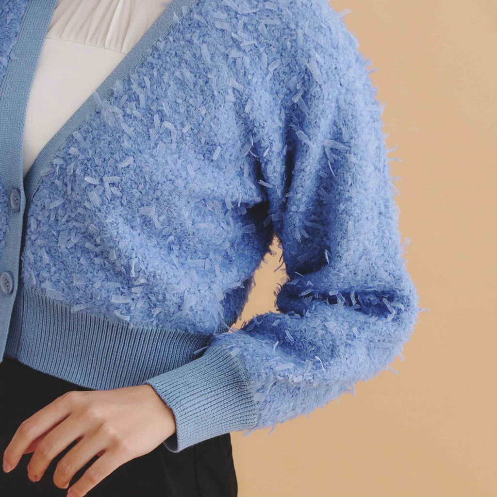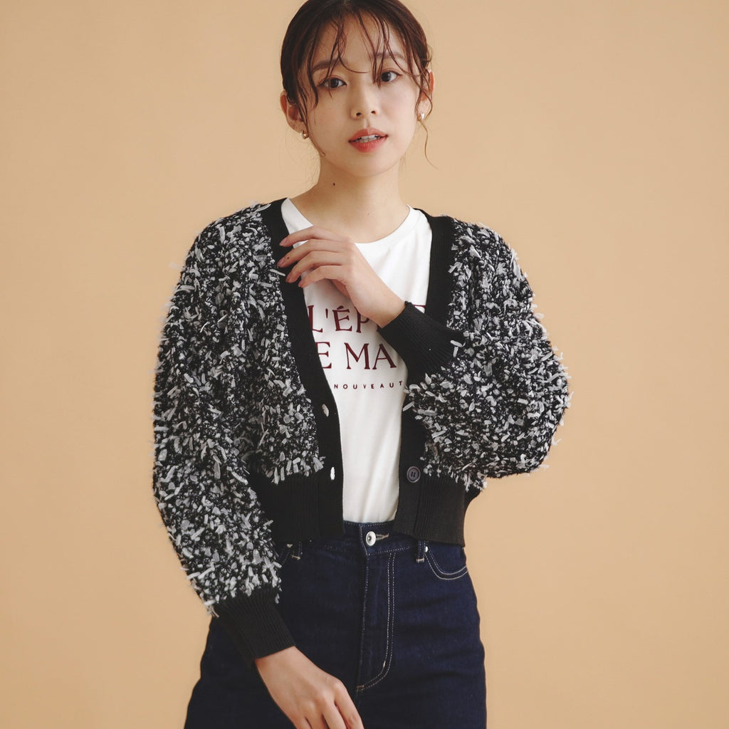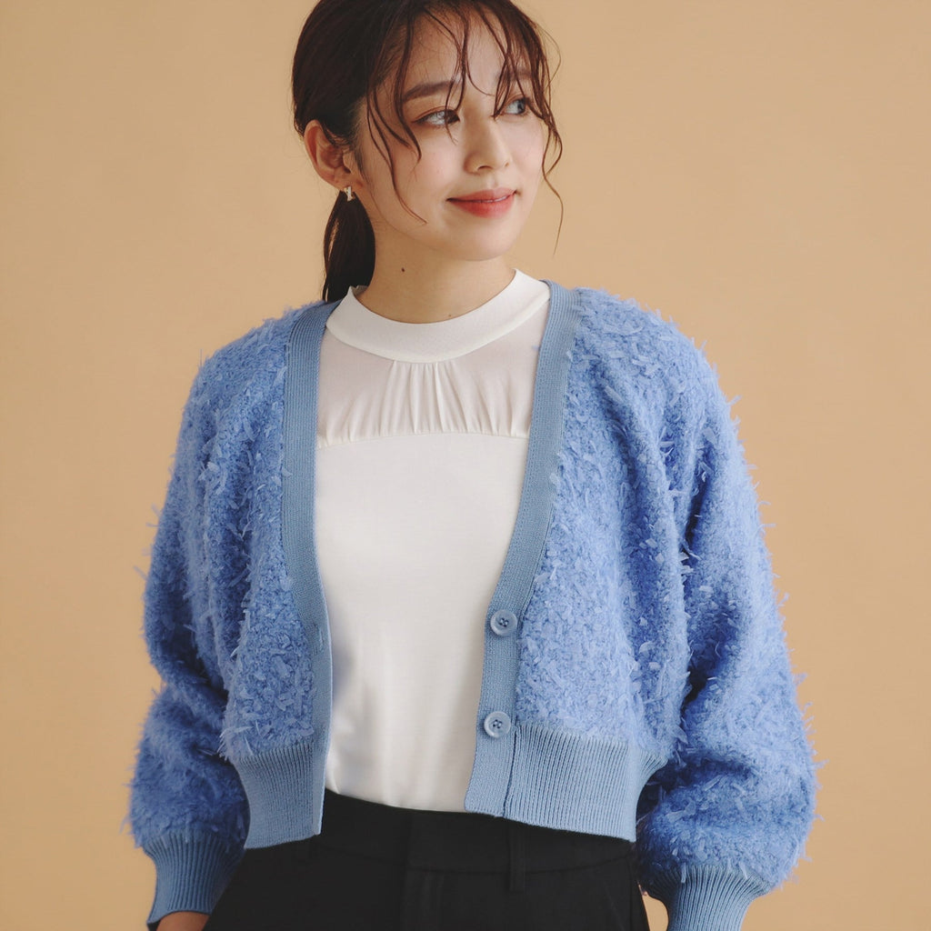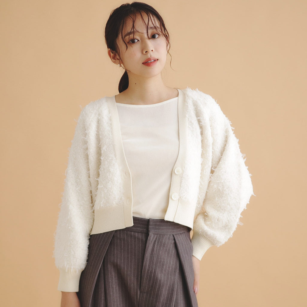 ・チュールフラッグのもこもこの糸を使用した、深Vネックの短丈ニットカーディガンです。