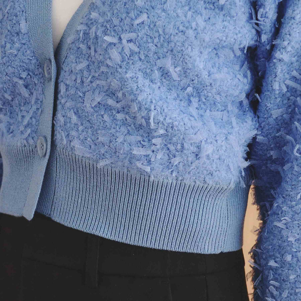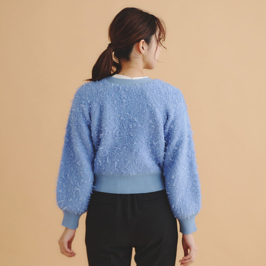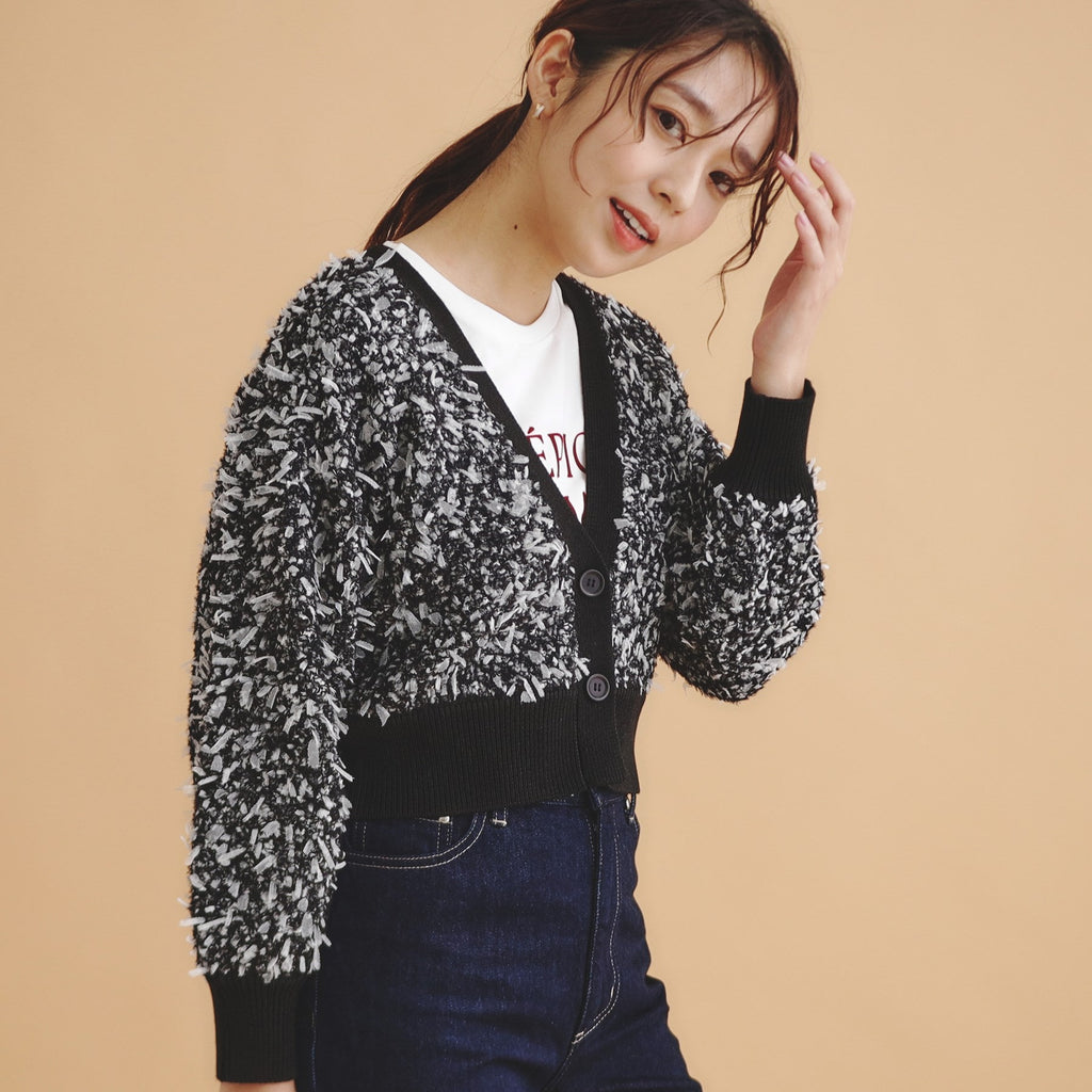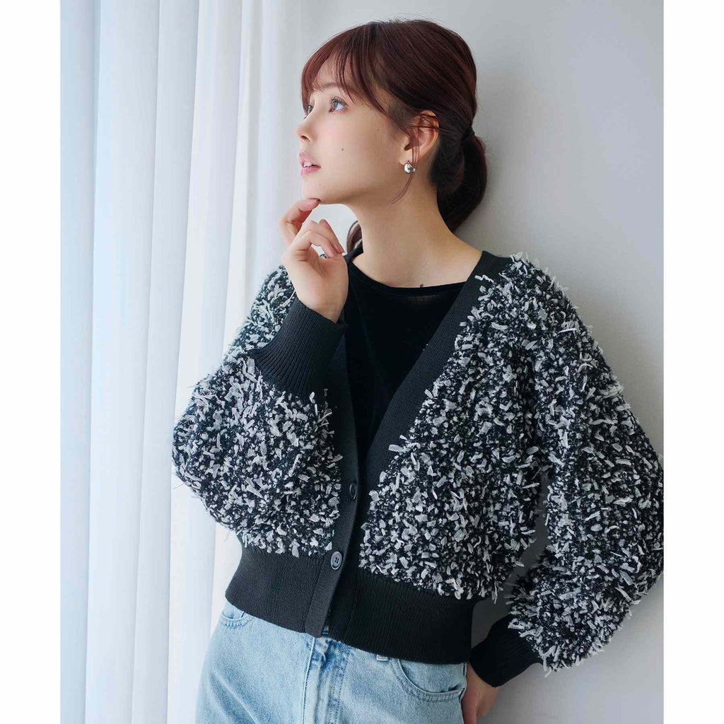 ・チュールフラッグのもこもこの糸を使用した、深Vネックの短丈ニットカーディガンです。