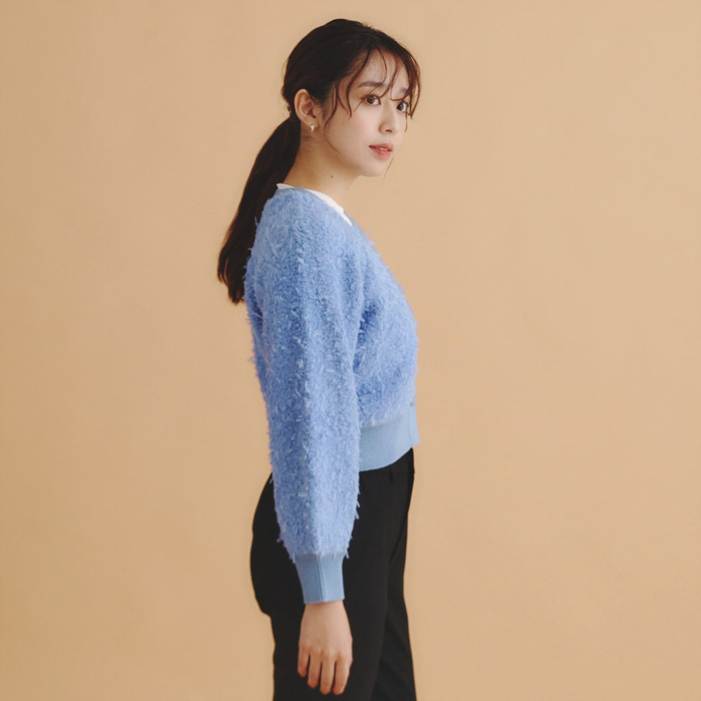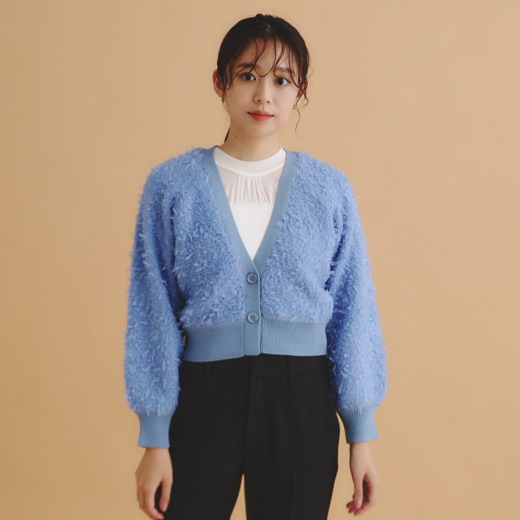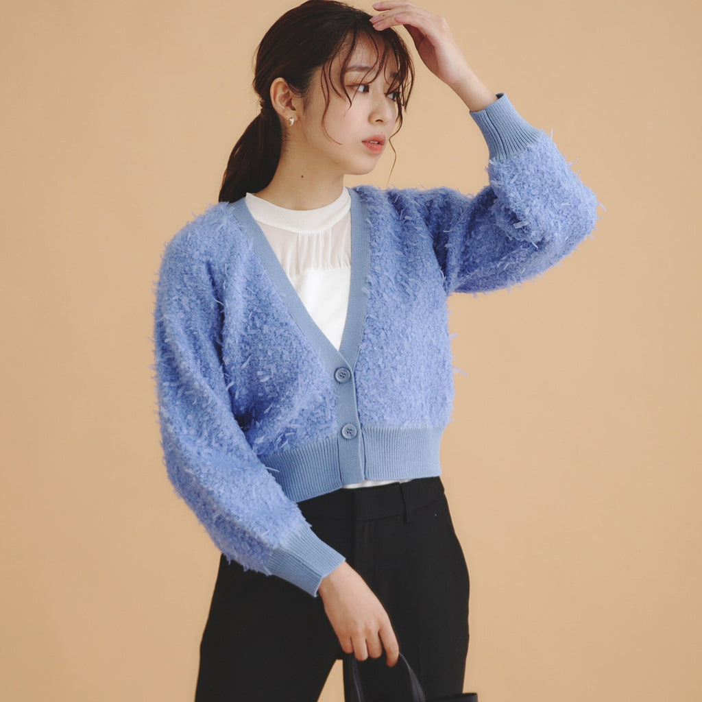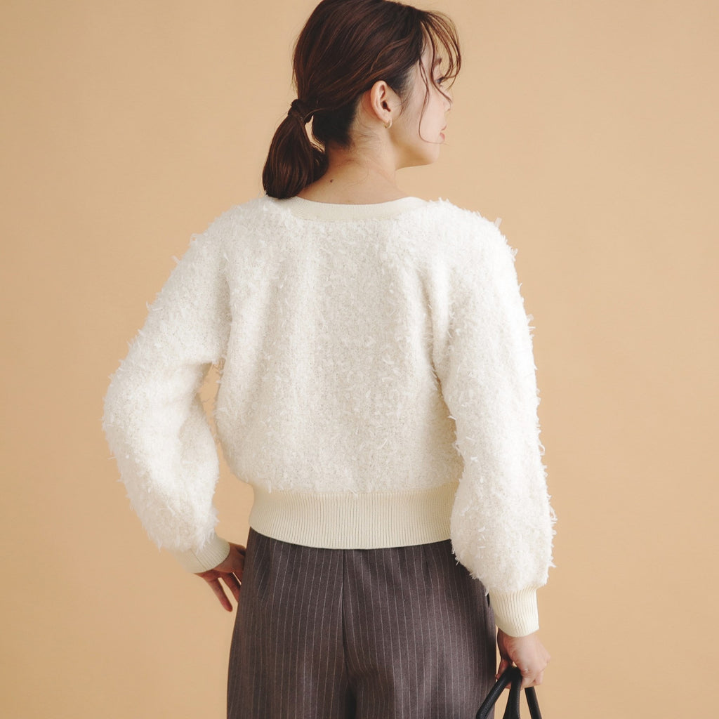 毛足の長いチュールフラッグのもこもこが可愛いVネックカーディガン