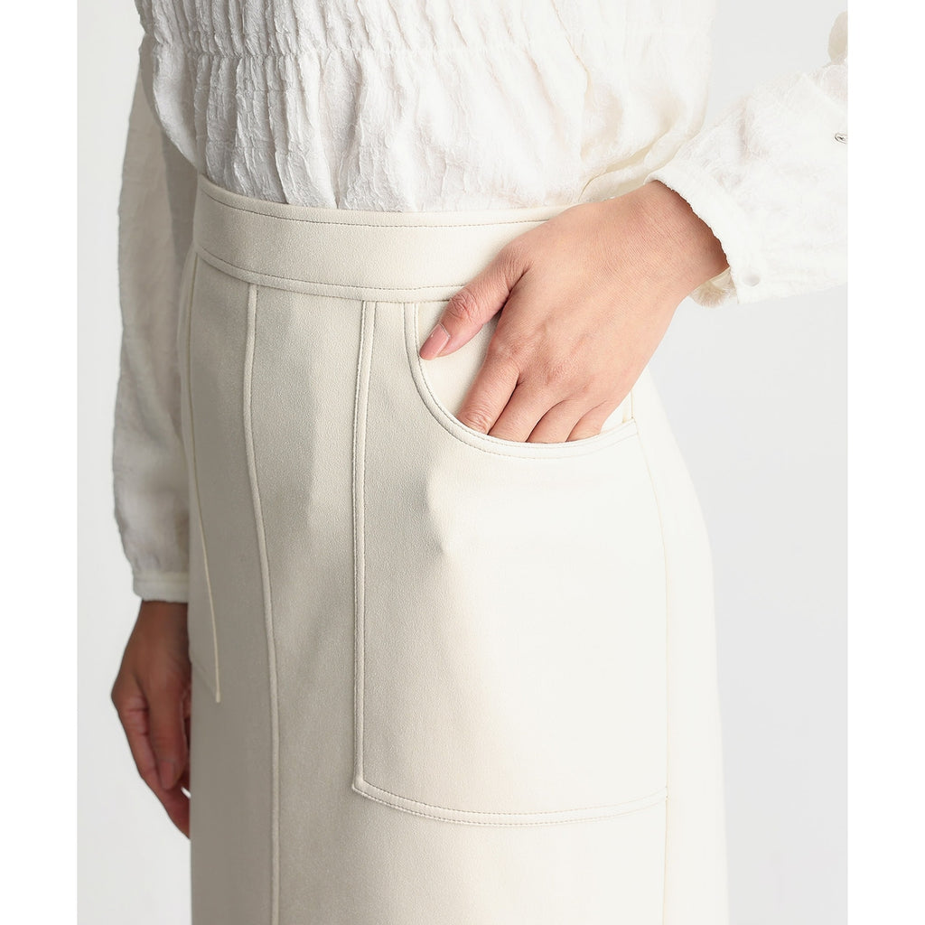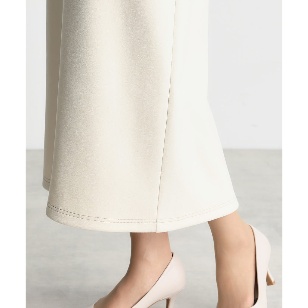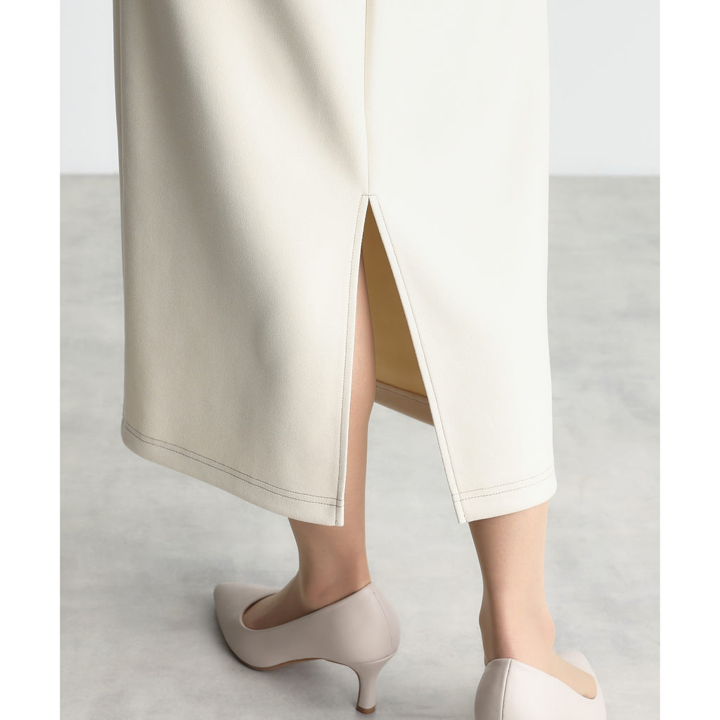 まるでレザーのようにプリントされた質感が印象的なスカートは、タイトなシルエットが美しいラインを生み出します。