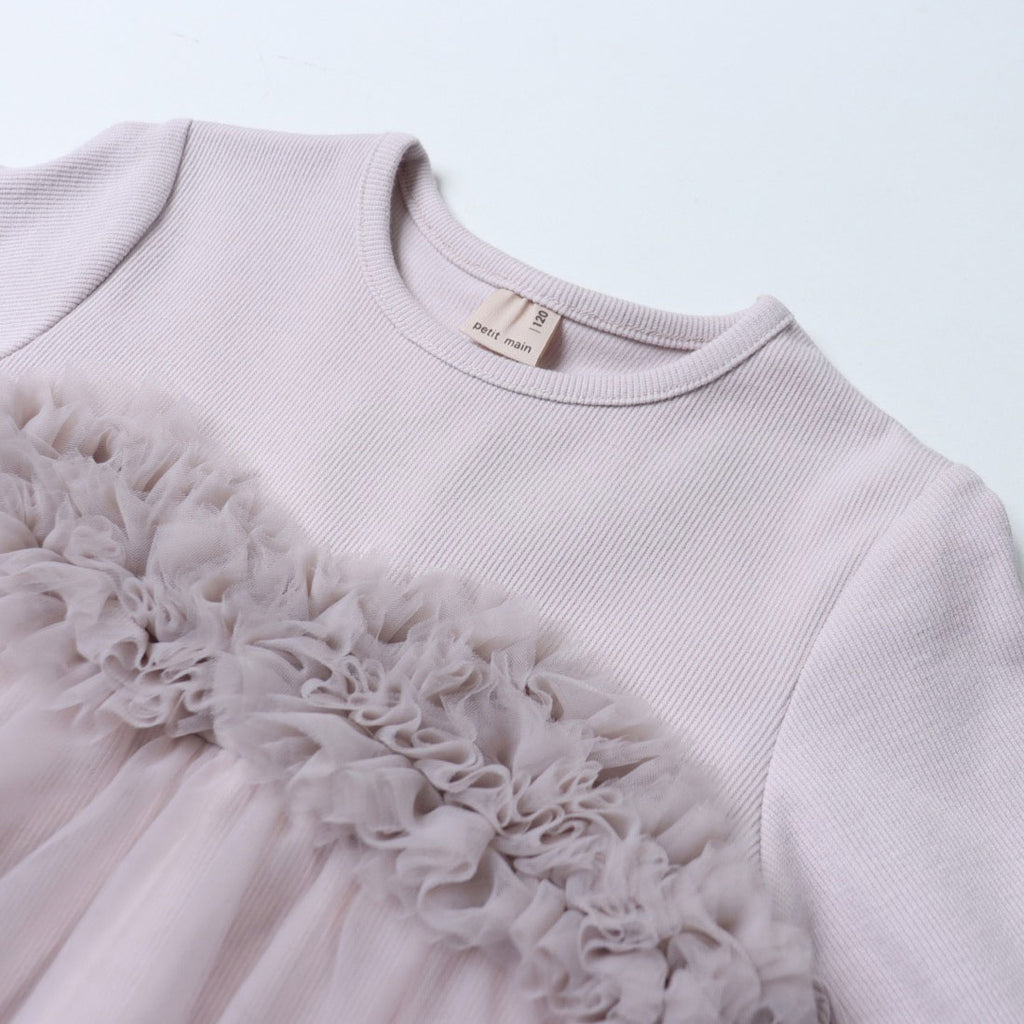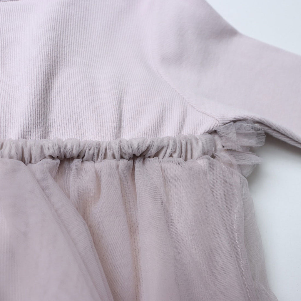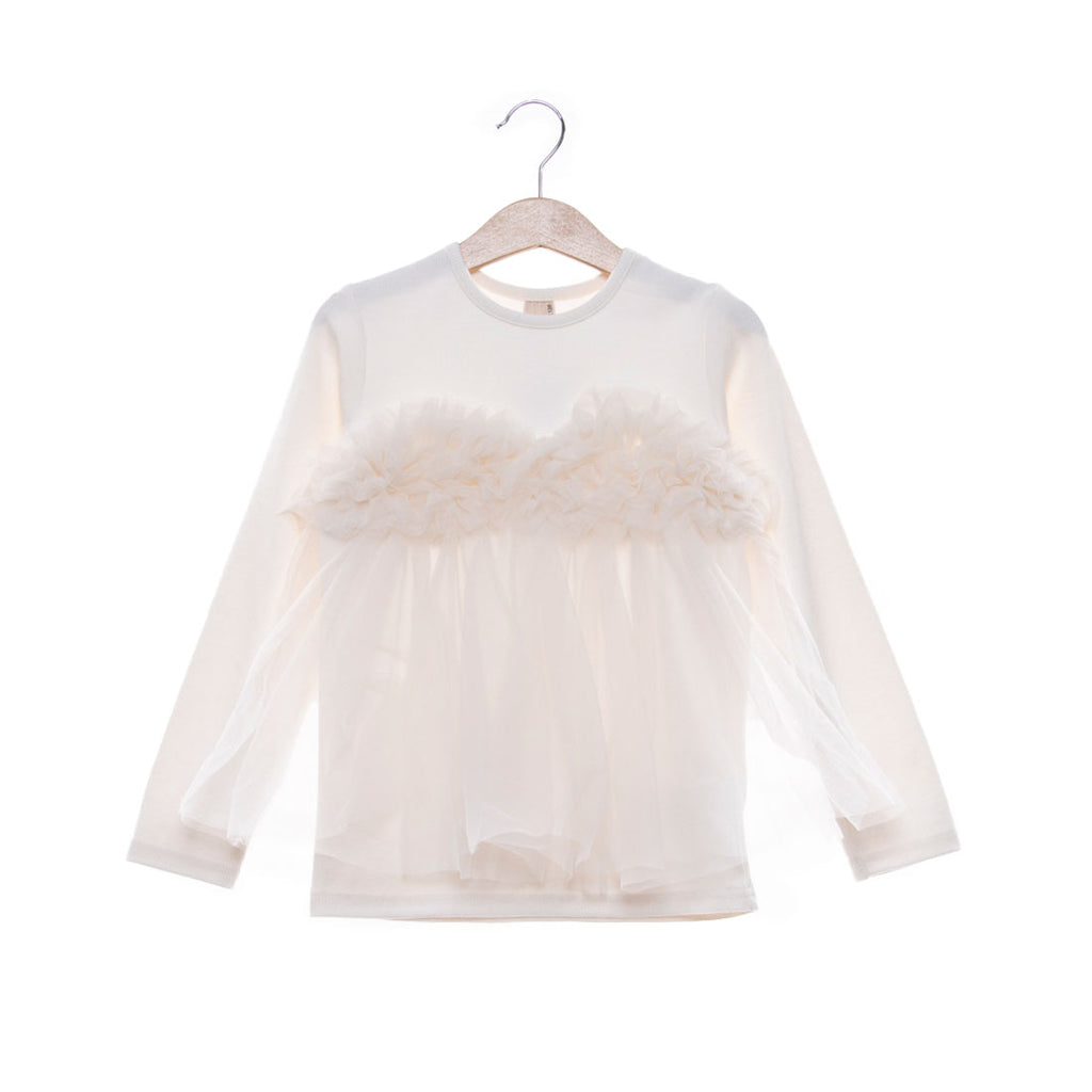 ぐるりと巻きついたチュールが華やかな長袖Tシャツです。