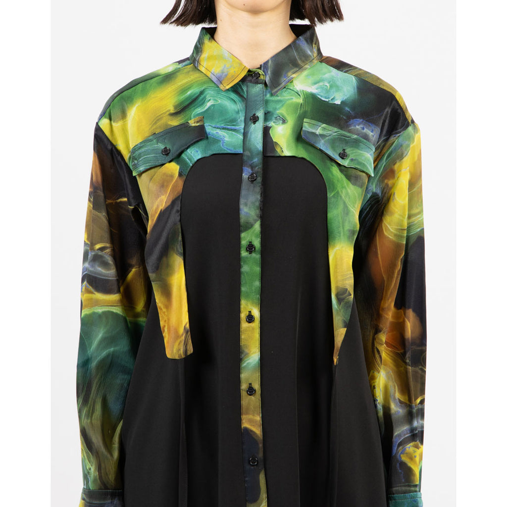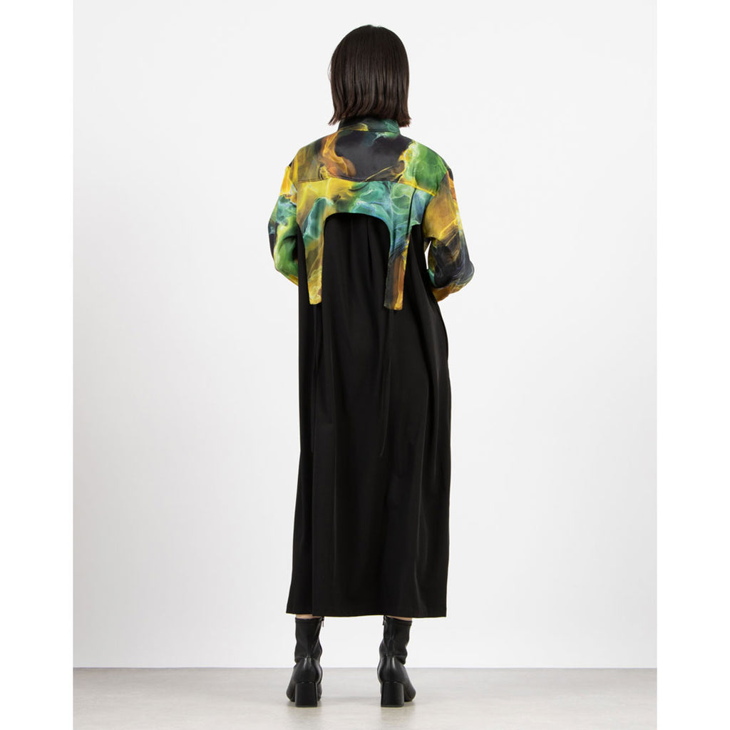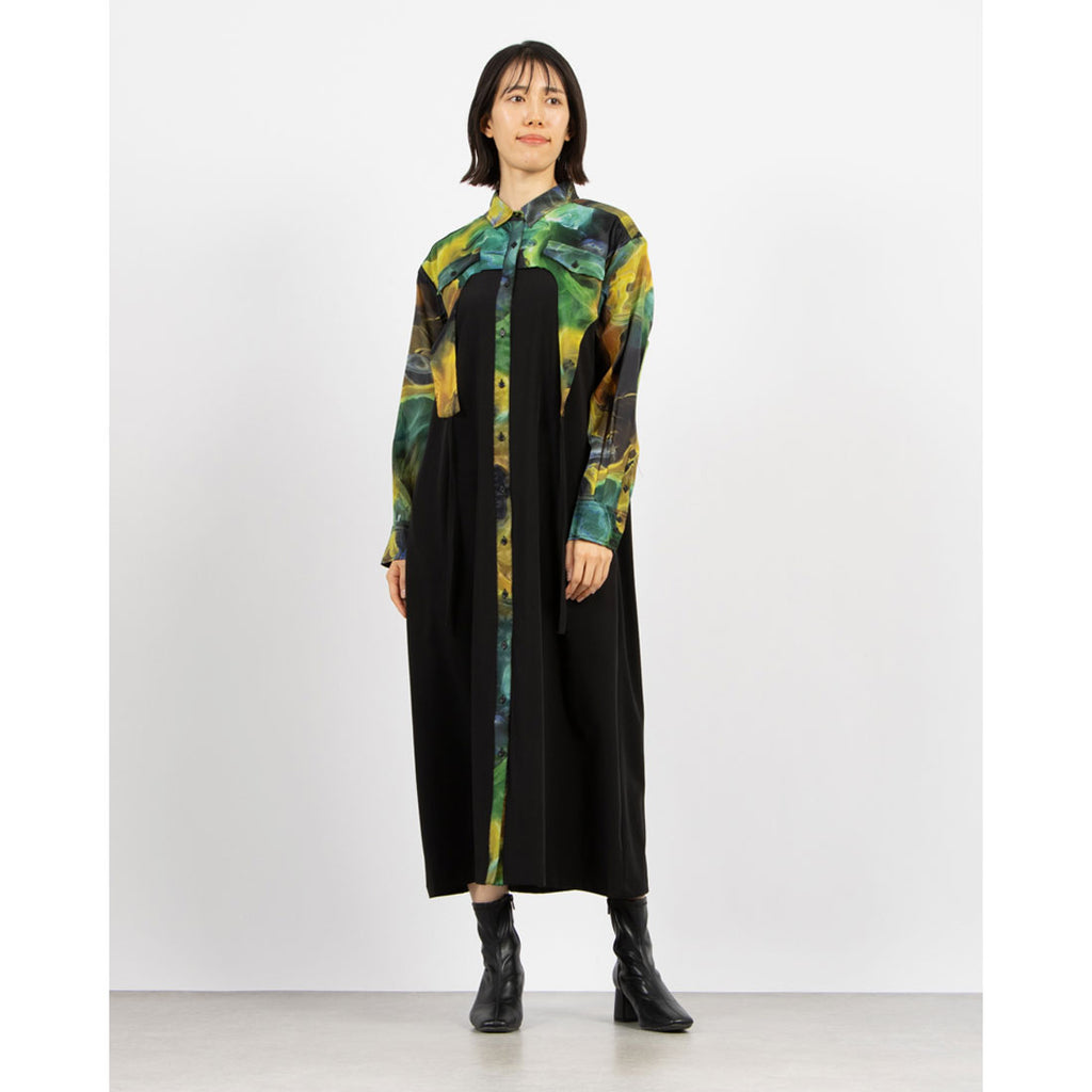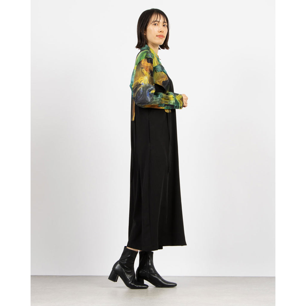 大胆なアート柄とシックなブラックの組み合わせが印象的なワンピース。