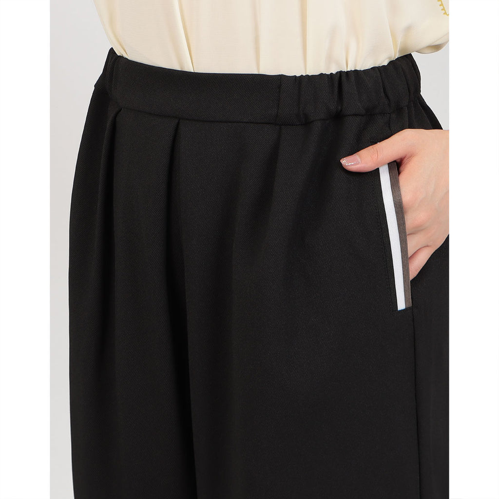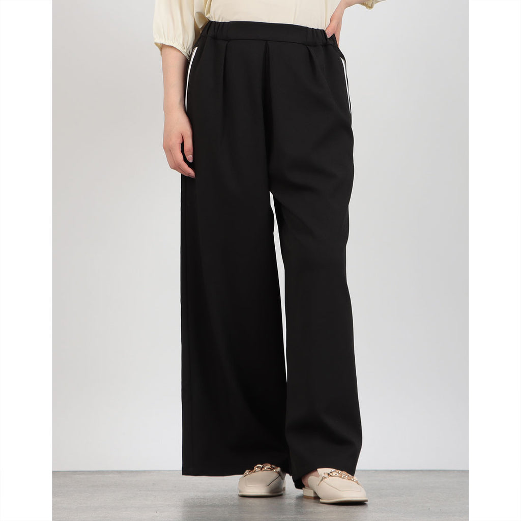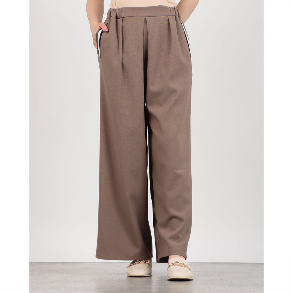 伸縮性のあるウエストで快適な履き心地を実現し、サイドポケットのラインがアクセントに。