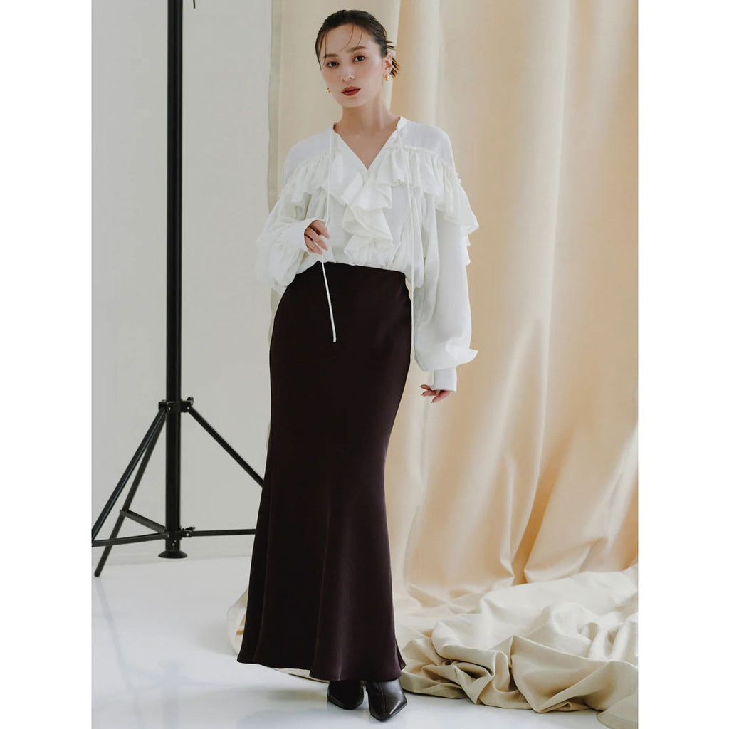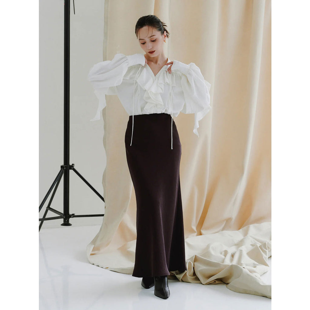ヨークラインに沿って大胆にあしらわせたラッフルが女性らしさを最大限にひき出してくれ、お顔まわりを華やかに見せてくれます。