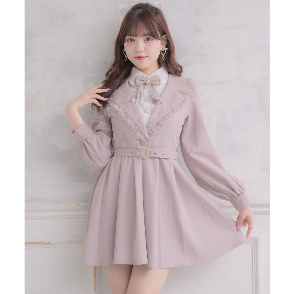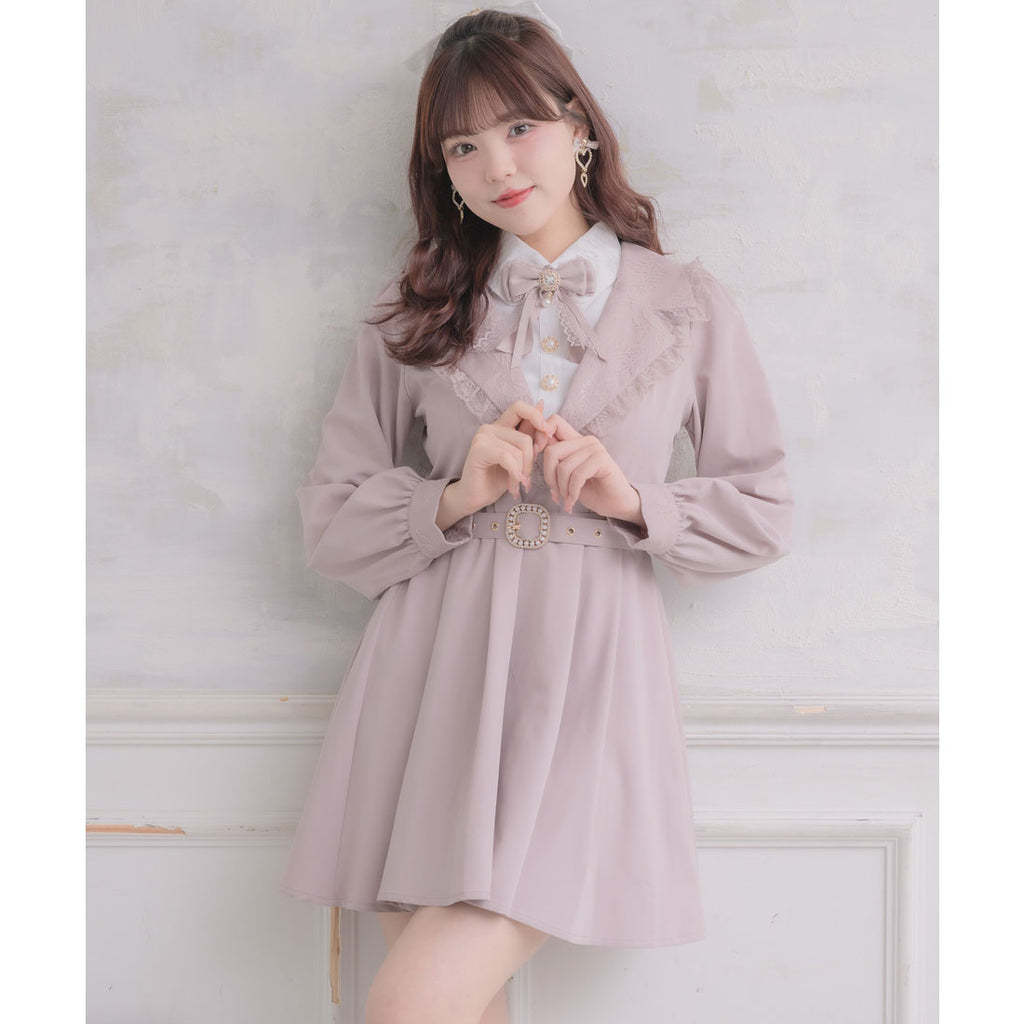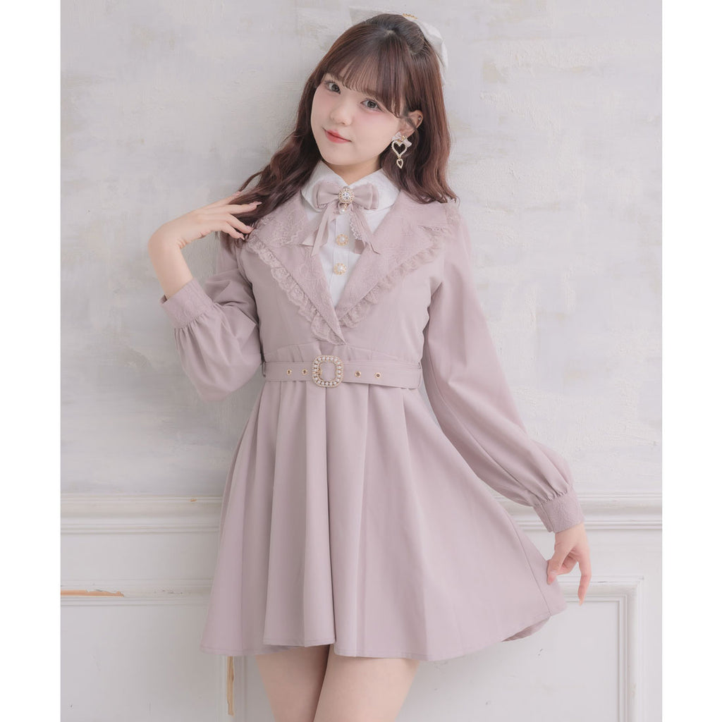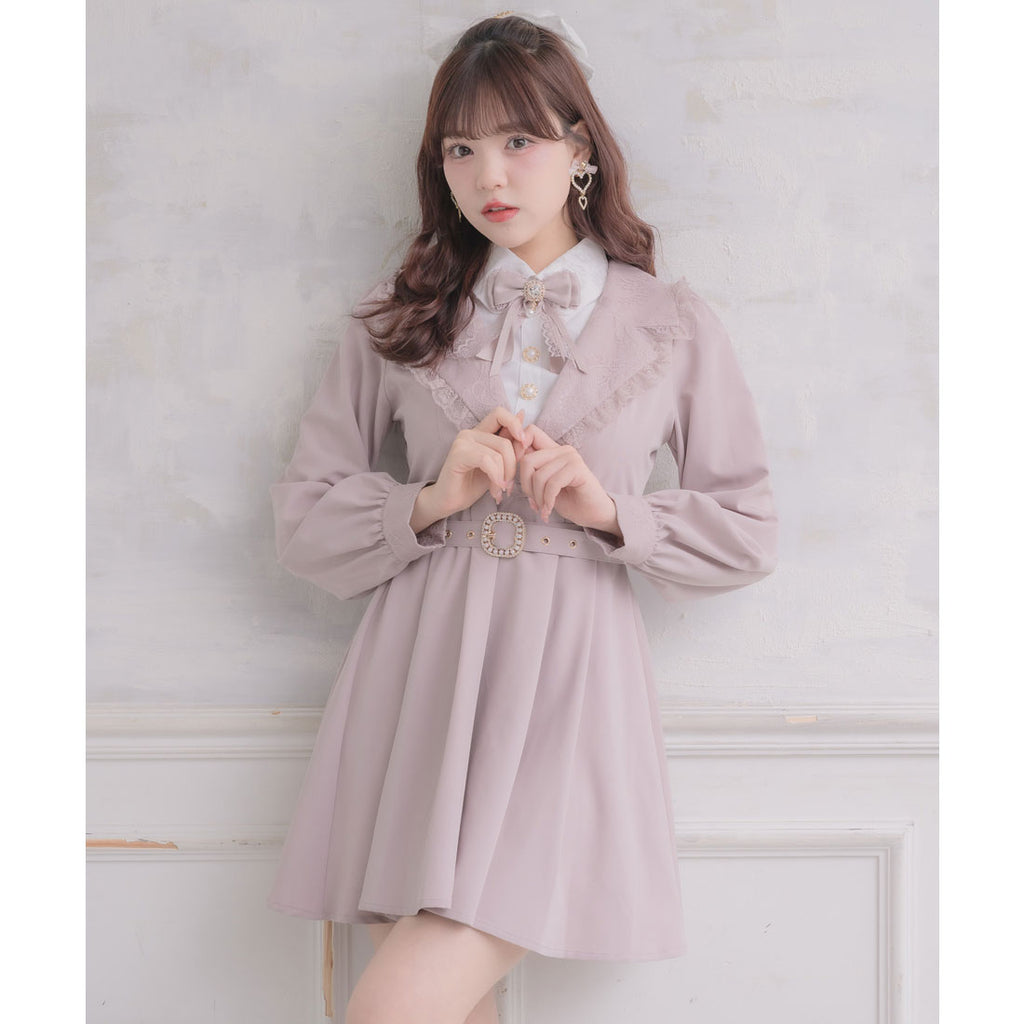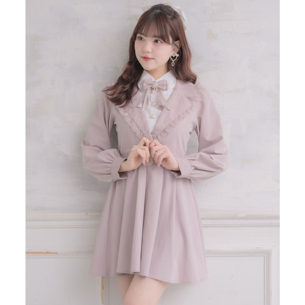 大きめのテーラー衿にあしらわれた繊細なレースが、クラシカルで上品な雰囲気を演出。