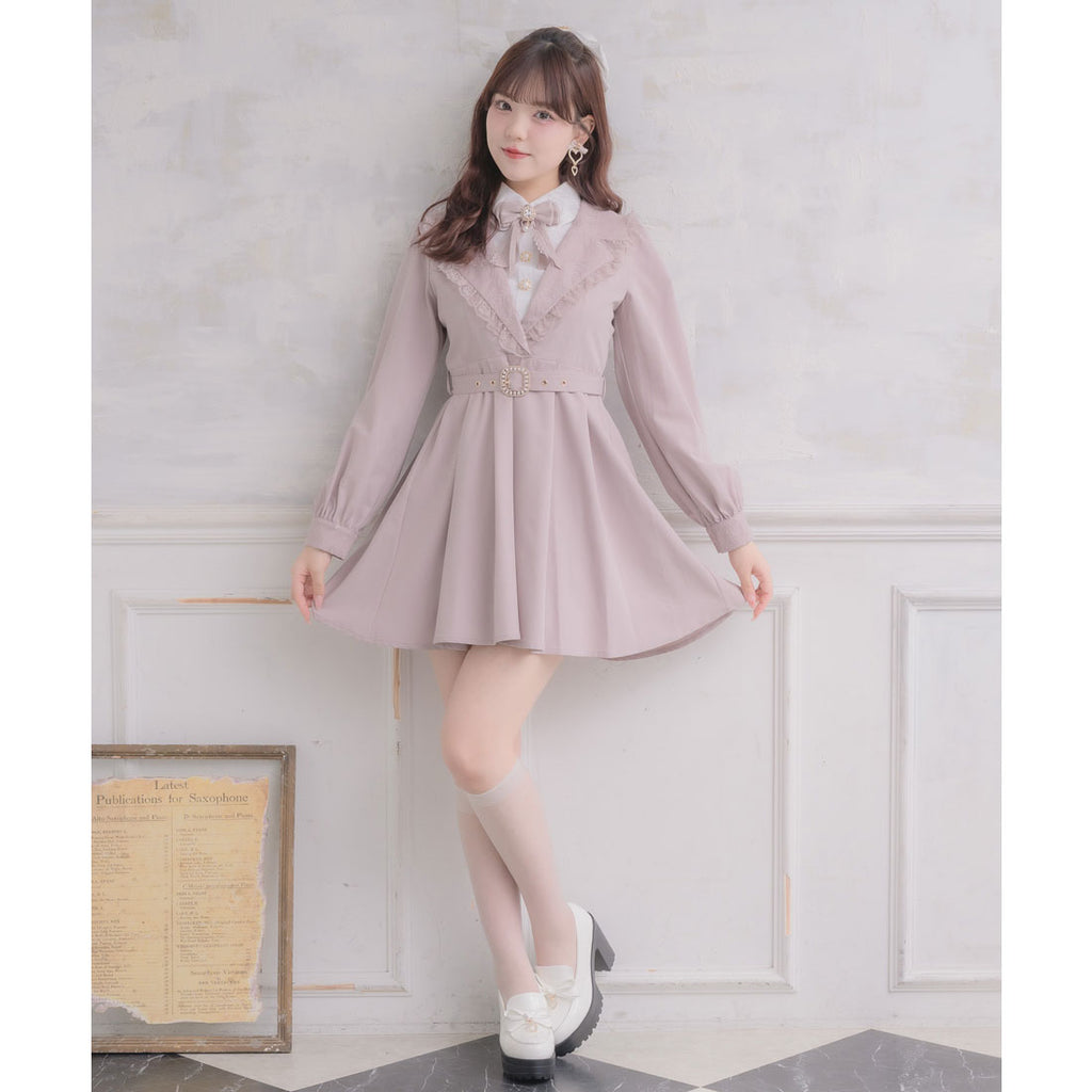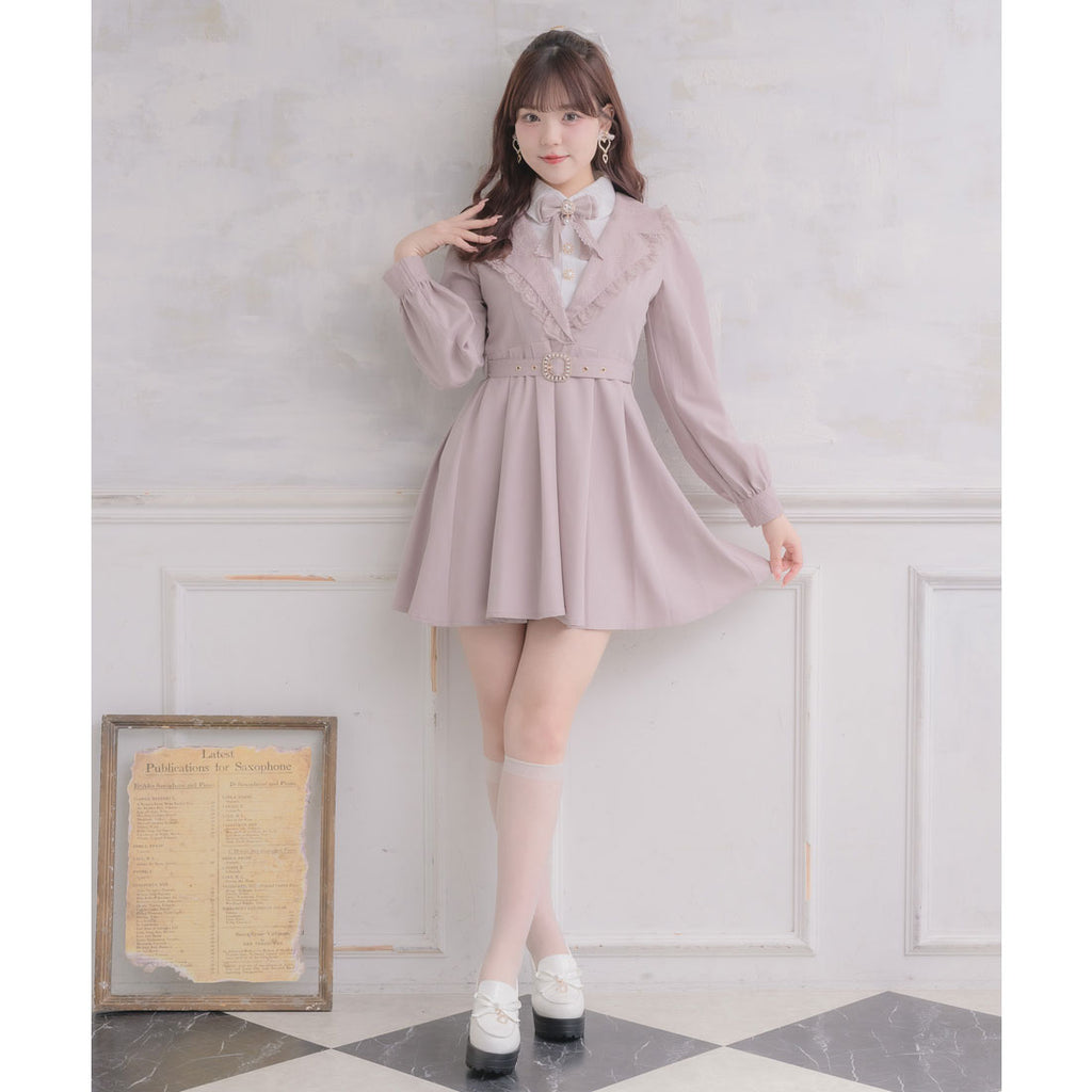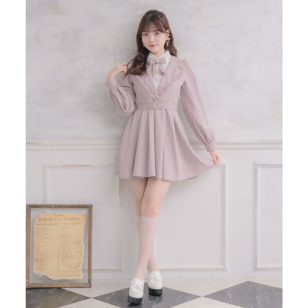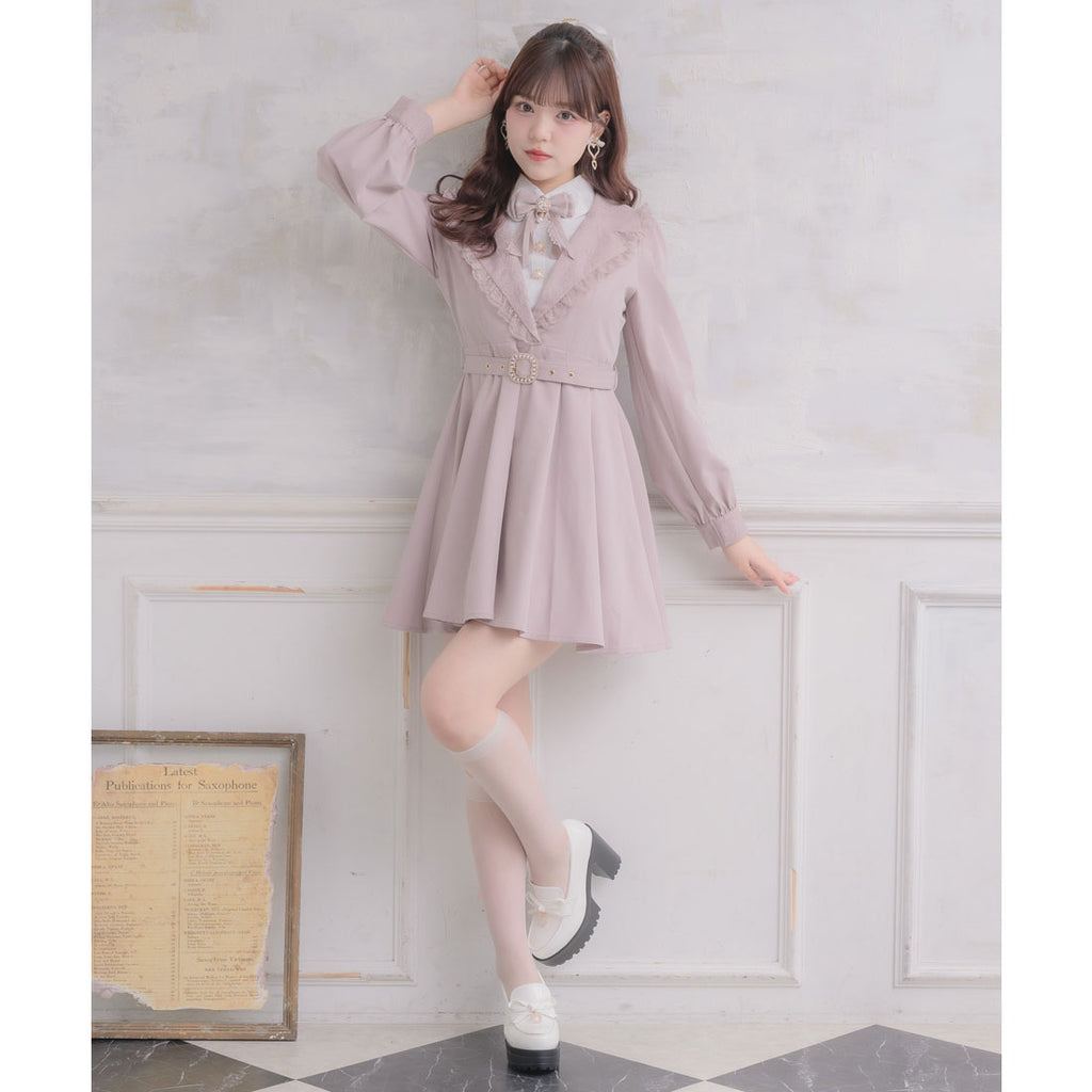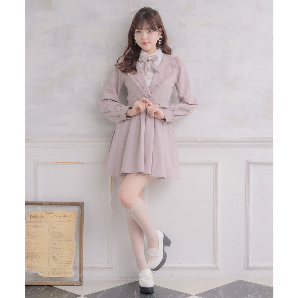 胸元にはパールボタンとリボンブローチがきらりと輝いて、さりげなく視線を集めます。