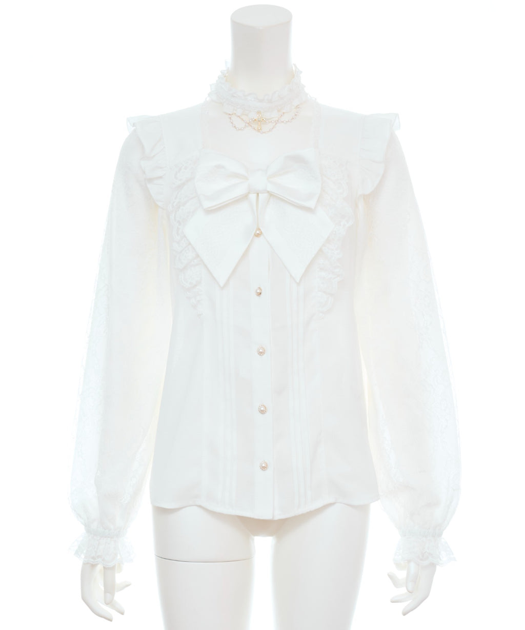 クロス×パールチェーン付きチョーカーが、スタイリングを華やかに彩ります♪レースを重ねた大ぶりのリボンや、透け感のあるレース袖が可愛さを引き立てる☆