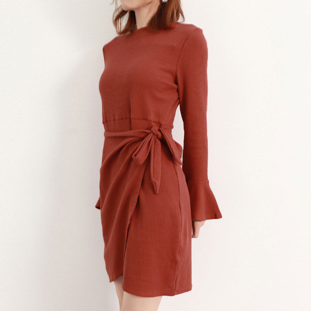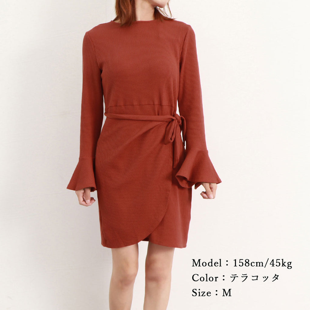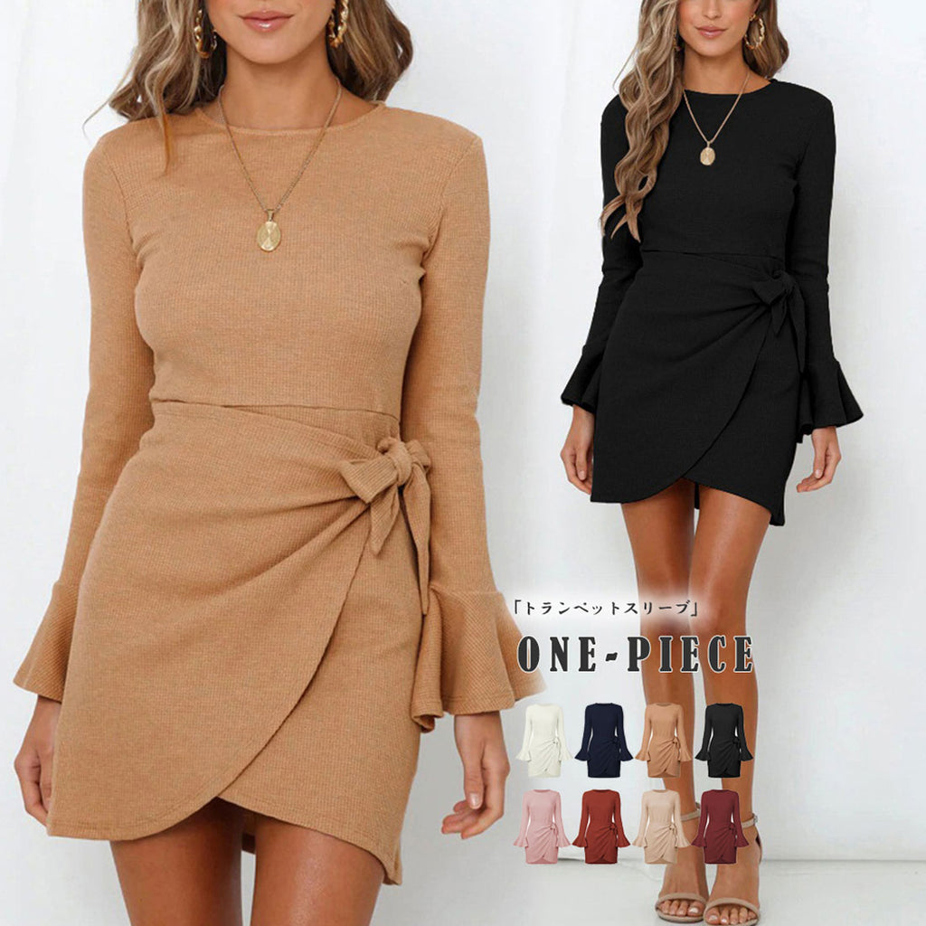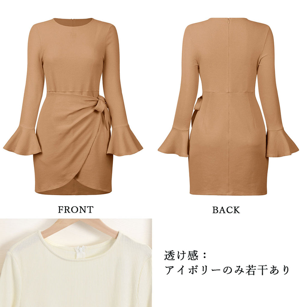 ニットワンピース 大人女性 きれいめワンピ 長袖 リボンウエストマーク タイトワンピース 無地秋冬 フェミニン デート服