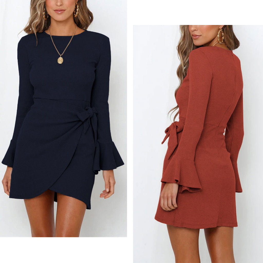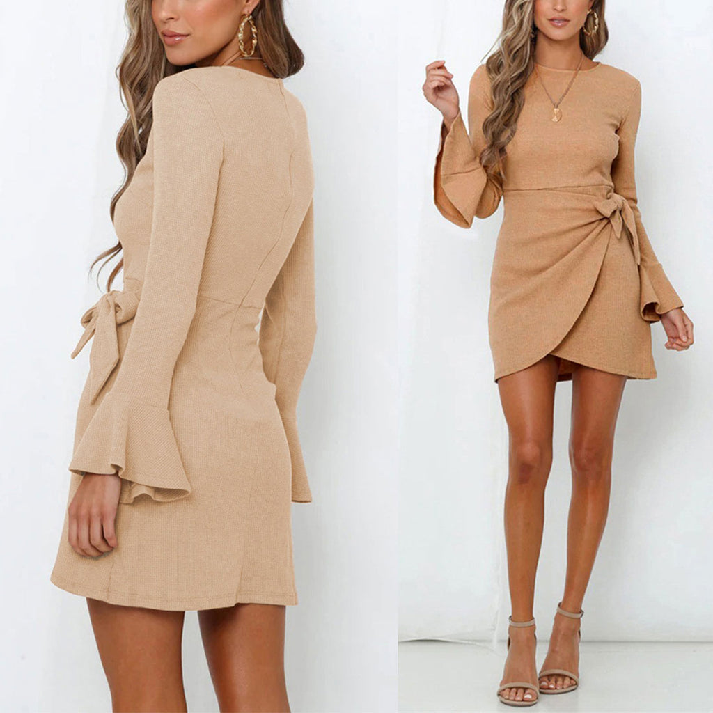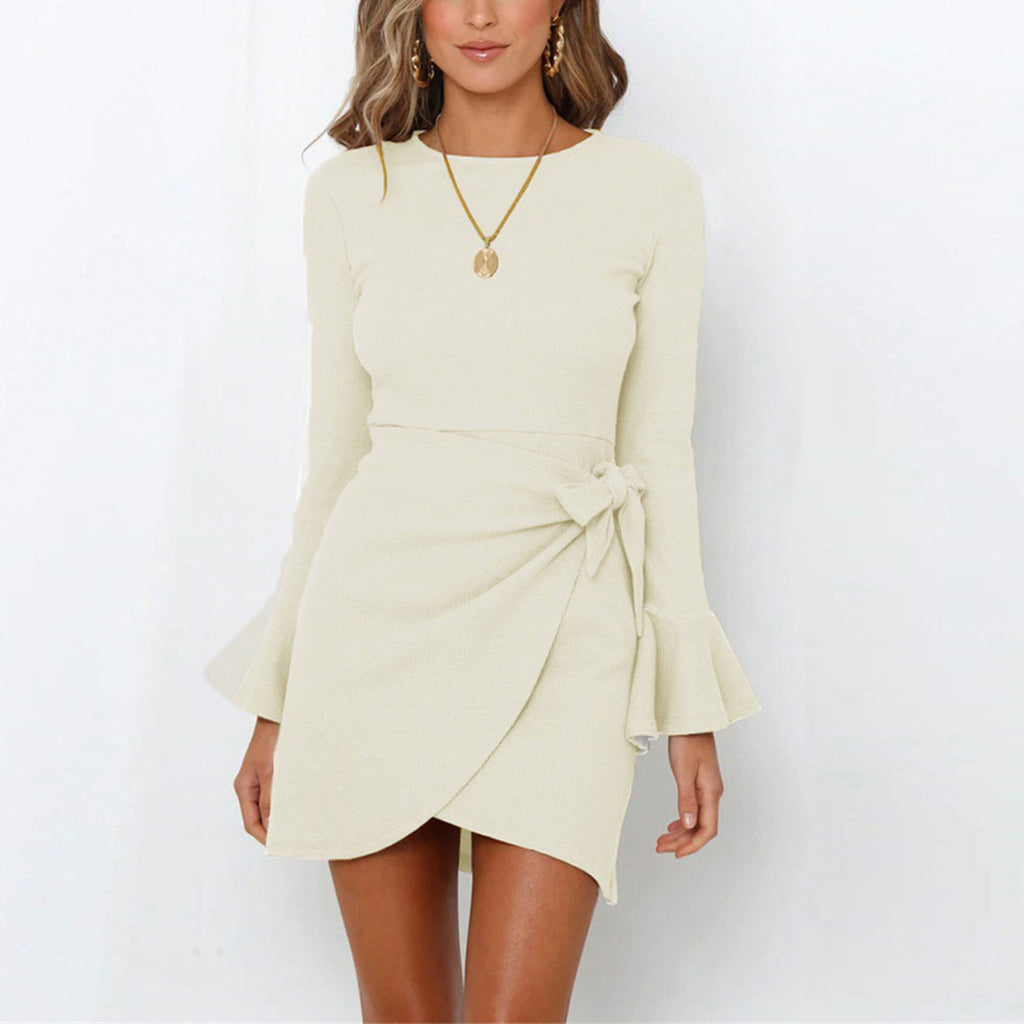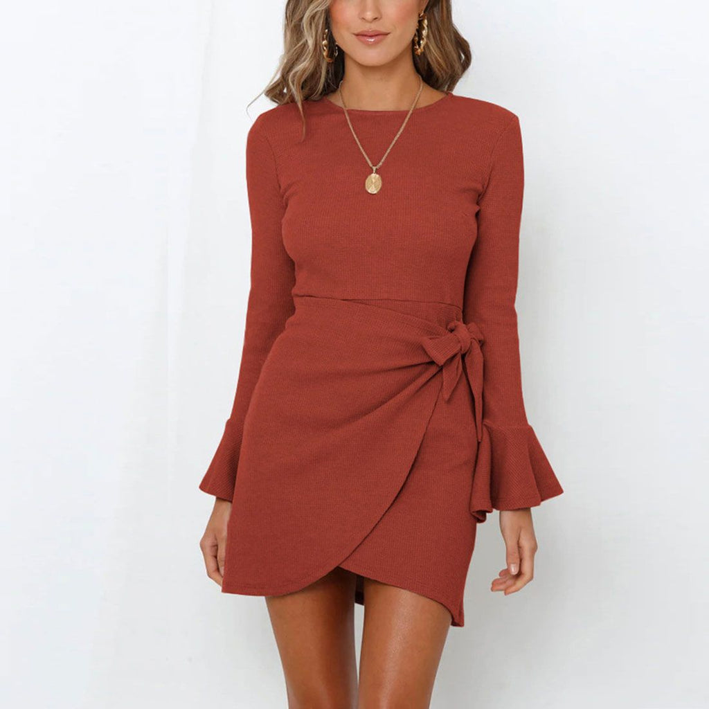 ニットワンピース 大人女性 きれいめワンピ 長袖 リボンウエストマーク タイトワンピース 無地秋冬 フェミニン デート服