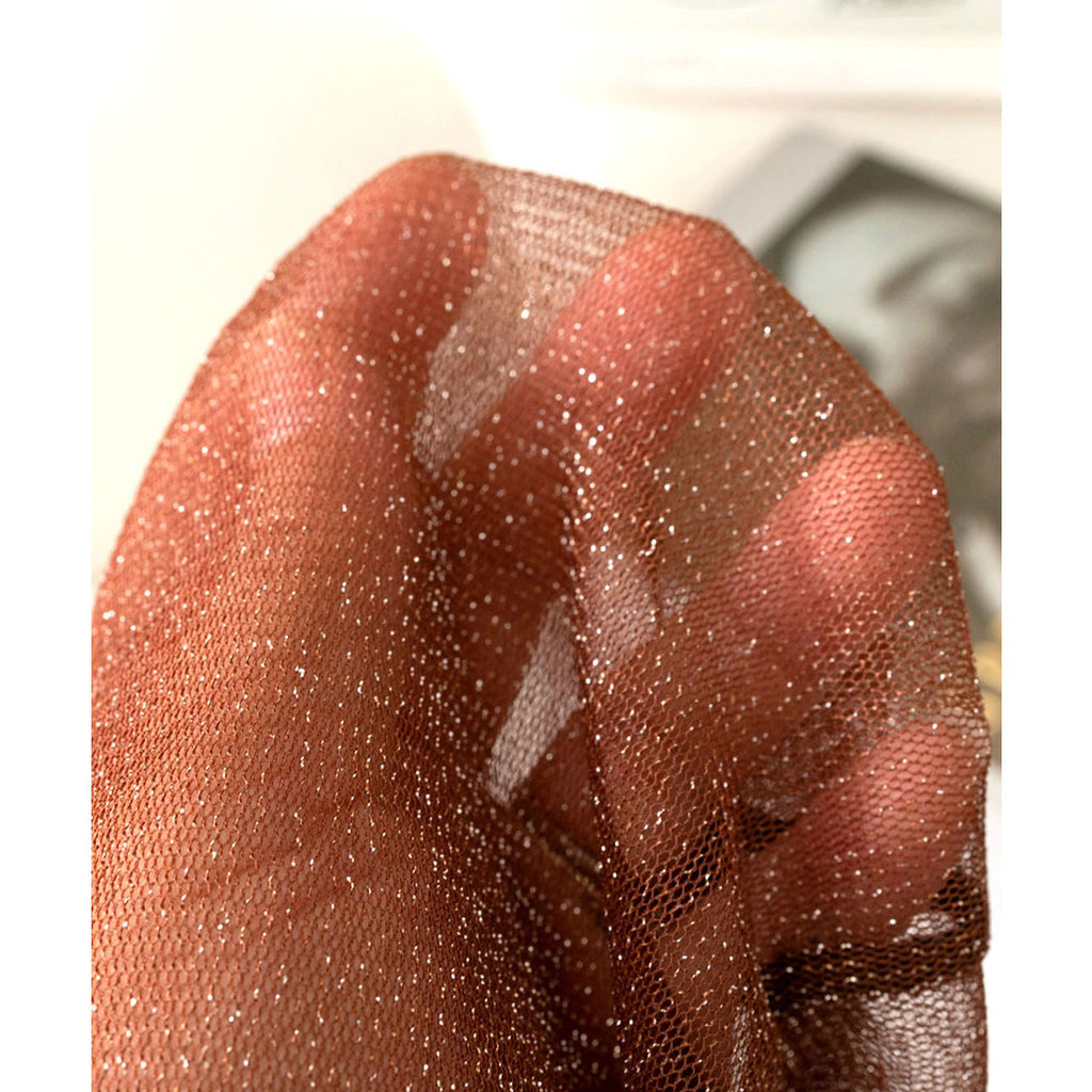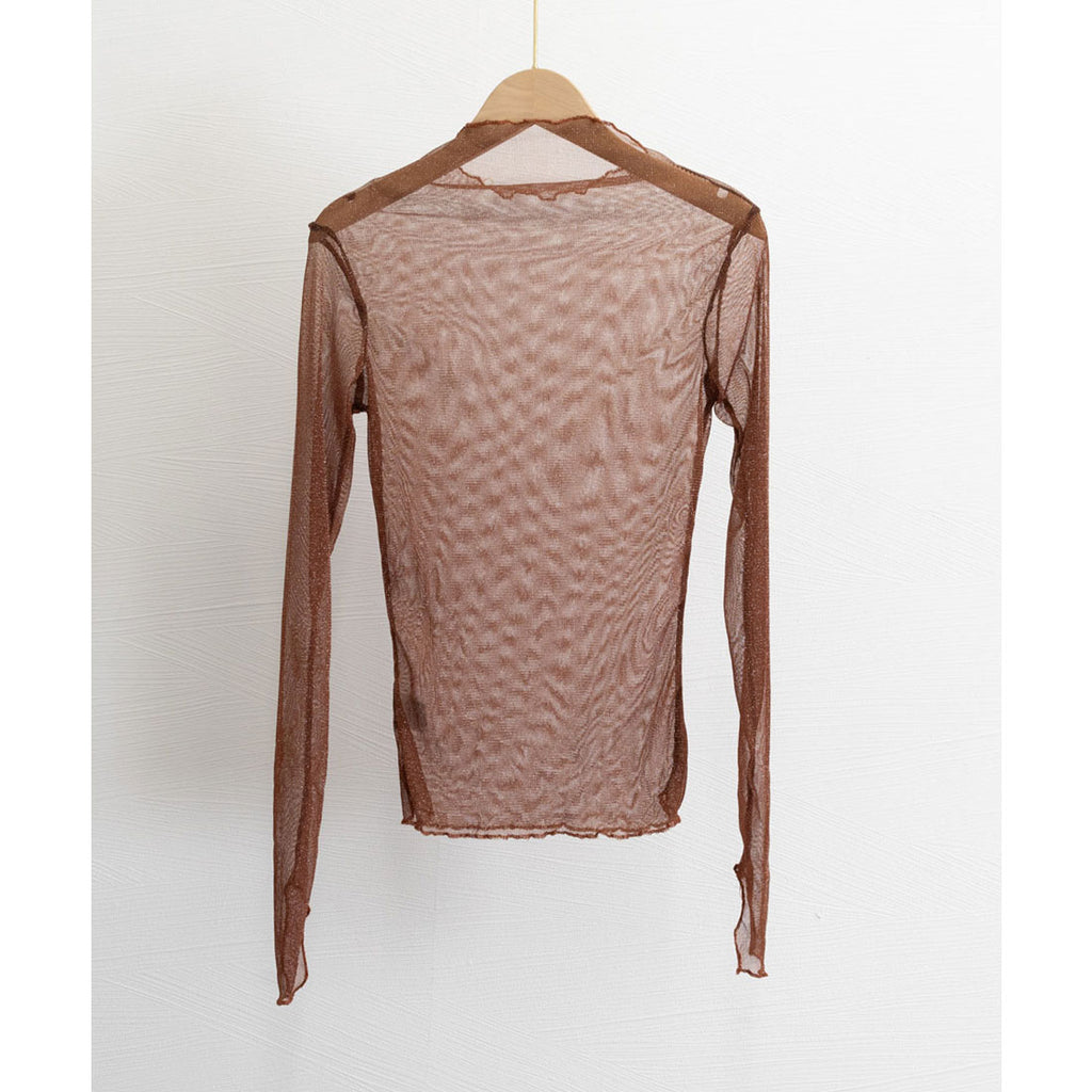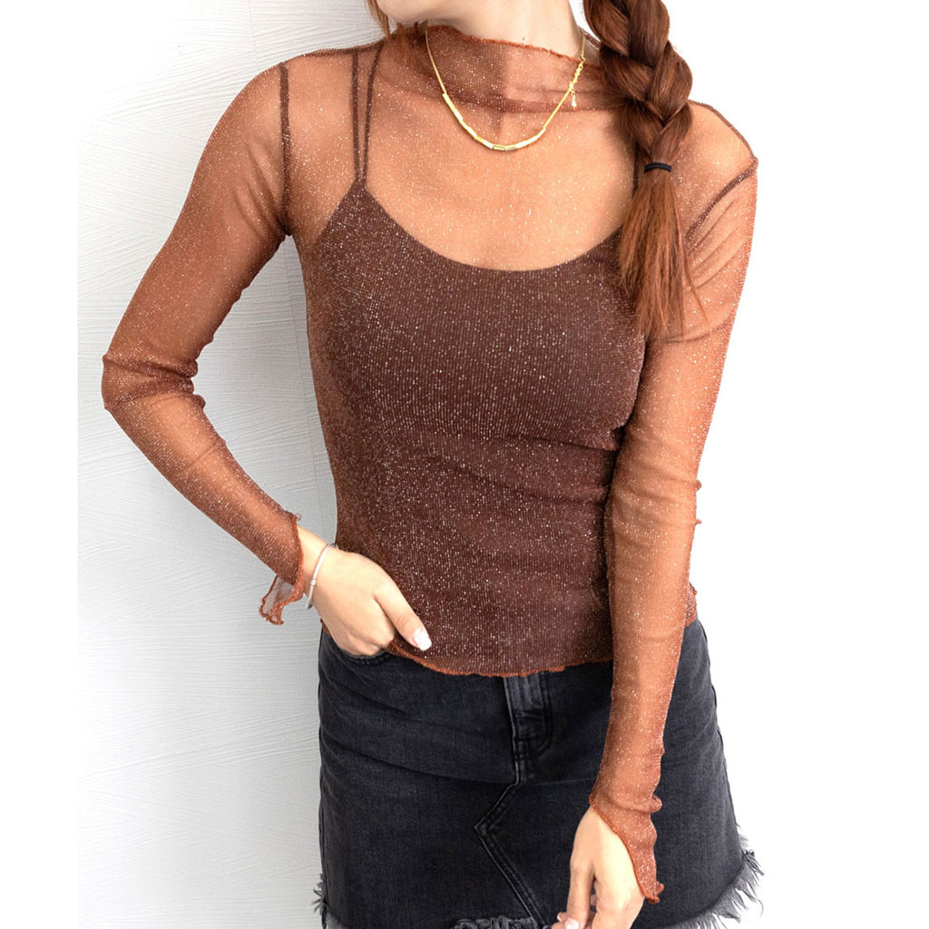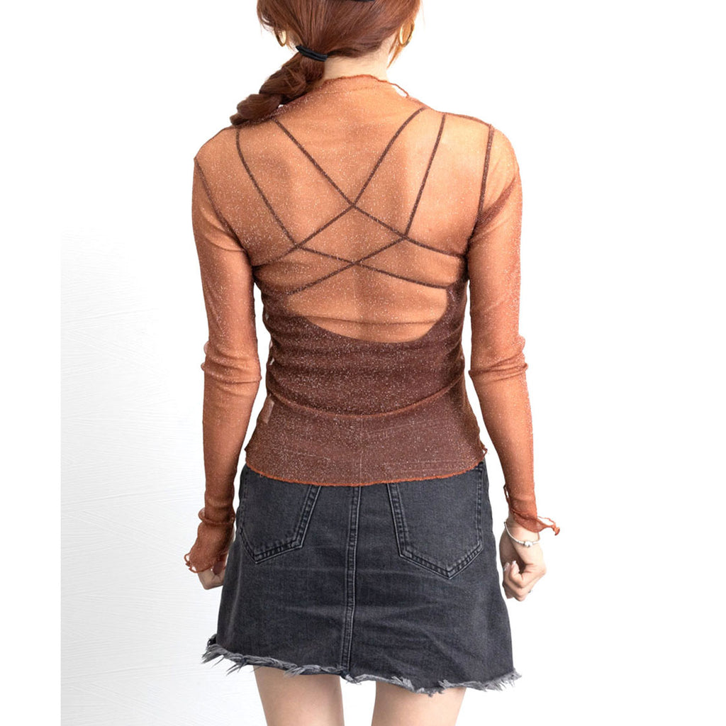 ラメ感のあるデザインでコーディネートを華やかに仕上げるシースルートップス