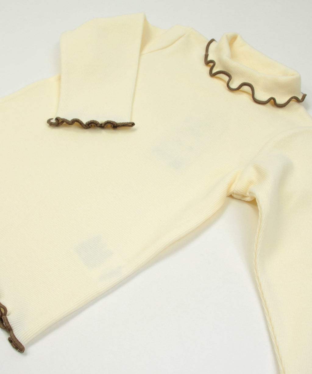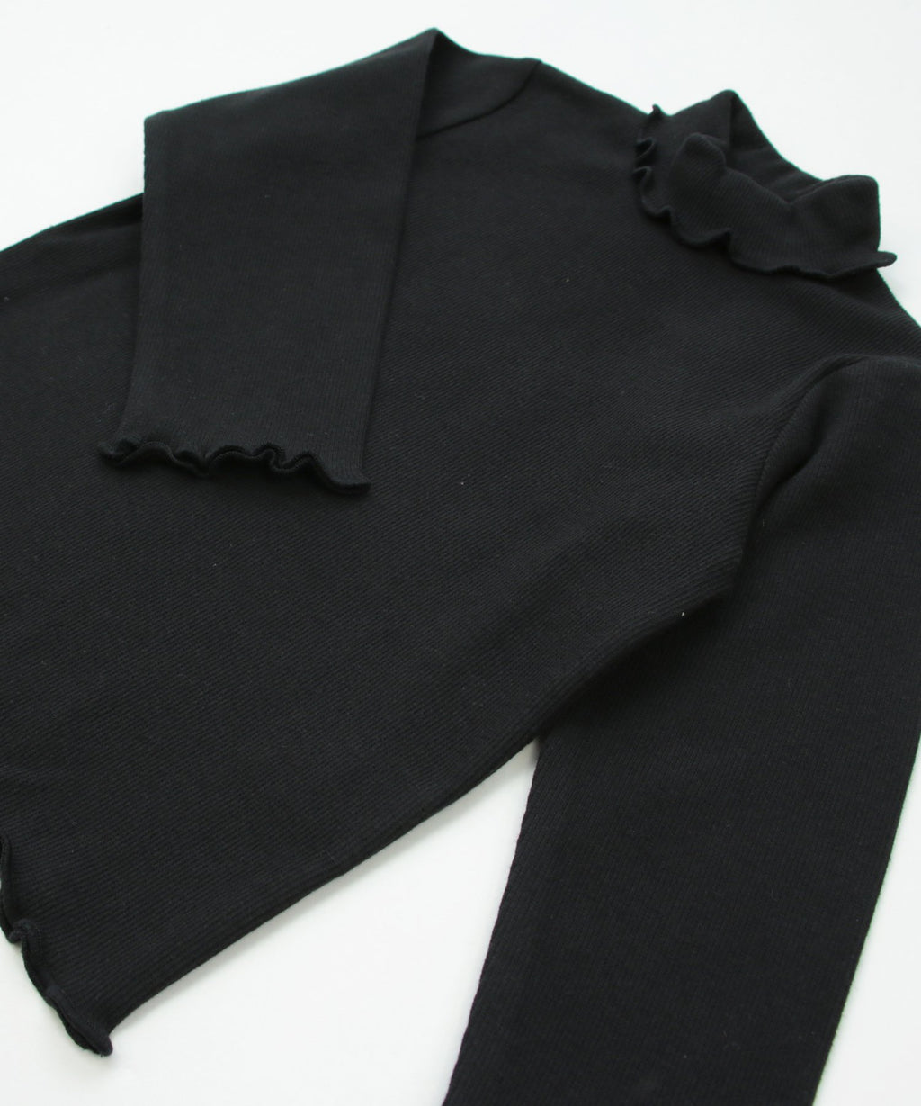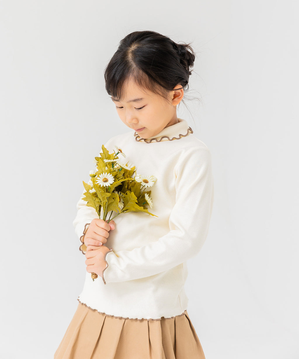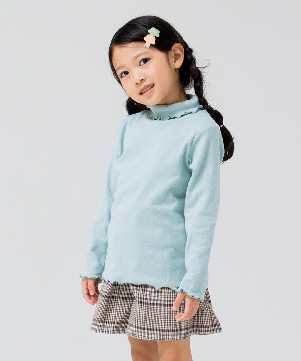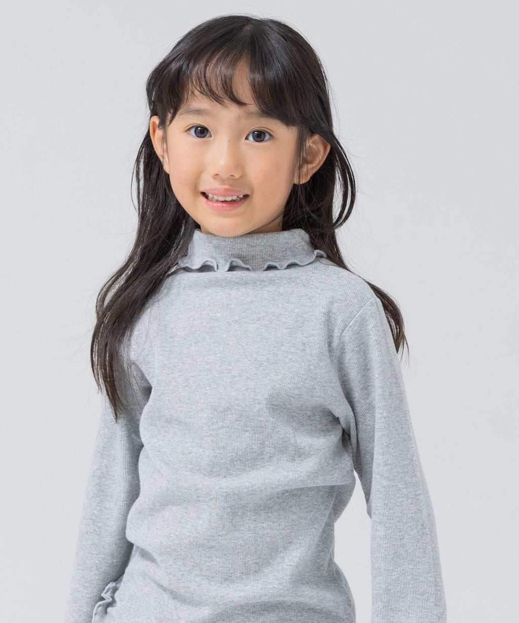 選べるカラーバリエーションが魅力★リブハイネックカットソー。柔らかくストレッチの効いた生地でフィット感があり、着心地はバツグン。丸みがある襟元と袖口・裾はかわいらしいメロー仕立て♪デイリーコーデはもちろんおしゃれ着との相性も◎