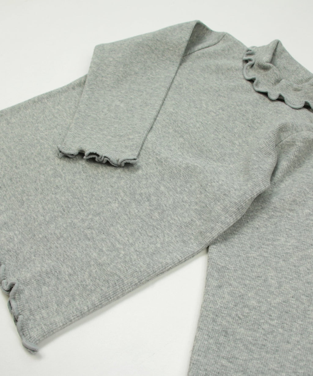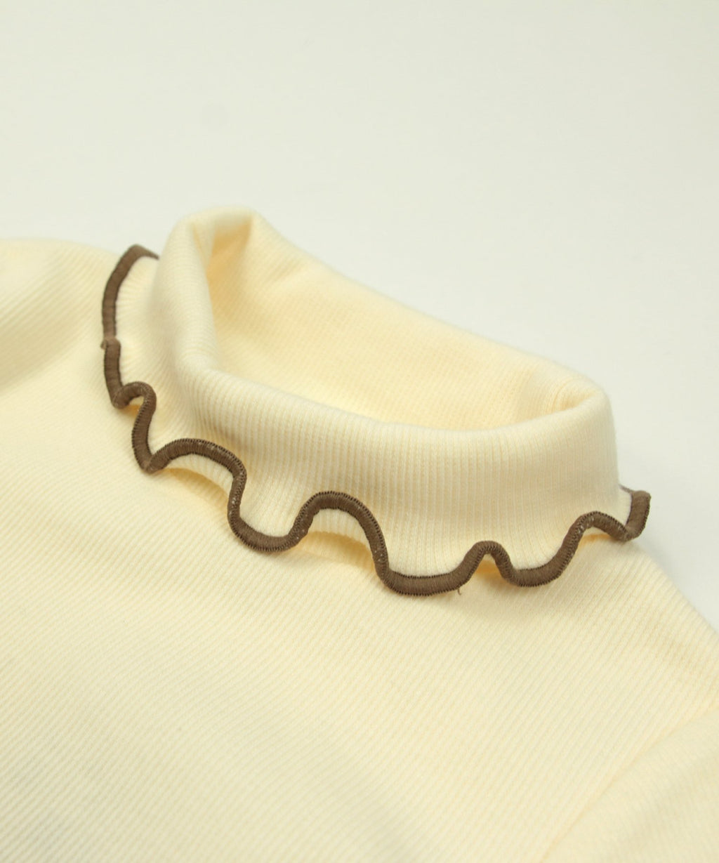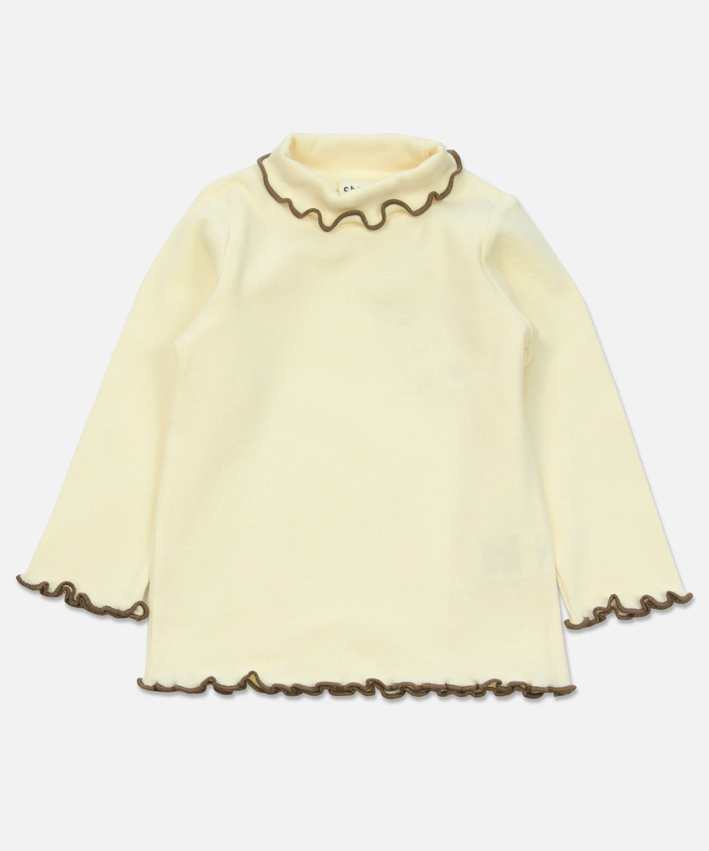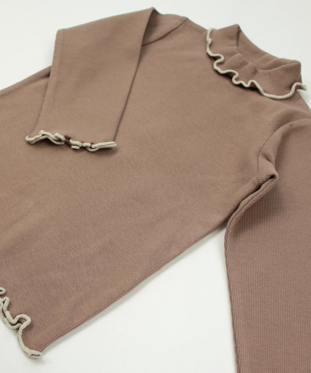 選べるカラーバリエーションが魅力★リブハイネックカットソー。柔らかくストレッチの効いた生地でフィット感があり、着心地はバツグン。丸みがある襟元と袖口・裾はかわいらしいメロー仕立て♪デイリーコーデはもちろんおしゃれ着との相性も◎