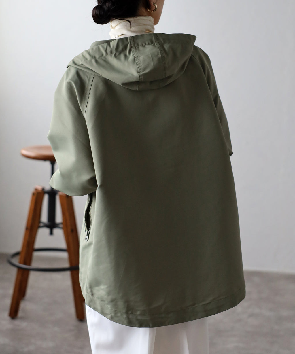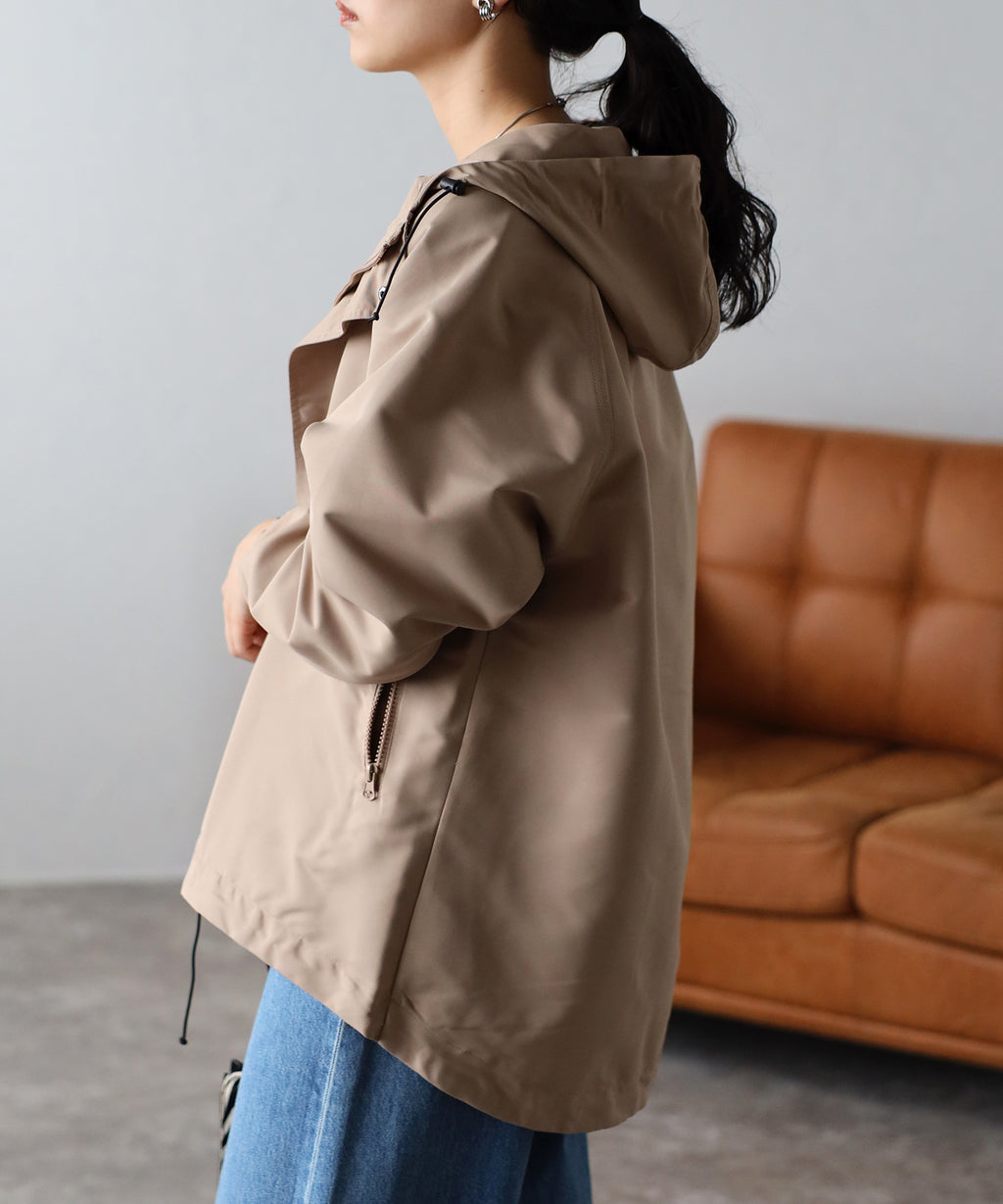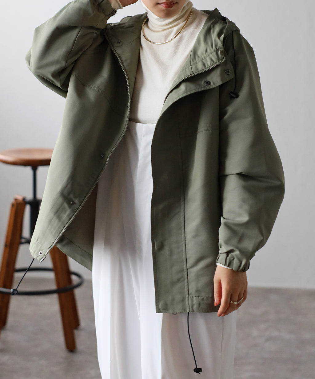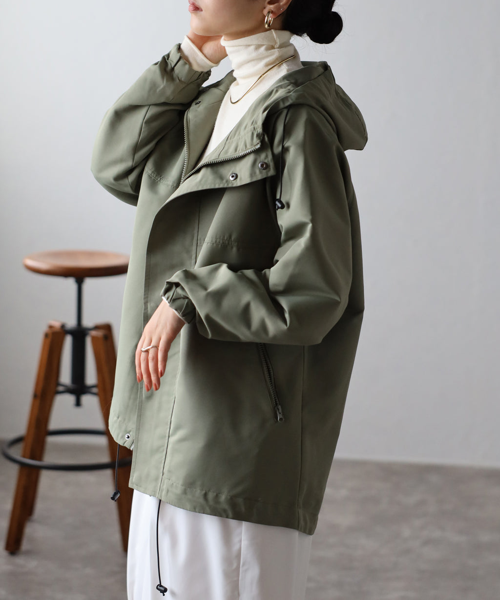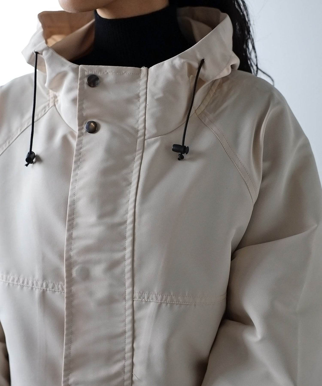 【フード付きマウンテンパーカー】◆季節の変わり目に活躍するライトアウター◆《ディテール》腰周りをカバーしてくれるミドル丈のマウンテンパーカー。ゆったりとしたラグランスリーブは厚手のトップスもINしやすいのが嬉しいポイントです。後ろ下がりのシルエットが女性らしい雰囲気に。袖口はギャザーになっているので捲りやすく、外気の侵入を防いでくれます。フードと裾はコードを絞ることで広がりを調節可能です。《ファブリック》やわらかく肌触りの良いタスラン ポリエステルを使用。空気を含ませることで軽く、程よく薄手なのが特徴。シワになりにくく耐久性があるのでアウターにぴったりの素材です。嫌なツヤ感がなく、ナチュラルな表情に仕上がるのでカジュアル過ぎずに着こなせます。《スタイリング》どんなコーディネートにも合わせやすいプレーンなデザインです。ゆったりとしたオーバーサイジングはタイトなボトムとの相性抜群。毎日のお出掛けにさっと羽織れて便利な一枚です。
