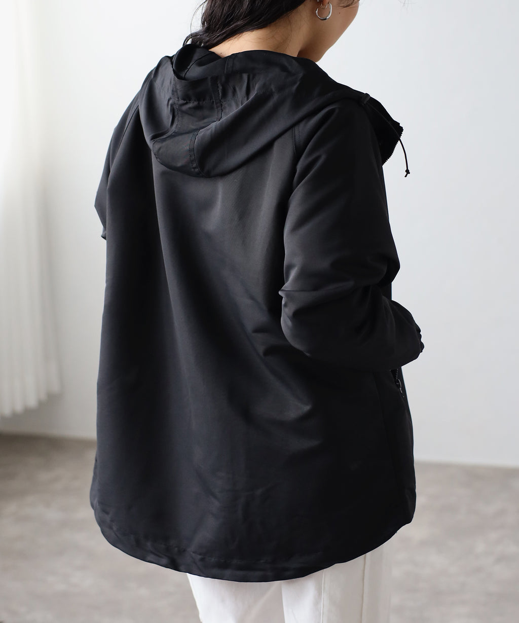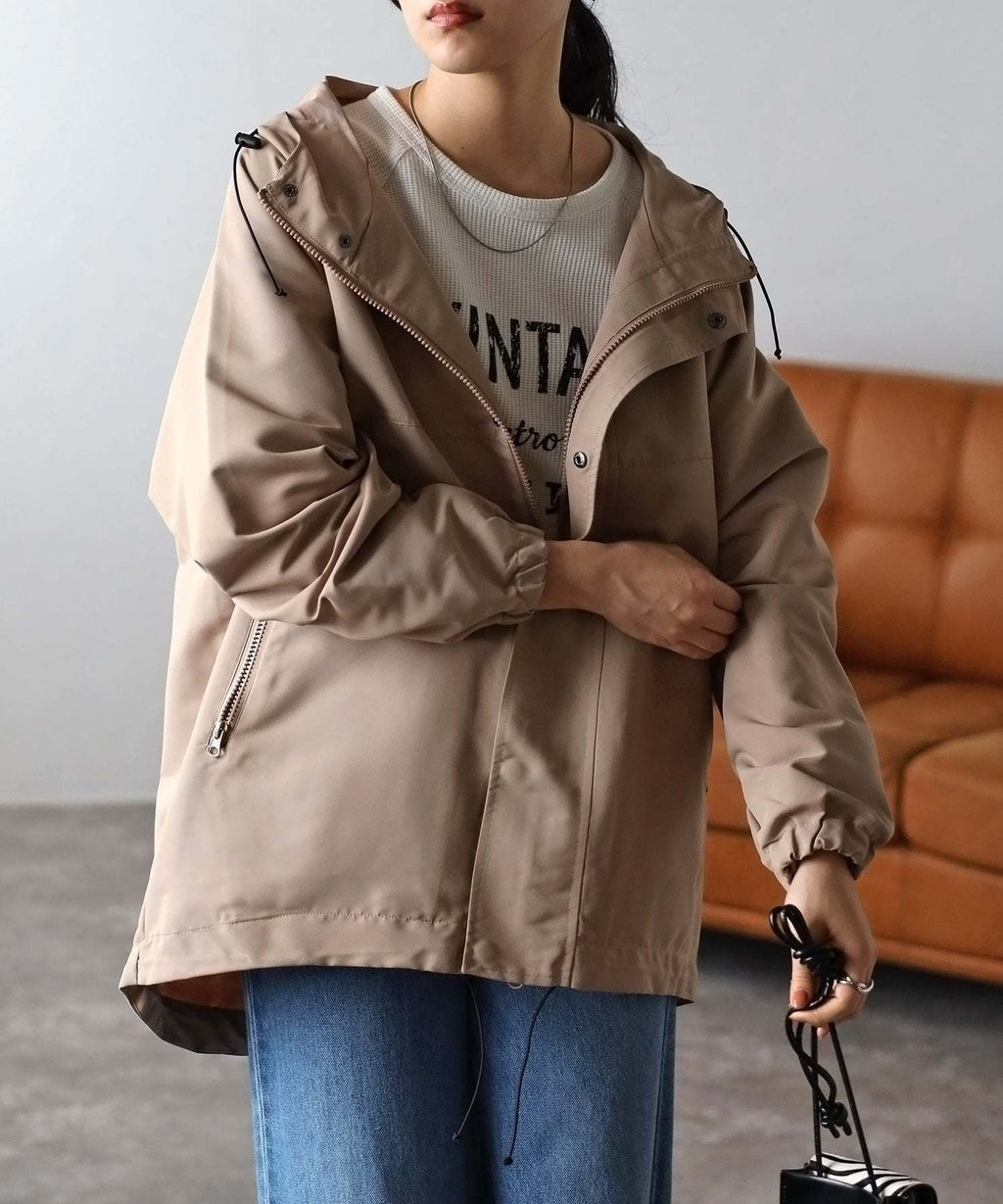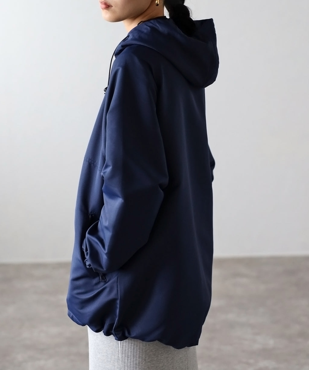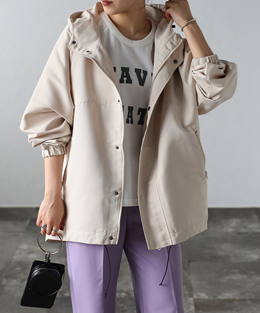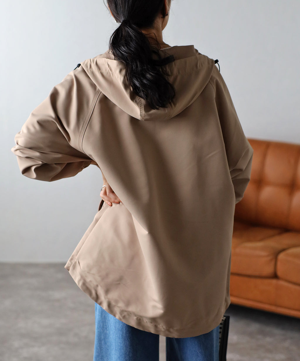 【フード付きマウンテンパーカー】◆季節の変わり目に活躍するライトアウター◆《ディテール》腰周りをカバーしてくれるミドル丈のマウンテンパーカー。ゆったりとしたラグランスリーブは厚手のトップスもINしやすいのが嬉しいポイントです。後ろ下がりのシルエットが女性らしい雰囲気に。袖口はギャザーになっているので捲りやすく、外気の侵入を防いでくれます。フードと裾はコードを絞ることで広がりを調節可能です。《ファブリック》やわらかく肌触りの良いタスラン ポリエステルを使用。空気を含ませることで軽く、程よく薄手なのが特徴。シワになりにくく耐久性があるのでアウターにぴったりの素材です。嫌なツヤ感がなく、ナチュラルな表情に仕上がるのでカジュアル過ぎずに着こなせます。《スタイリング》どんなコーディネートにも合わせやすいプレーンなデザインです。ゆったりとしたオーバーサイジングはタイトなボトムとの相性抜群。毎日のお出掛けにさっと羽織れて便利な一枚です。