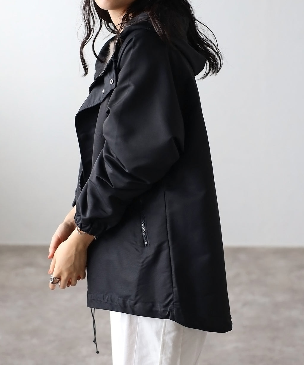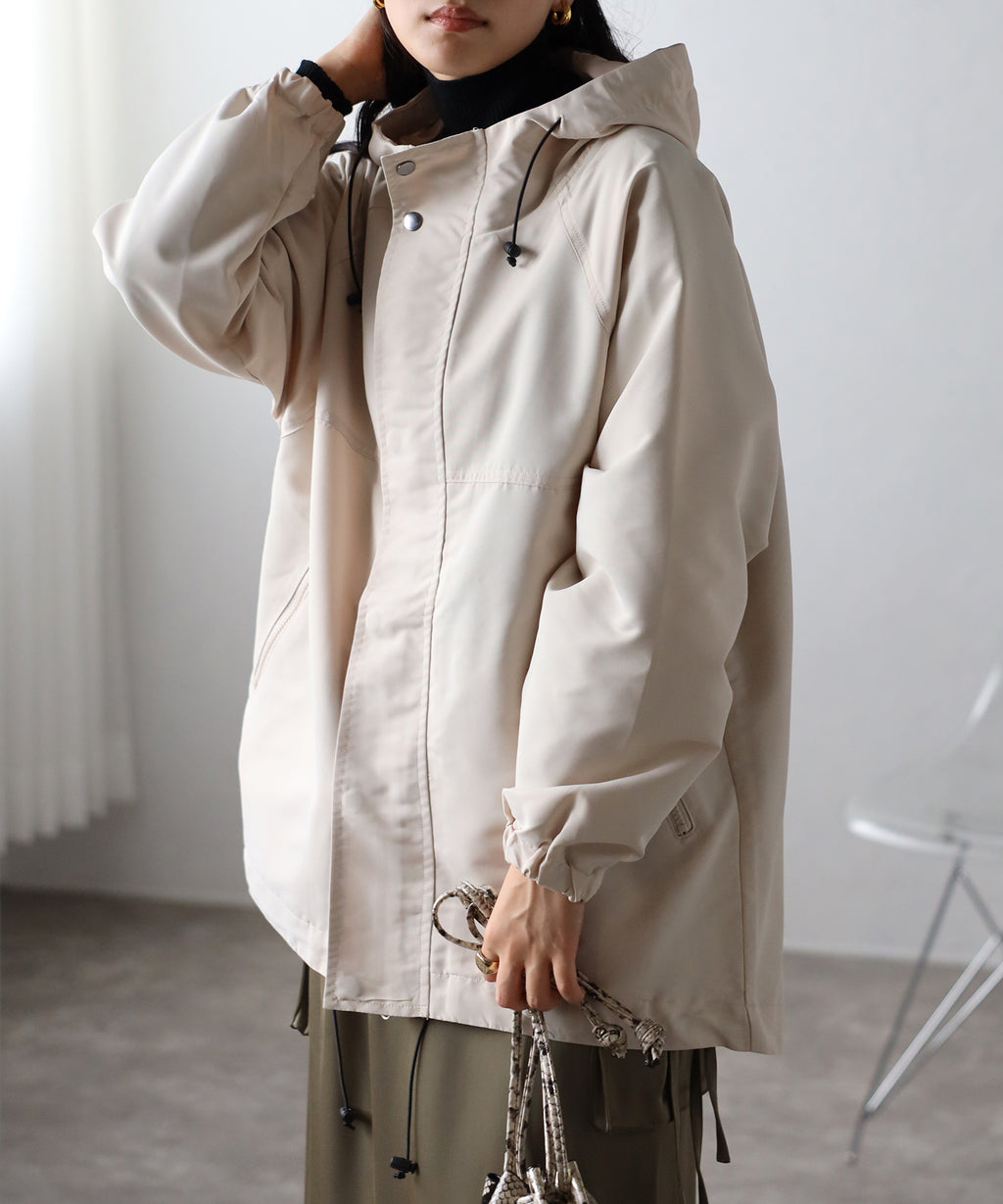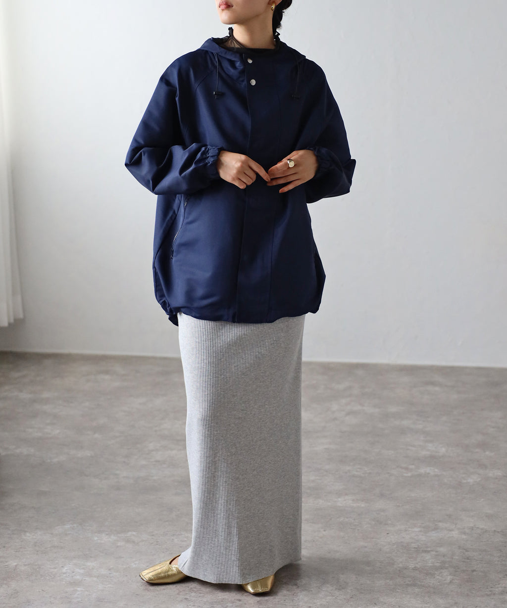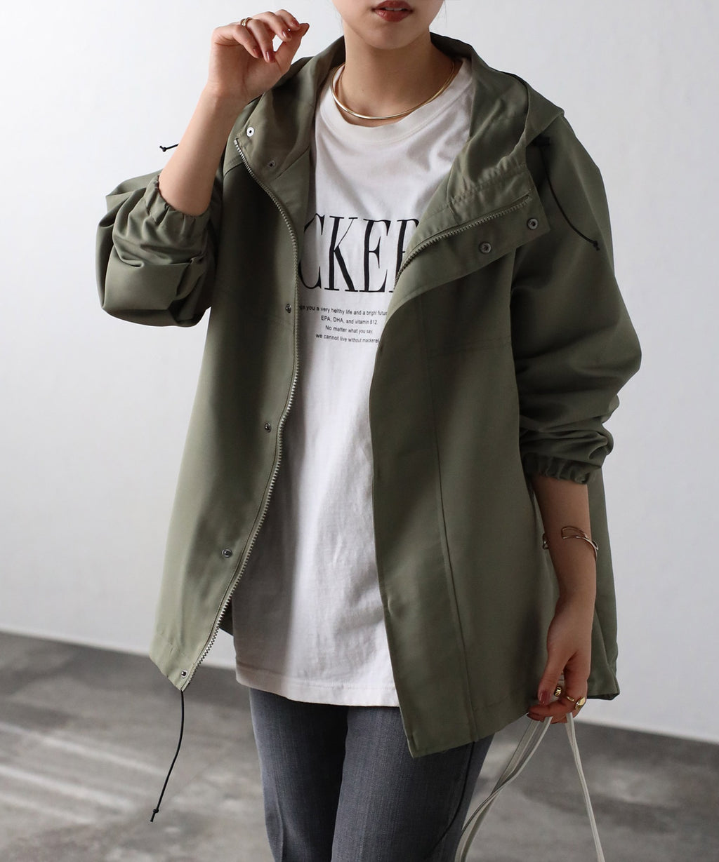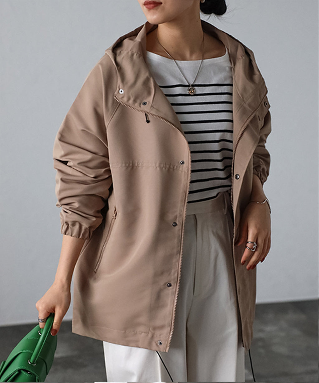 【フード付きマウンテンパーカー】◆季節の変わり目に活躍するライトアウター◆《ディテール》腰周りをカバーしてくれるミドル丈のマウンテンパーカー。ゆったりとしたラグランスリーブは厚手のトップスもINしやすいのが嬉しいポイントです。後ろ下がりのシルエットが女性らしい雰囲気に。袖口はギャザーになっているので捲りやすく、外気の侵入を防いでくれます。フードと裾はコードを絞ることで広がりを調節可能です。《ファブリック》やわらかく肌触りの良いタスラン ポリエステルを使用。空気を含ませることで軽く、程よく薄手なのが特徴。シワになりにくく耐久性があるのでアウターにぴったりの素材です。嫌なツヤ感がなく、ナチュラルな表情に仕上がるのでカジュアル過ぎずに着こなせます。《スタイリング》どんなコーディネートにも合わせやすいプレーンなデザインです。ゆったりとしたオーバーサイジングはタイトなボトムとの相性抜群。毎日のお出掛けにさっと羽織れて便利な一枚です。
