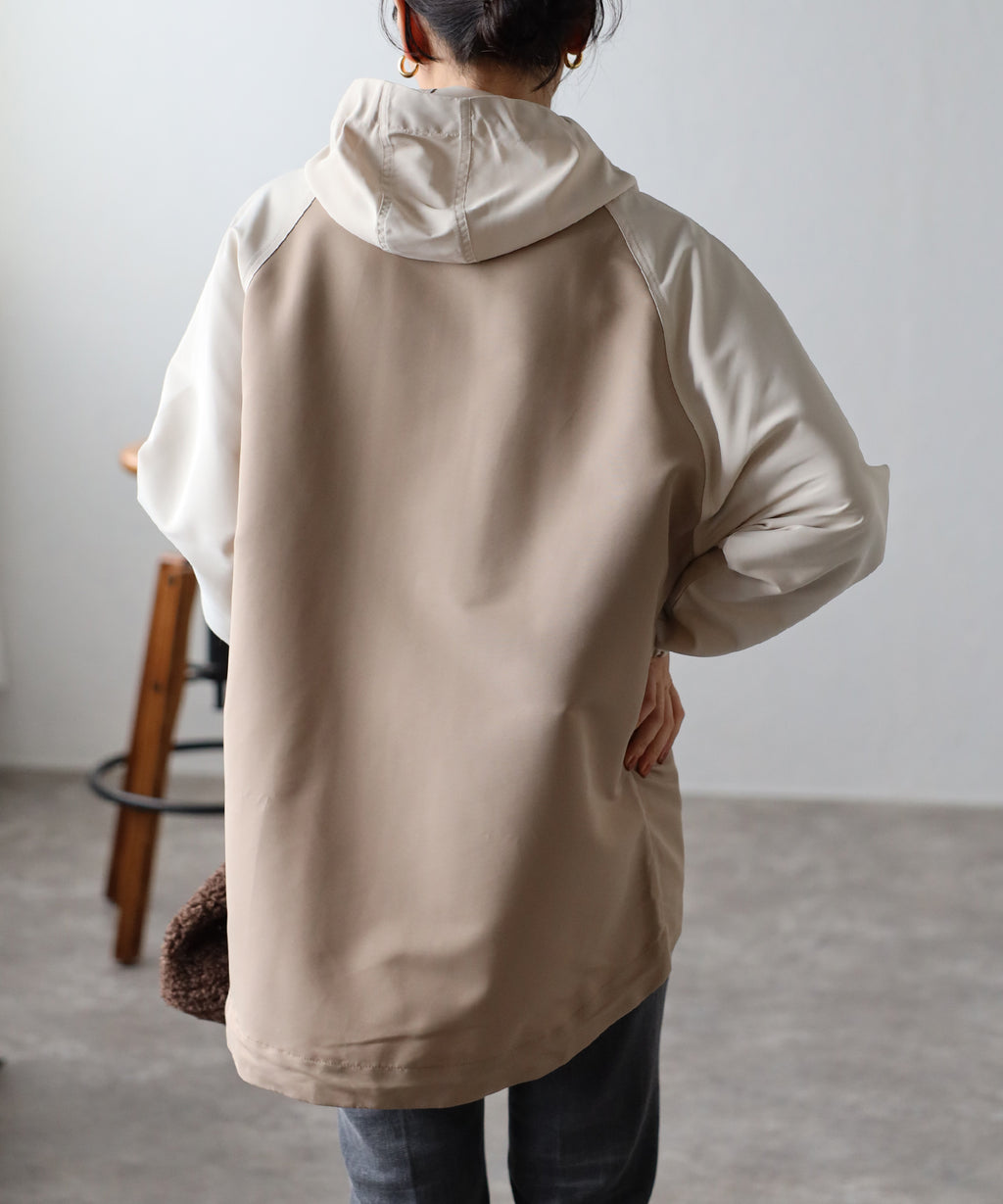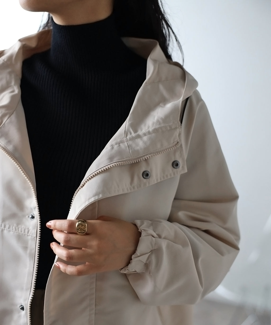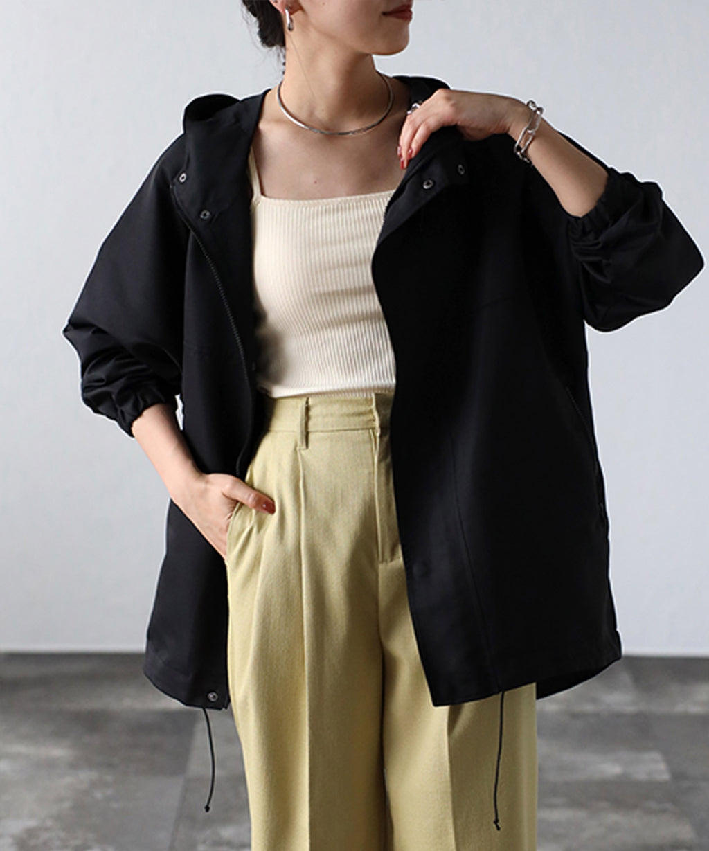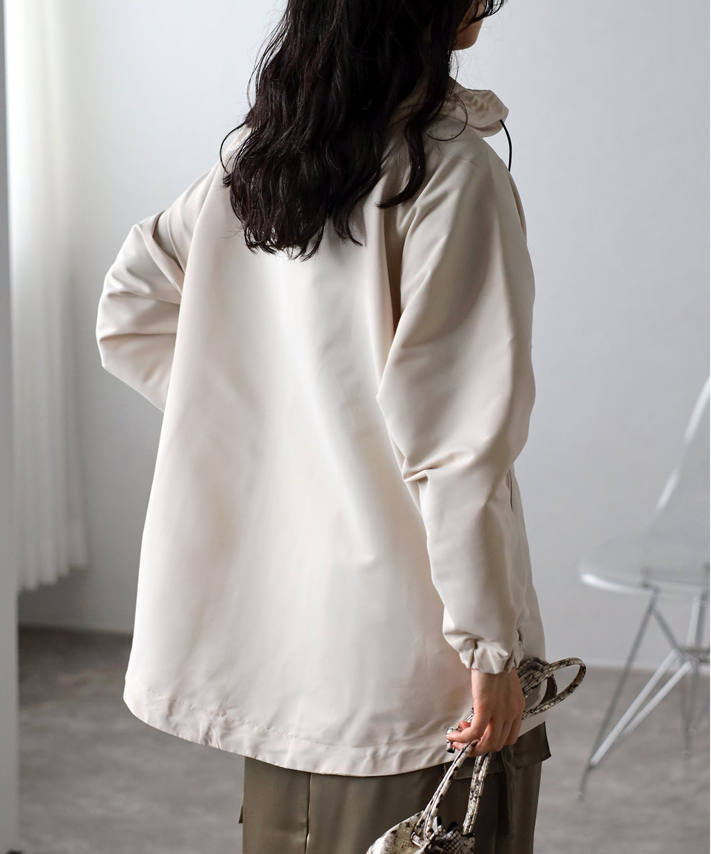 【フード付きマウンテンパーカー】◆季節の変わり目に活躍するライトアウター◆《ディテール》腰周りをカバーしてくれるミドル丈のマウンテンパーカー。ゆったりとしたラグランスリーブは厚手のトップスもINしやすいのが嬉しいポイントです。後ろ下がりのシルエットが女性らしい雰囲気に。袖口はギャザーになっているので捲りやすく、外気の侵入を防いでくれます。フードと裾はコードを絞ることで広がりを調節可能です。《ファブリック》やわらかく肌触りの良いタスラン ポリエステルを使用。空気を含ませることで軽く、程よく薄手なのが特徴。シワになりにくく耐久性があるのでアウターにぴったりの素材です。嫌なツヤ感がなく、ナチュラルな表情に仕上がるのでカジュアル過ぎずに着こなせます。《スタイリング》どんなコーディネートにも合わせやすいプレーンなデザインです。ゆったりとしたオーバーサイジングはタイトなボトムとの相性抜群。毎日のお出掛けにさっと羽織れて便利な一枚です。