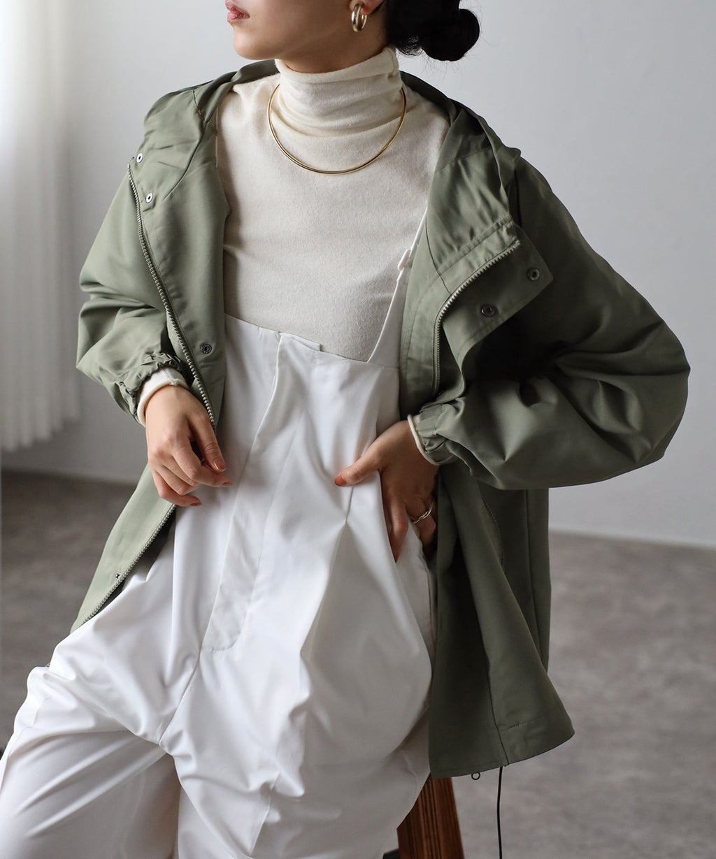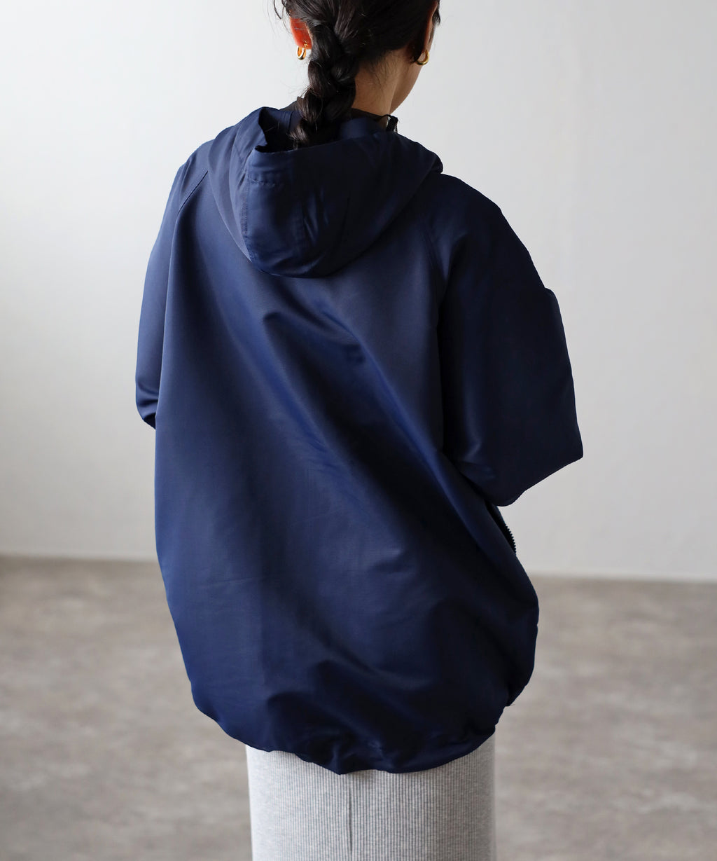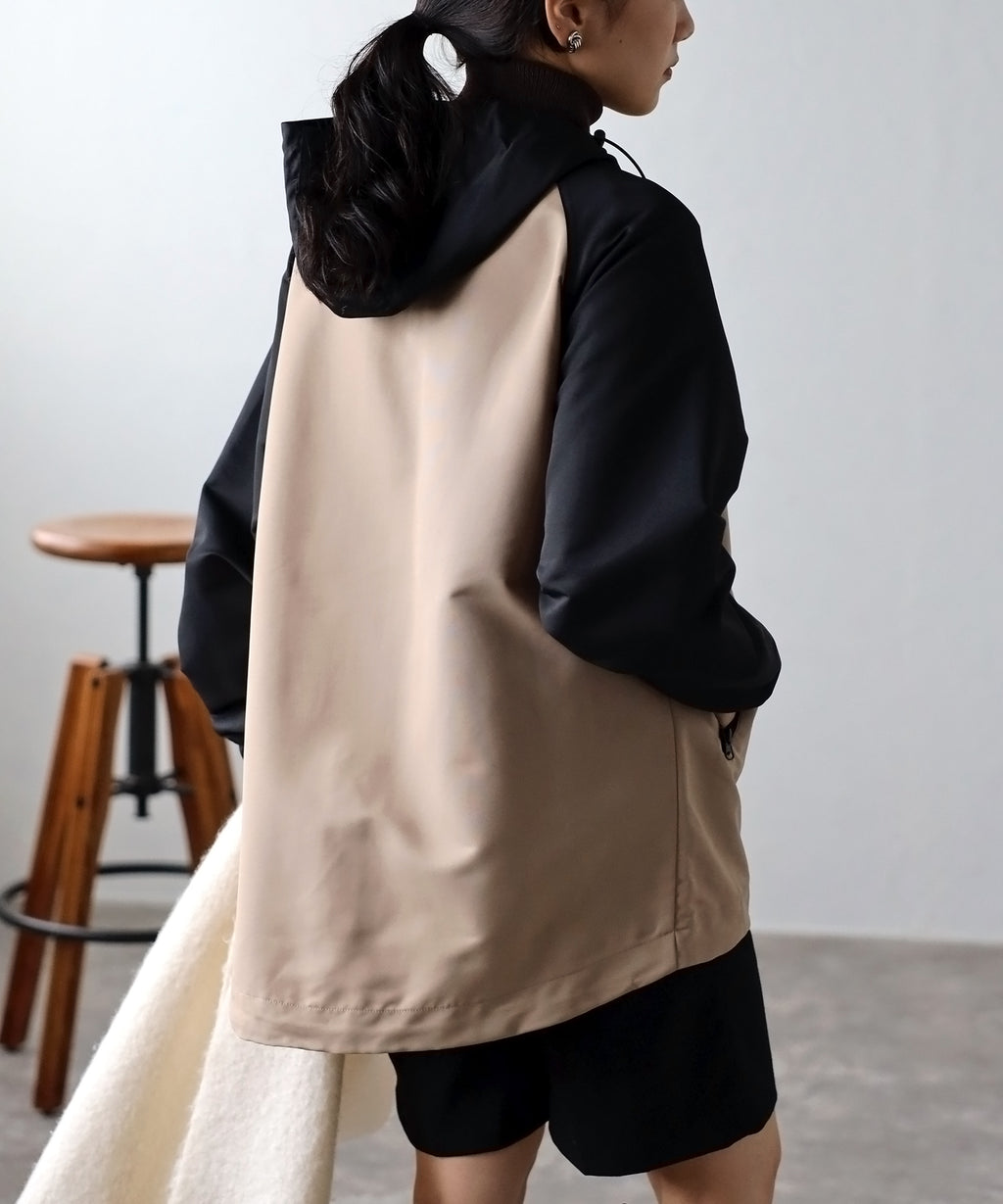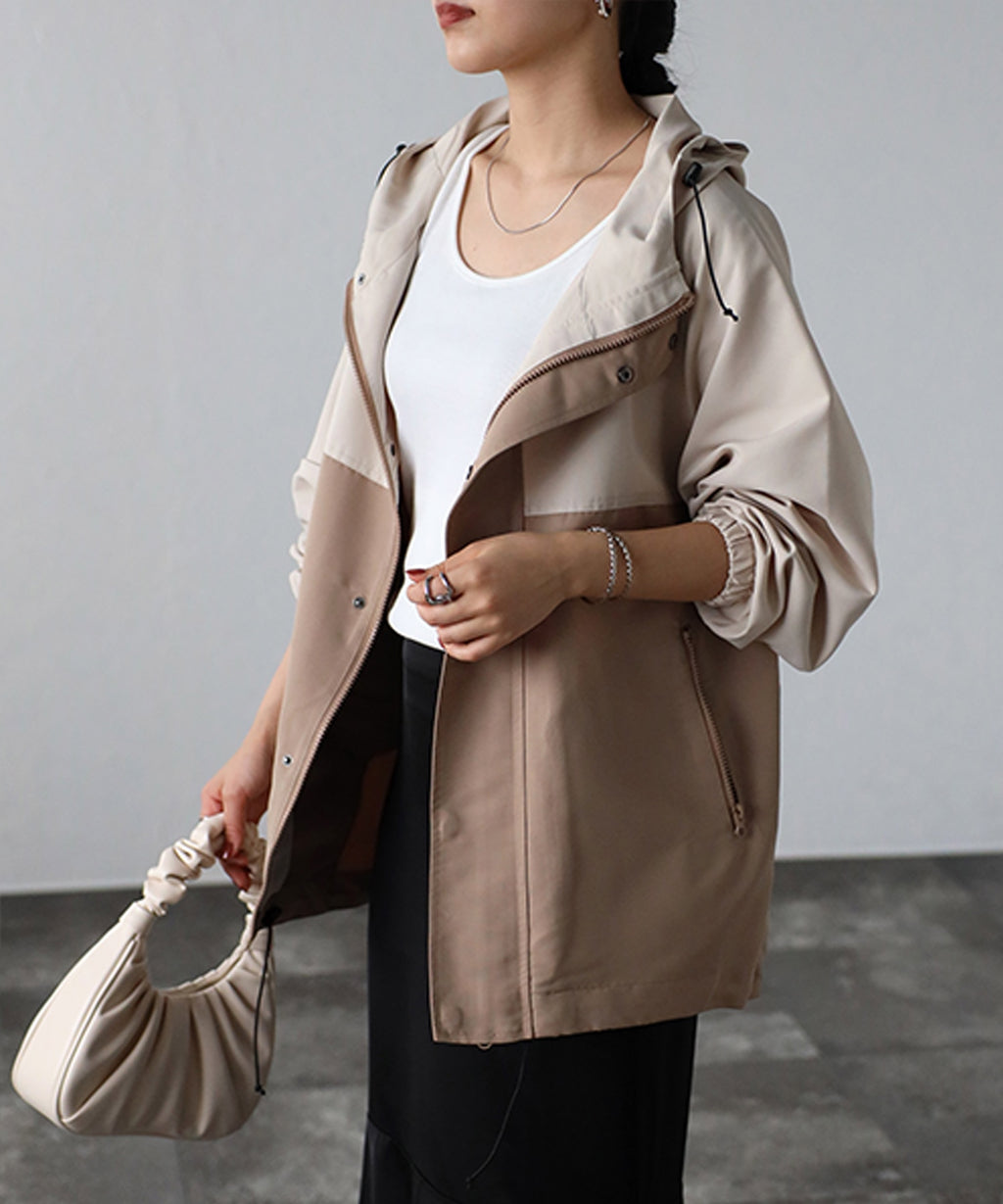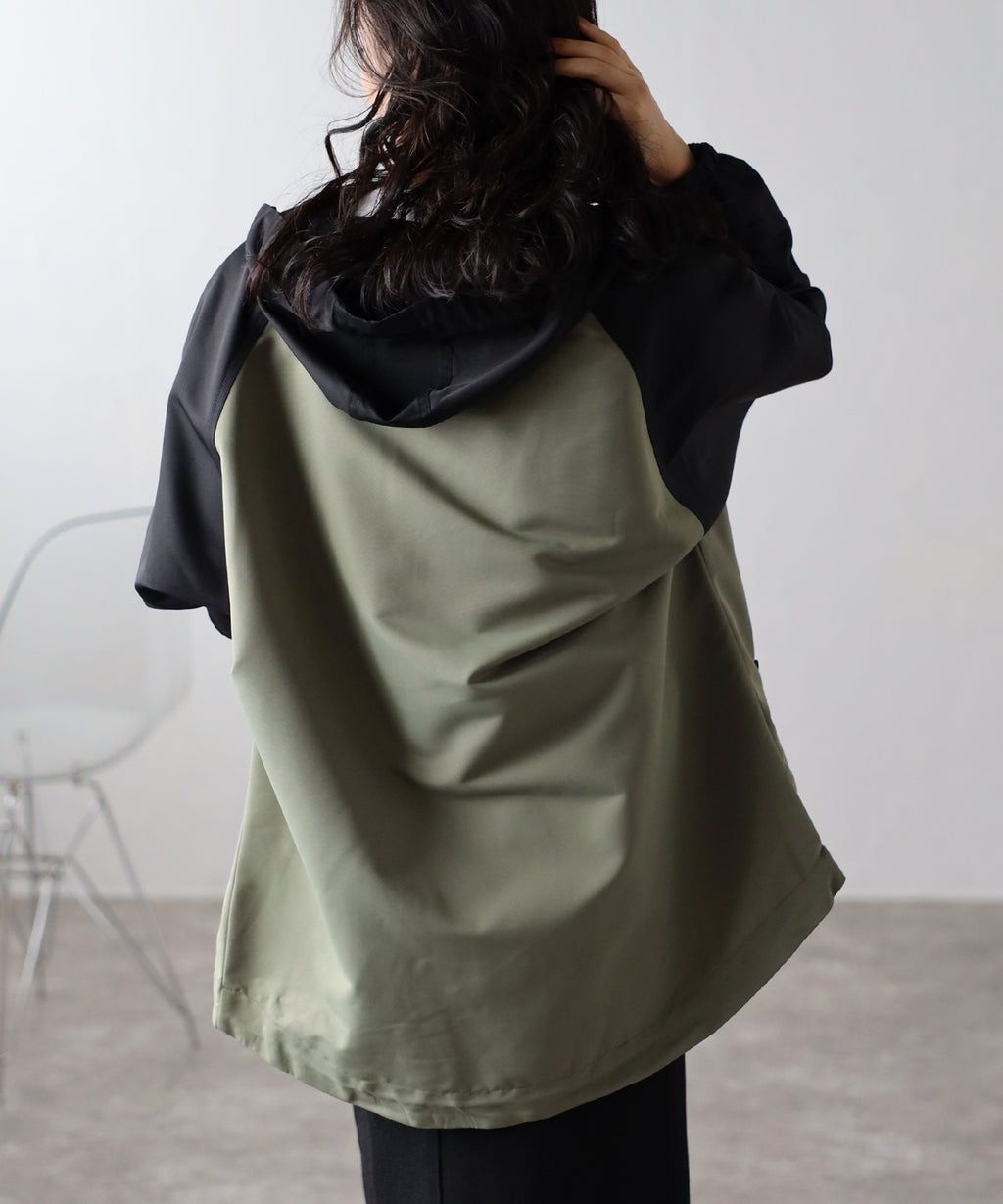【フード付きマウンテンパーカー】◆季節の変わり目に活躍するライトアウター◆《ディテール》腰周りをカバーしてくれるミドル丈のマウンテンパーカー。ゆったりとしたラグランスリーブは厚手のトップスもINしやすいのが嬉しいポイントです。後ろ下がりのシルエットが女性らしい雰囲気に。袖口はギャザーになっているので捲りやすく、外気の侵入を防いでくれます。フードと裾はコードを絞ることで広がりを調節可能です。《ファブリック》やわらかく肌触りの良いタスラン ポリエステルを使用。空気を含ませることで軽く、程よく薄手なのが特徴。シワになりにくく耐久性があるのでアウターにぴったりの素材です。嫌なツヤ感がなく、ナチュラルな表情に仕上がるのでカジュアル過ぎずに着こなせます。《スタイリング》どんなコーディネートにも合わせやすいプレーンなデザインです。ゆったりとしたオーバーサイジングはタイトなボトムとの相性抜群。毎日のお出掛けにさっと羽織れて便利な一枚です。