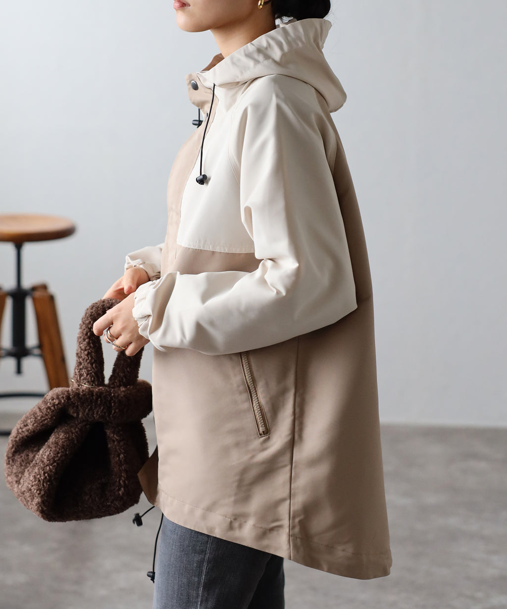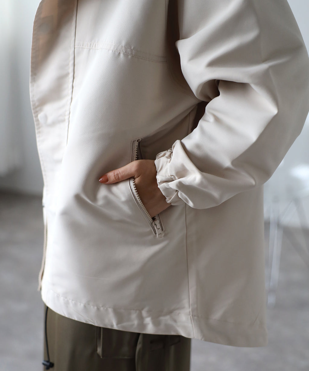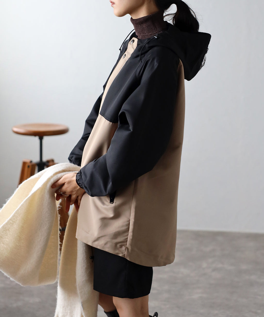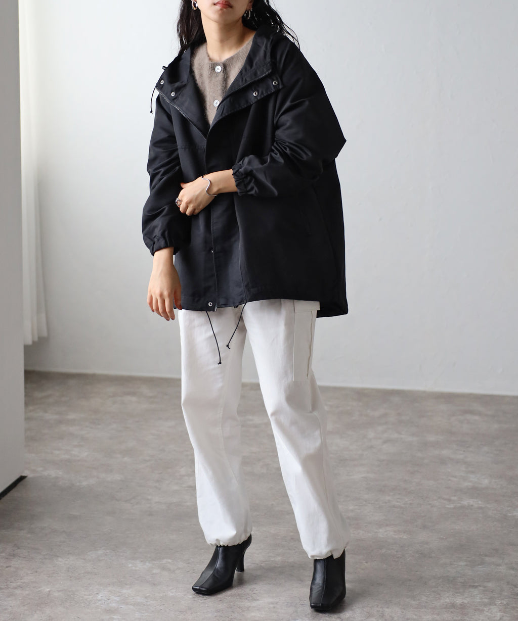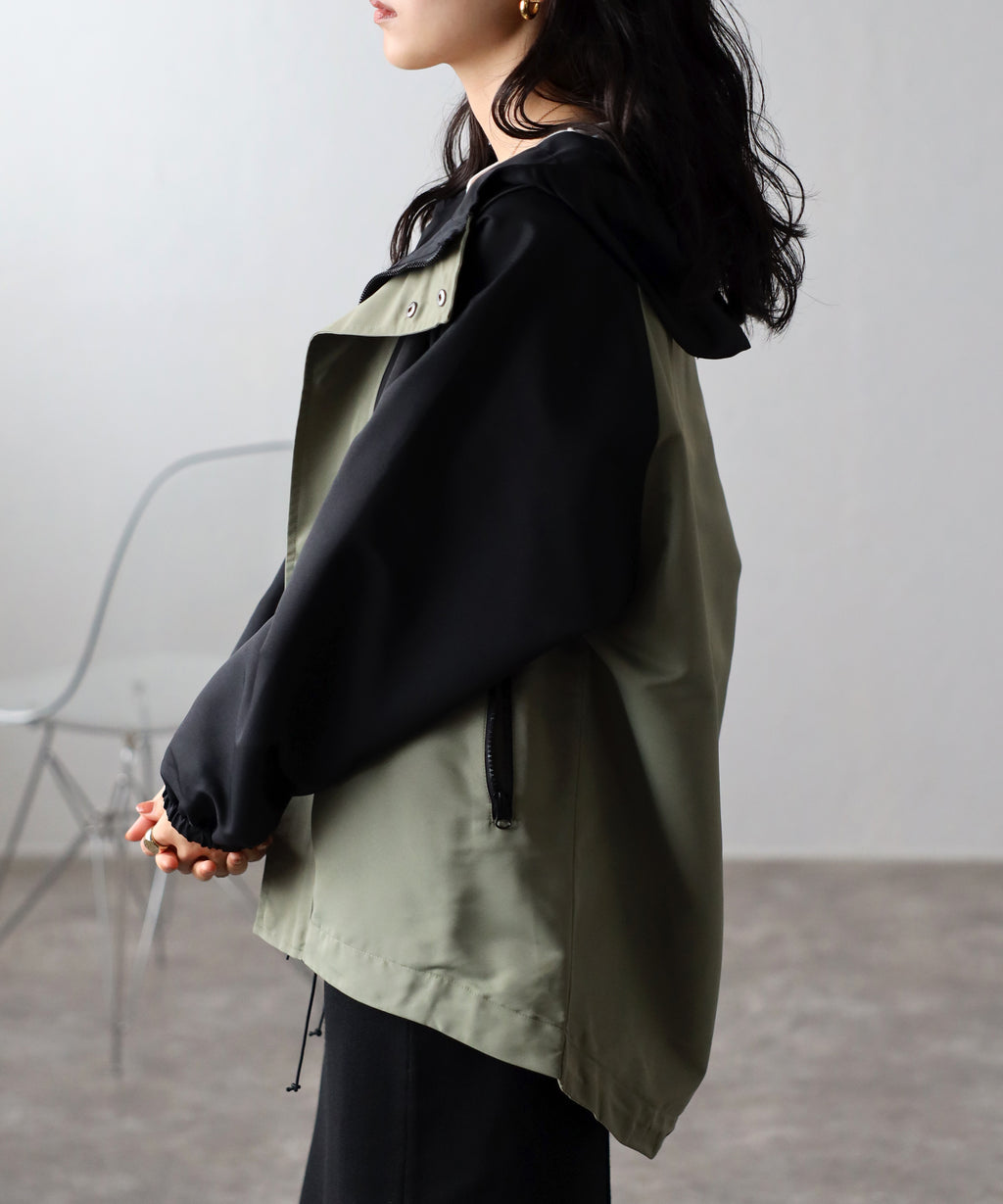 【フード付きマウンテンパーカー】◆季節の変わり目に活躍するライトアウター◆《ディテール》腰周りをカバーしてくれるミドル丈のマウンテンパーカー。ゆったりとしたラグランスリーブは厚手のトップスもINしやすいのが嬉しいポイントです。後ろ下がりのシルエットが女性らしい雰囲気に。袖口はギャザーになっているので捲りやすく、外気の侵入を防いでくれます。フードと裾はコードを絞ることで広がりを調節可能です。《ファブリック》やわらかく肌触りの良いタスラン ポリエステルを使用。空気を含ませることで軽く、程よく薄手なのが特徴。シワになりにくく耐久性があるのでアウターにぴったりの素材です。嫌なツヤ感がなく、ナチュラルな表情に仕上がるのでカジュアル過ぎずに着こなせます。《スタイリング》どんなコーディネートにも合わせやすいプレーンなデザインです。ゆったりとしたオーバーサイジングはタイトなボトムとの相性抜群。毎日のお出掛けにさっと羽織れて便利な一枚です。