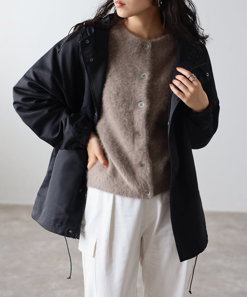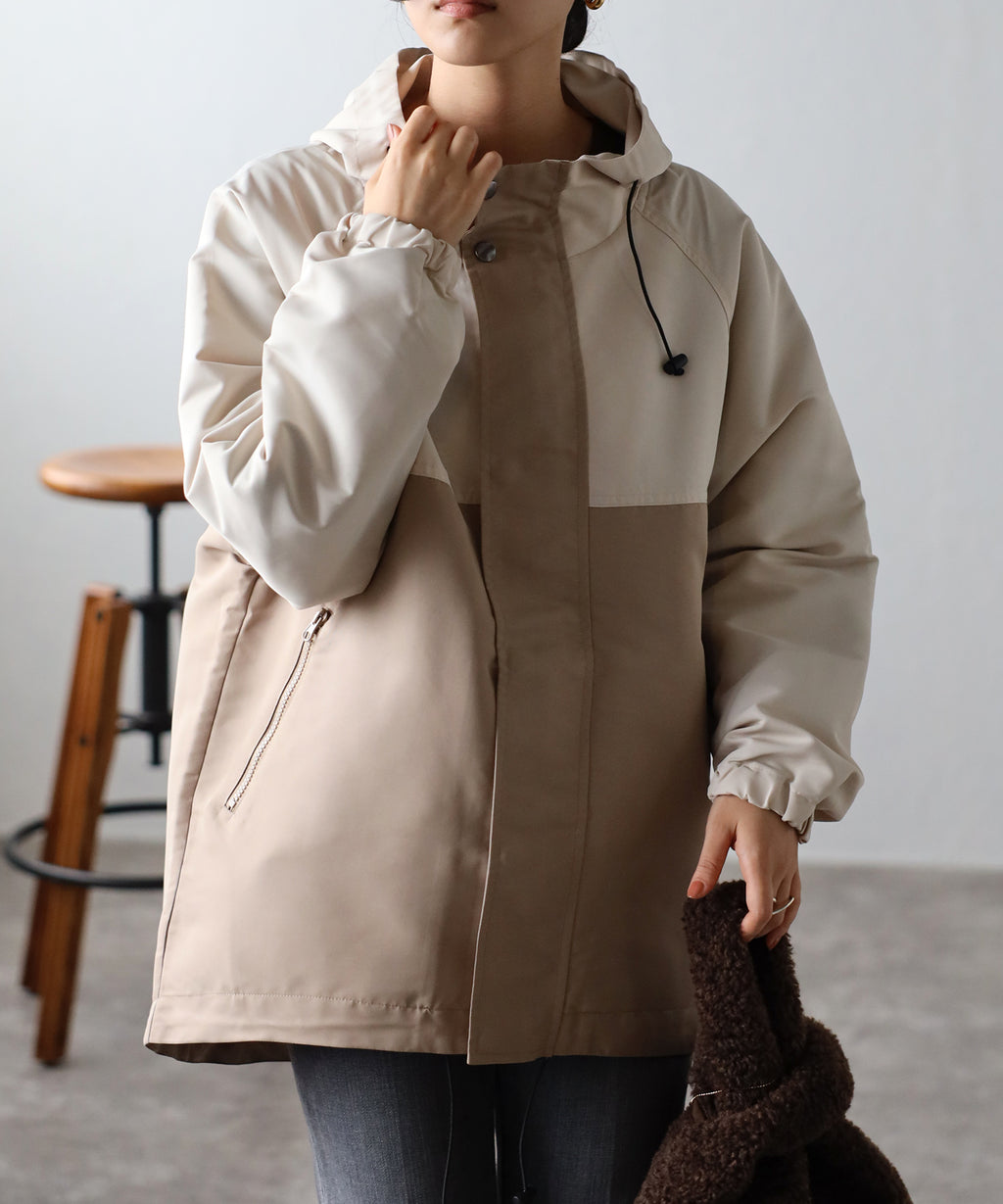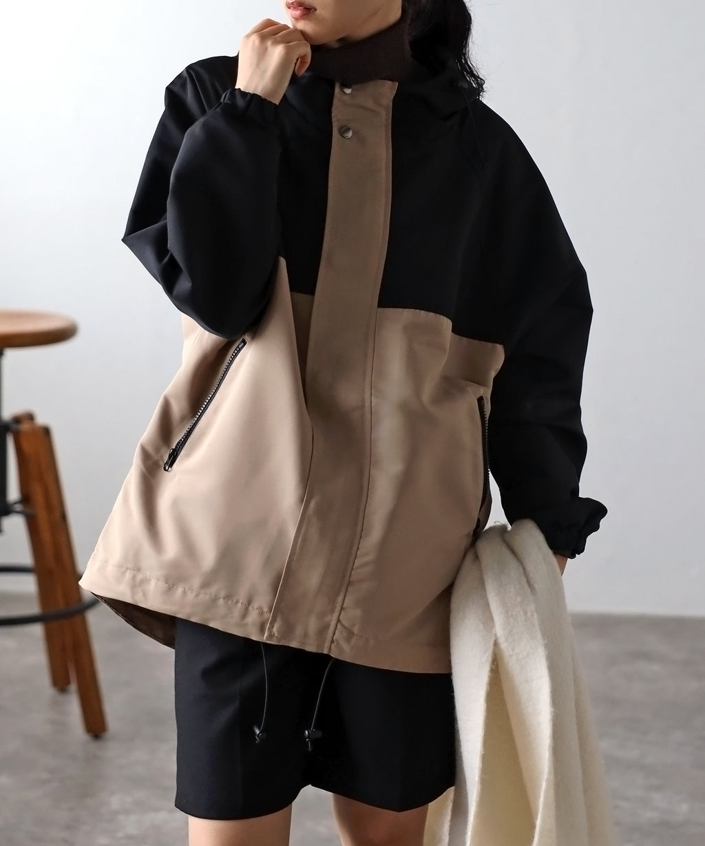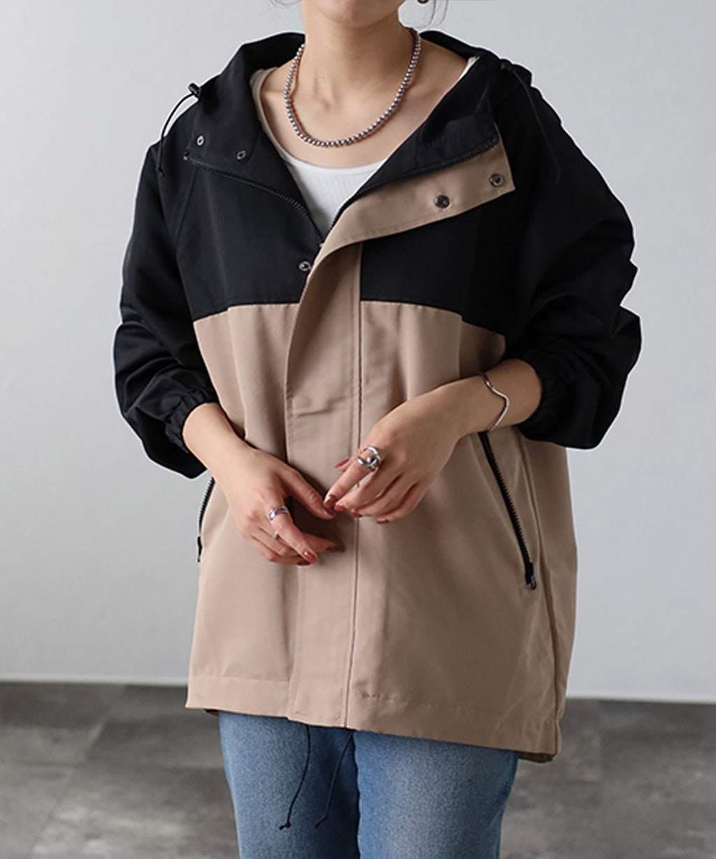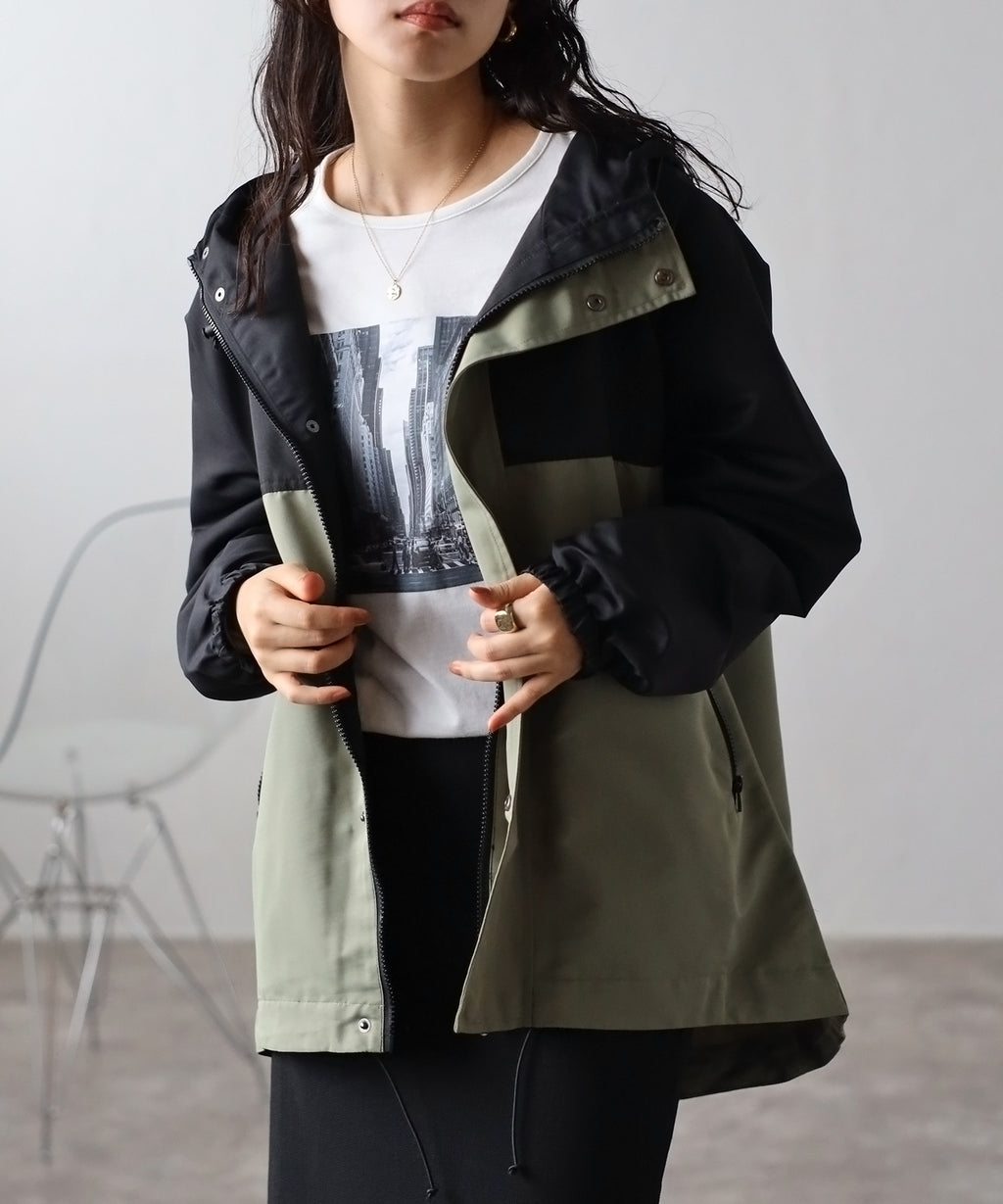 【フード付きマウンテンパーカー】◆季節の変わり目に活躍するライトアウター◆《ディテール》腰周りをカバーしてくれるミドル丈のマウンテンパーカー。ゆったりとしたラグランスリーブは厚手のトップスもINしやすいのが嬉しいポイントです。後ろ下がりのシルエットが女性らしい雰囲気に。袖口はギャザーになっているので捲りやすく、外気の侵入を防いでくれます。フードと裾はコードを絞ることで広がりを調節可能です。《ファブリック》やわらかく肌触りの良いタスラン ポリエステルを使用。空気を含ませることで軽く、程よく薄手なのが特徴。シワになりにくく耐久性があるのでアウターにぴったりの素材です。嫌なツヤ感がなく、ナチュラルな表情に仕上がるのでカジュアル過ぎずに着こなせます。《スタイリング》どんなコーディネートにも合わせやすいプレーンなデザインです。ゆったりとしたオーバーサイジングはタイトなボトムとの相性抜群。毎日のお出掛けにさっと羽織れて便利な一枚です。