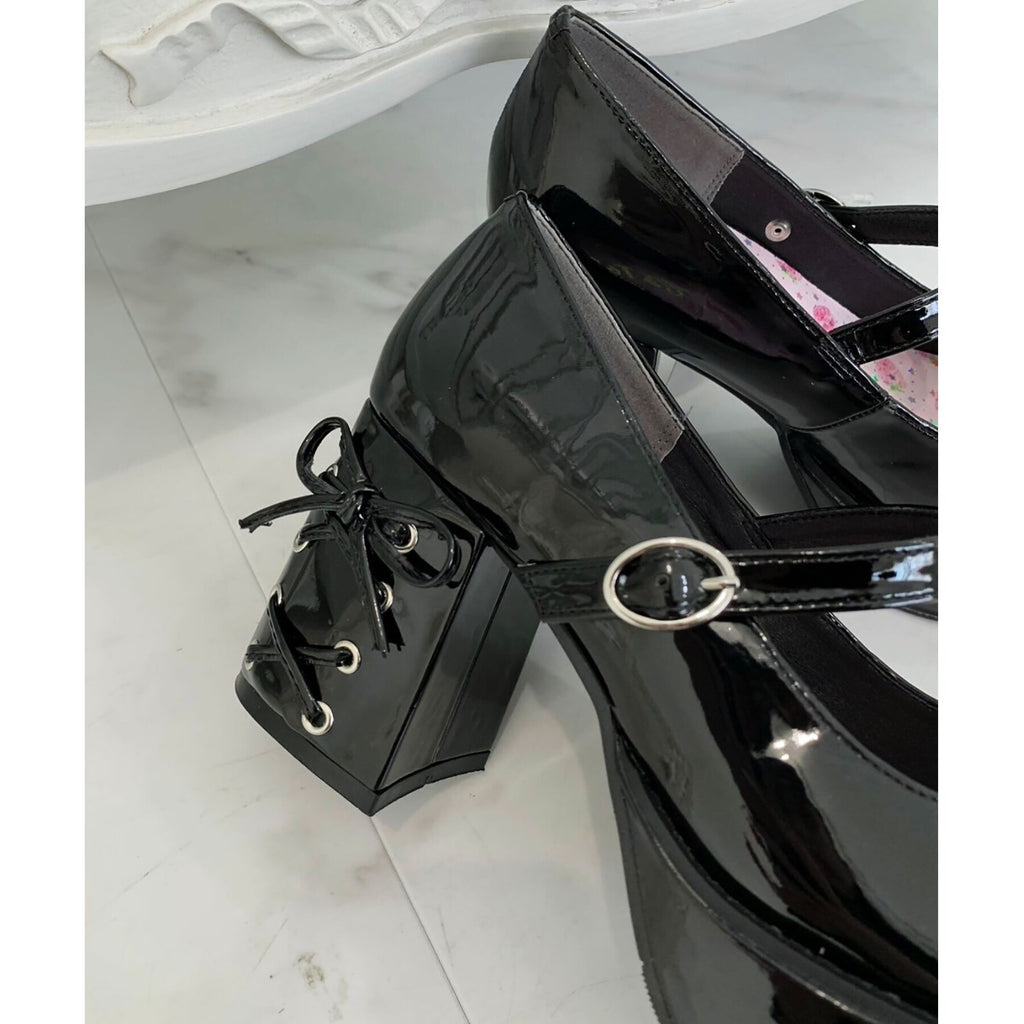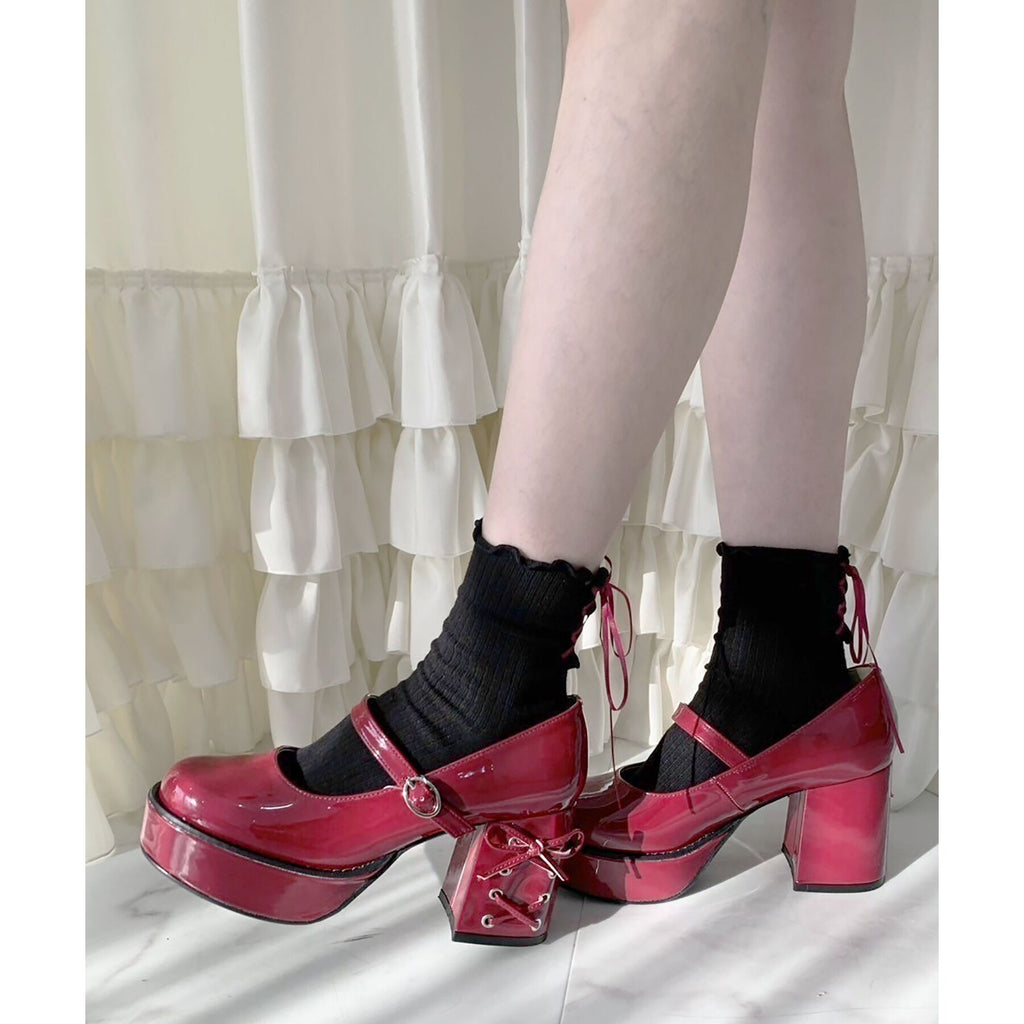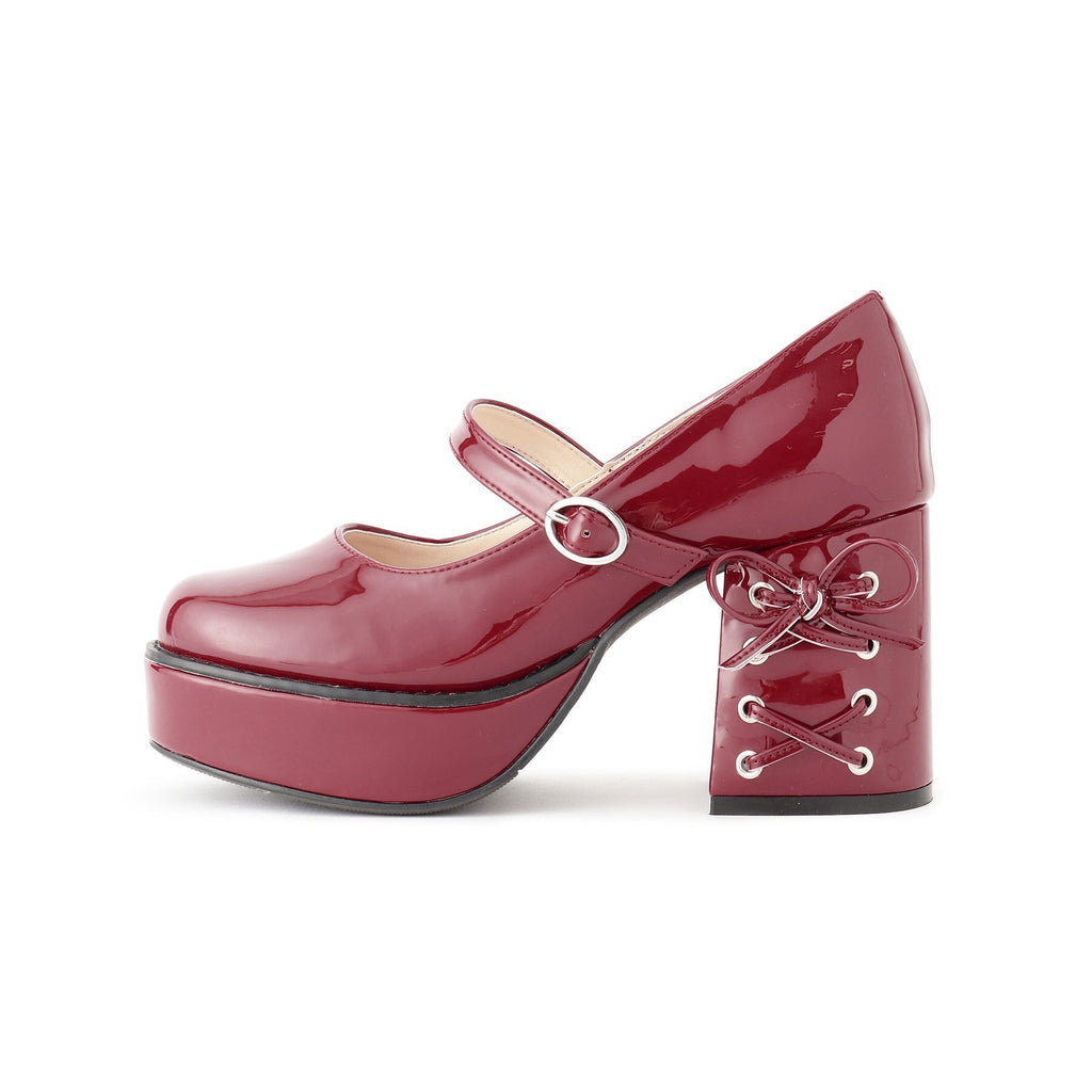 太めヒールのサイドにレースアップデザインがついているガーリーパンプス☆