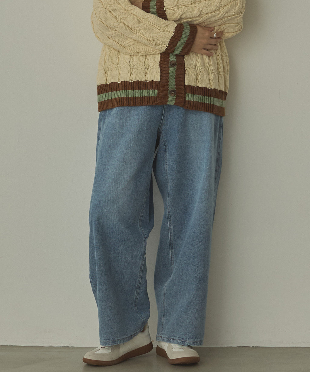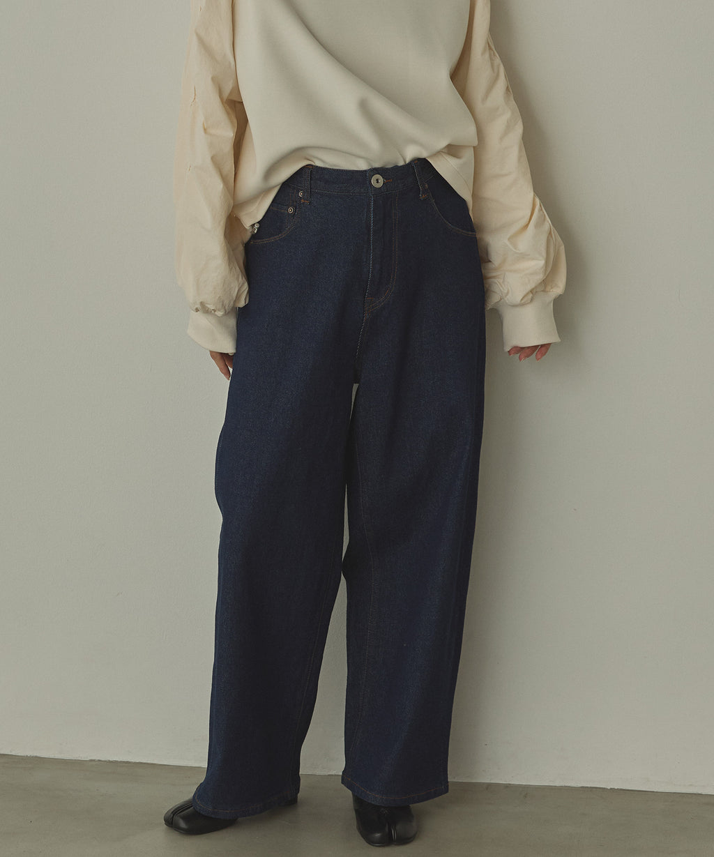 ゆったりとしたサイズ感ながらも、前側に寄ったサイドの切り替えが、細くきれいなシルエットに見せてくれます。