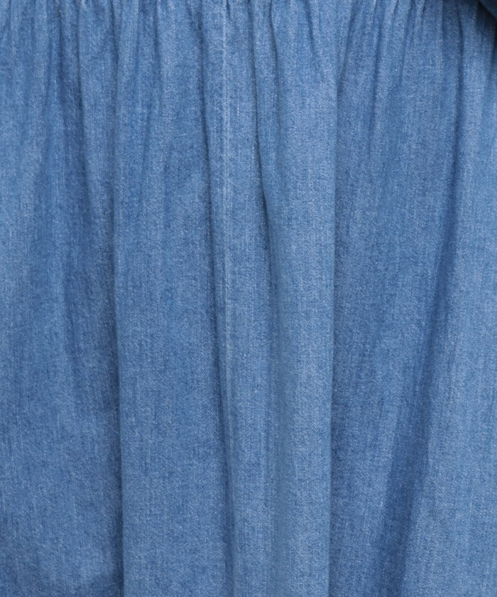 深めのスキッパーネックでヌケ感を演出するデニムワンピース。ウエストの切り替えからボリューミーに広がるヘムラインが女性らしくて◎。1枚着でもオシャレがキマるからワードローブにあると重宝します。